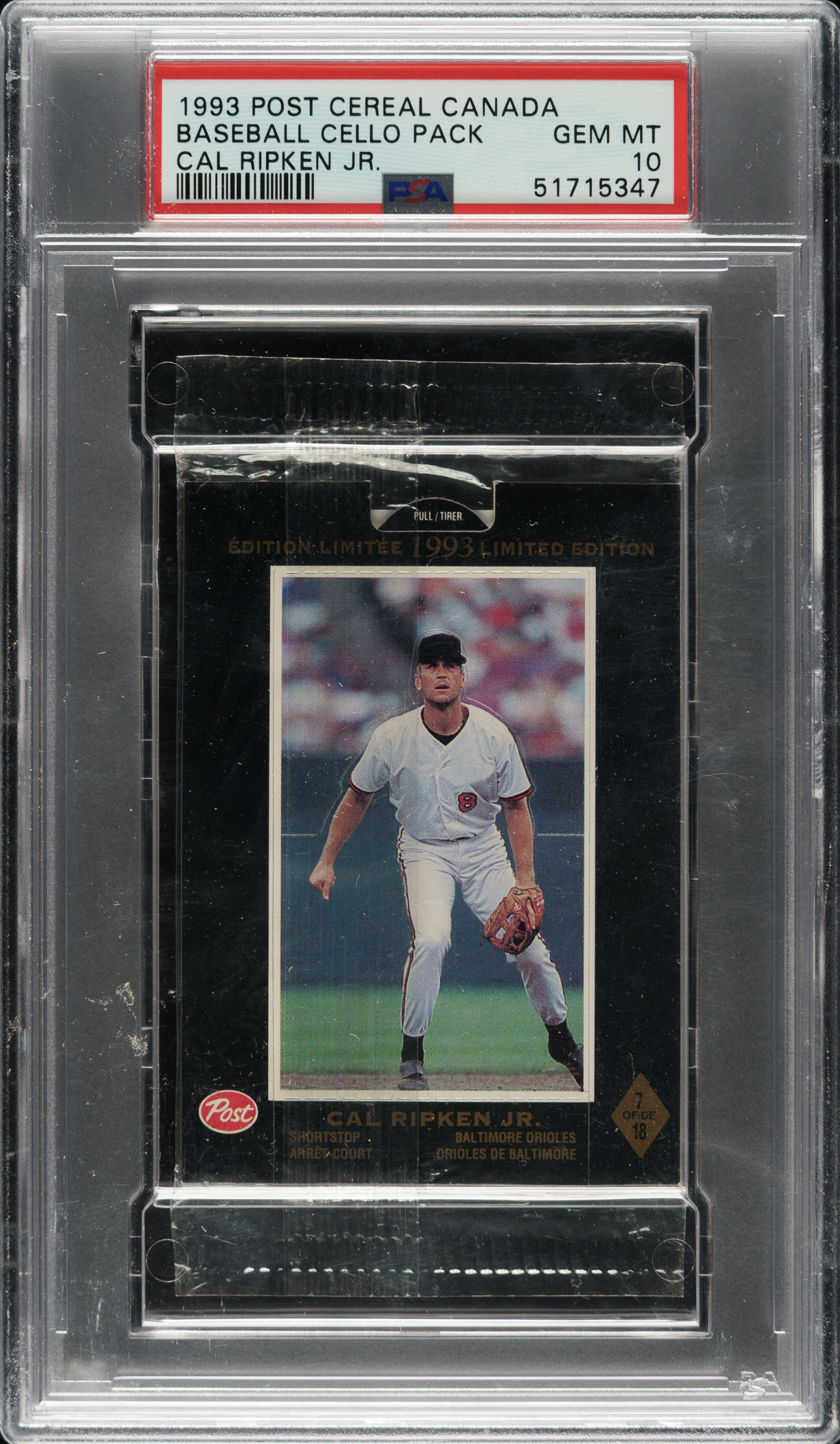 Lot # 2764: 1993 Post Cereal Canada Unopened Cello Pack PSA GEM MINT 10 - Cal Ripken Jr.
