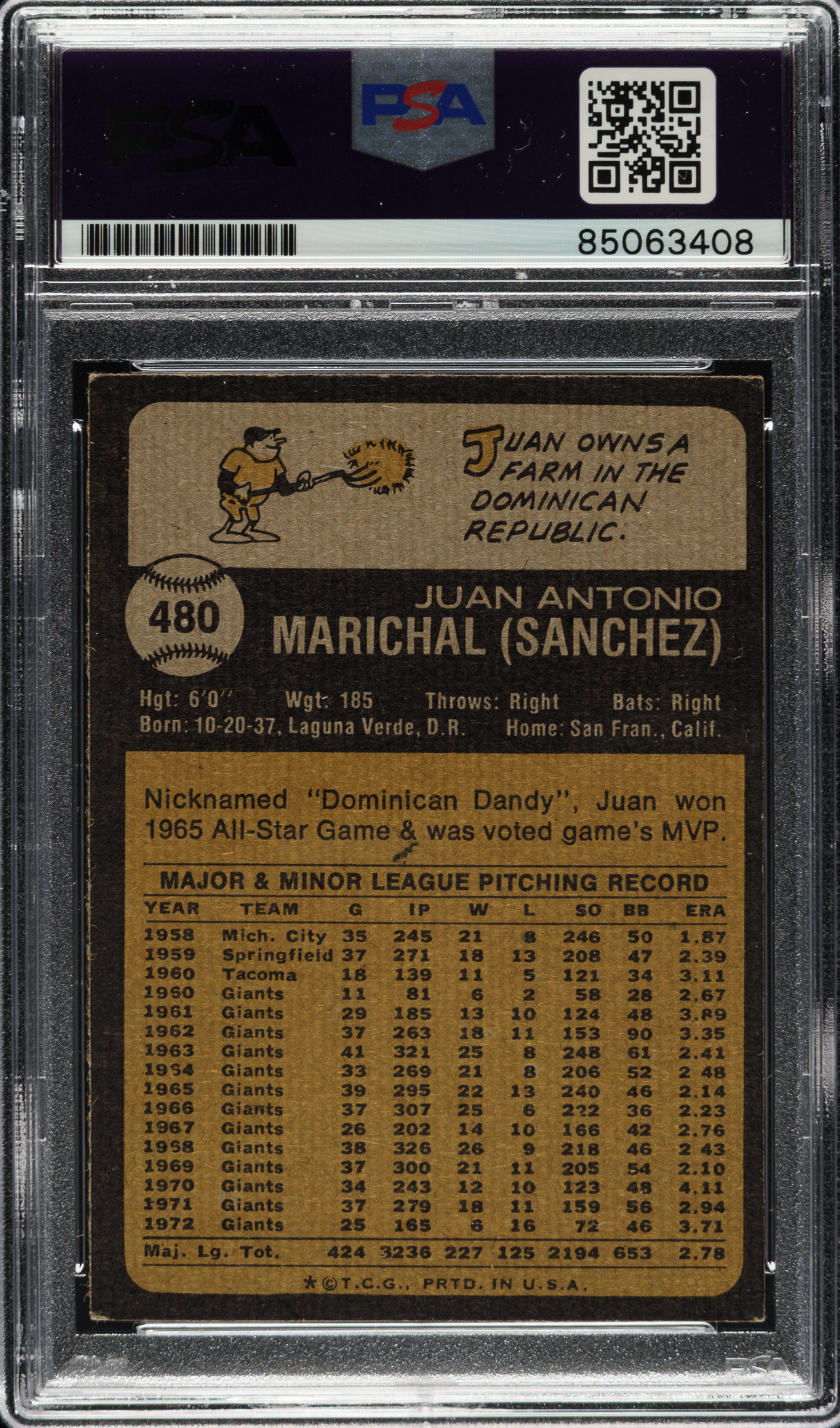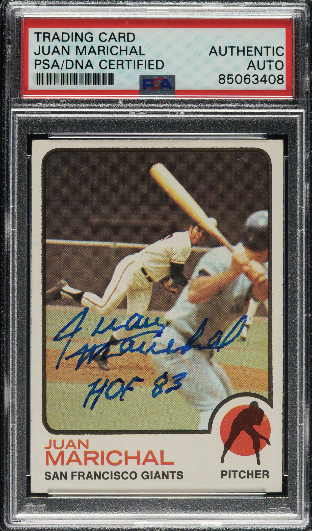 PSA/DNA has encapsulated the card, grading the signature Authentic. San Francisco Giants Hall of Famer Juan Marichal.