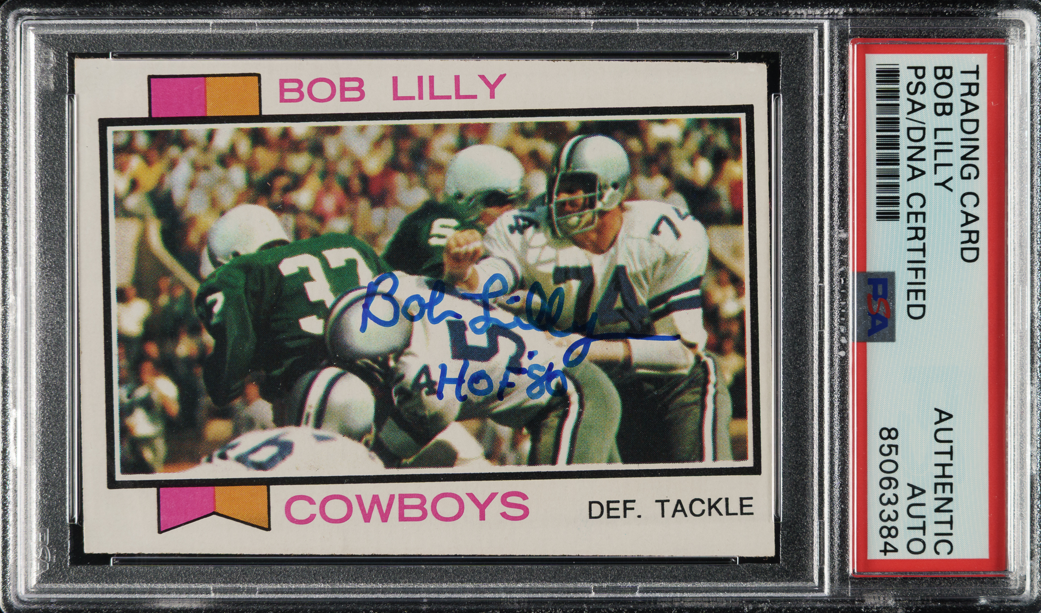 PSA/DNA has encapsulated the card, grading the signature Authentic. Dallas Cowboys football Hall of Famer Bob Lilly.