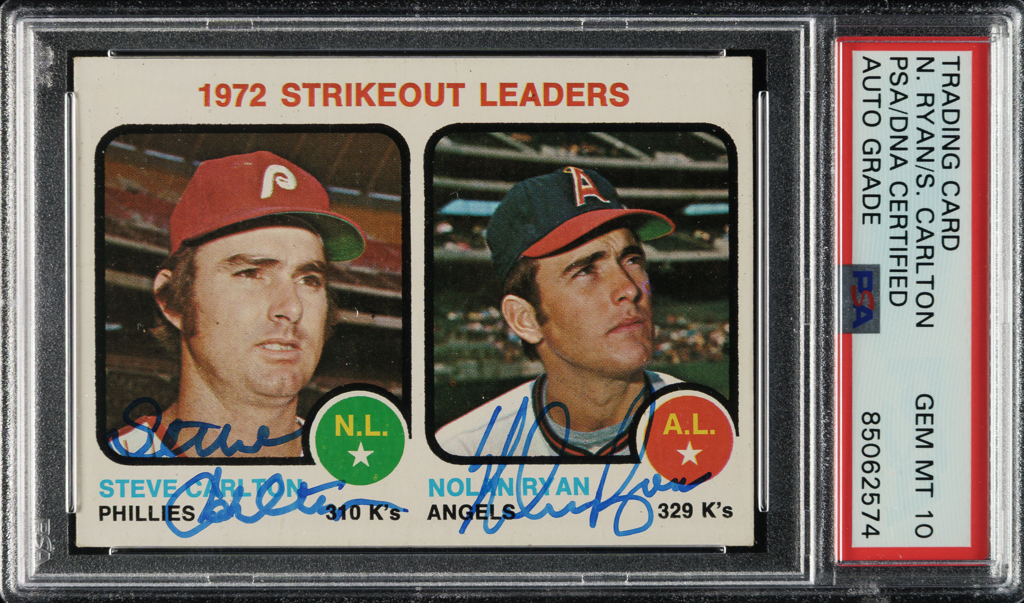 PSA/DNA has encapsulated the card, grading the signatures GEM MINT 10. Philadelphia Phillies and California Angels Hall of Famers Steve Carlton and Nolan Ryan.