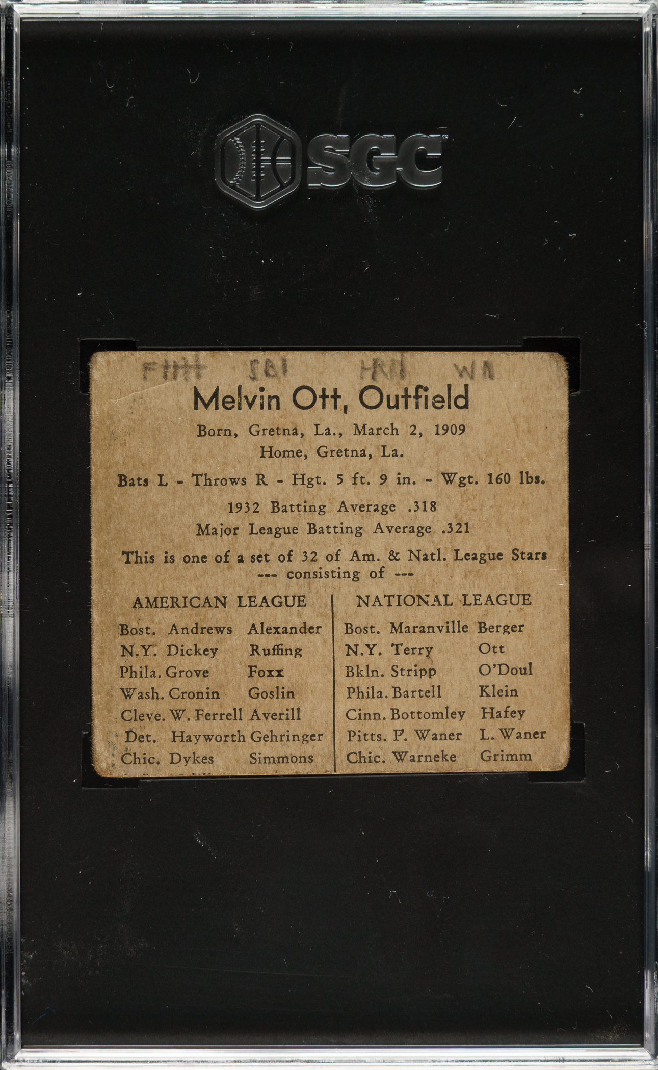 Graded FAIR 1.5 by SGC. New York Giants Hall of Famer Mel Ott.