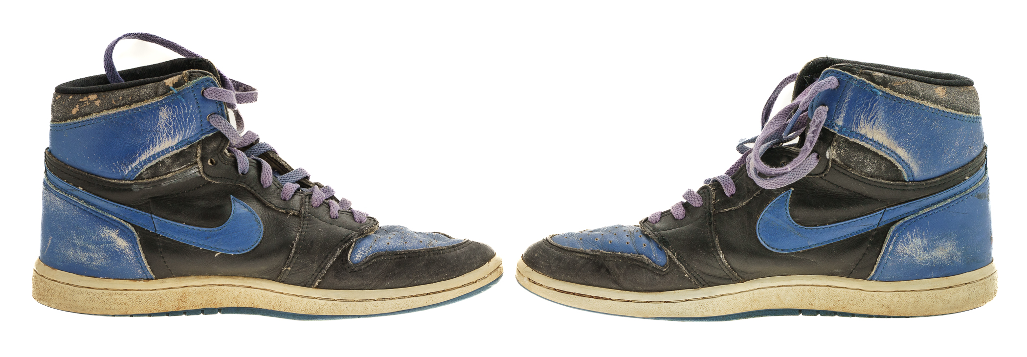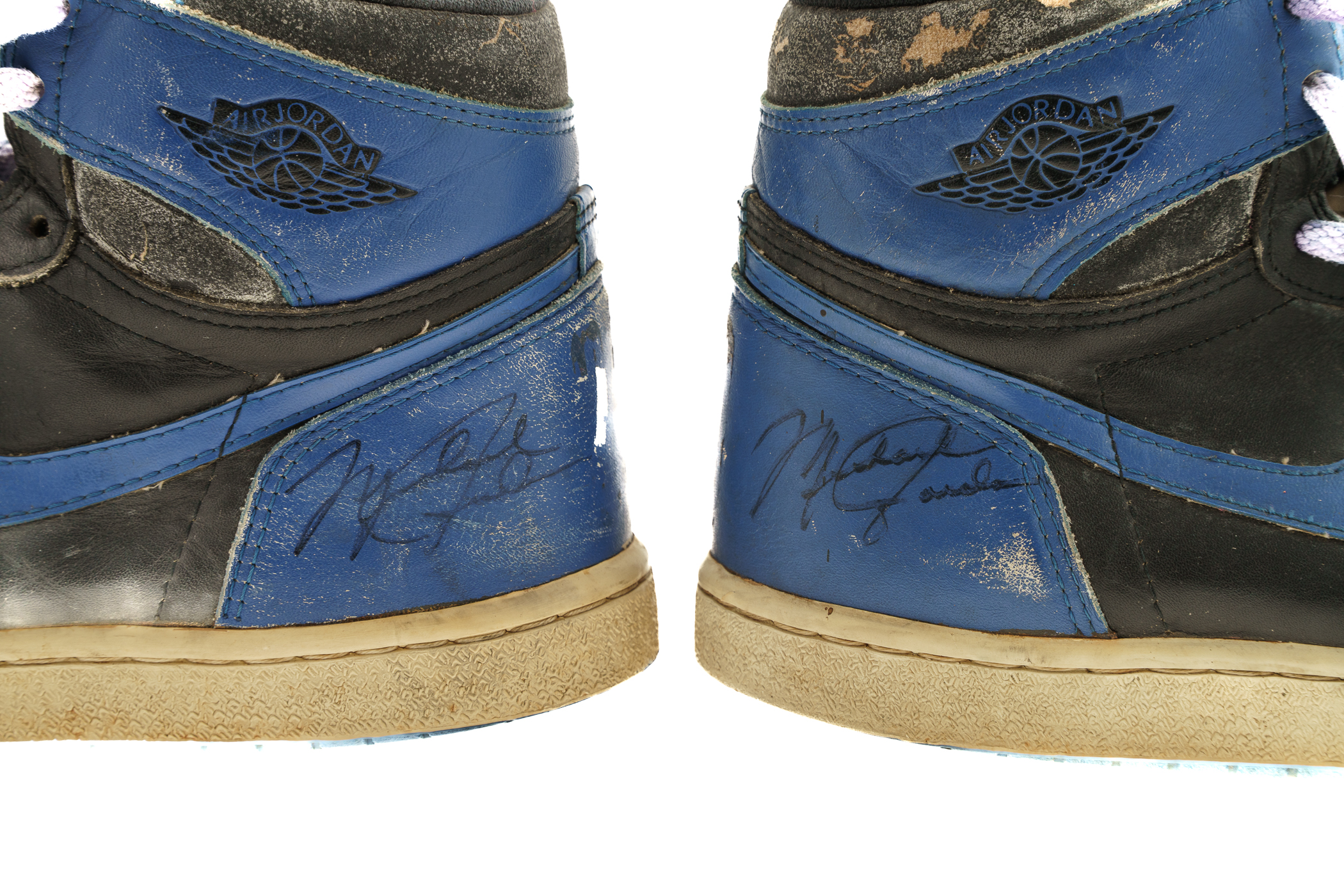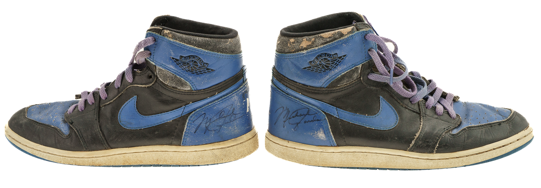 Pair of Nike Air Jordan 1 sneakers, each signed by Michael Jordan in black marker. The sneakers (size 10.5) display heavy wear and are in Fair condition overall. Full LOA from James Spence/JSA.