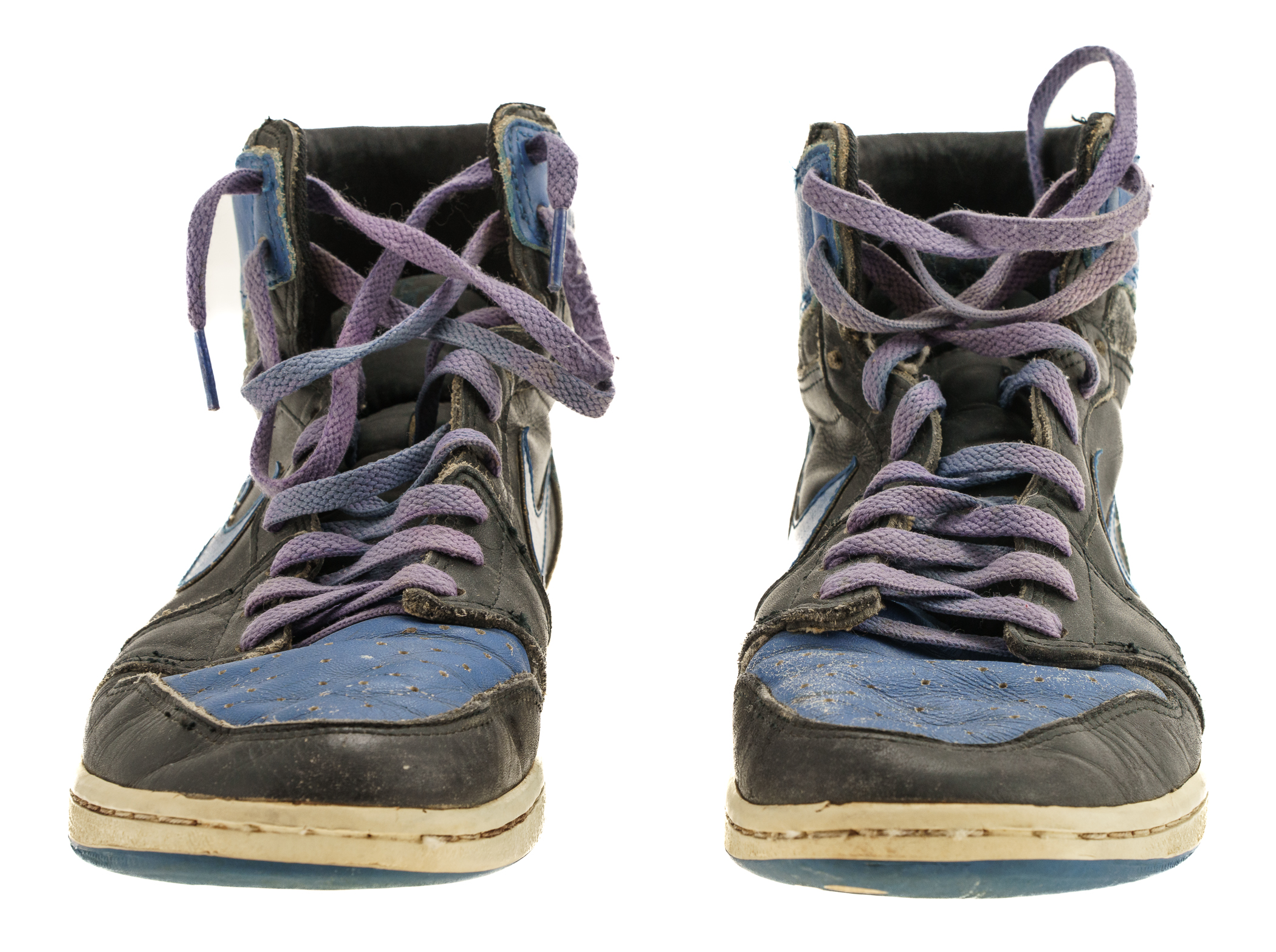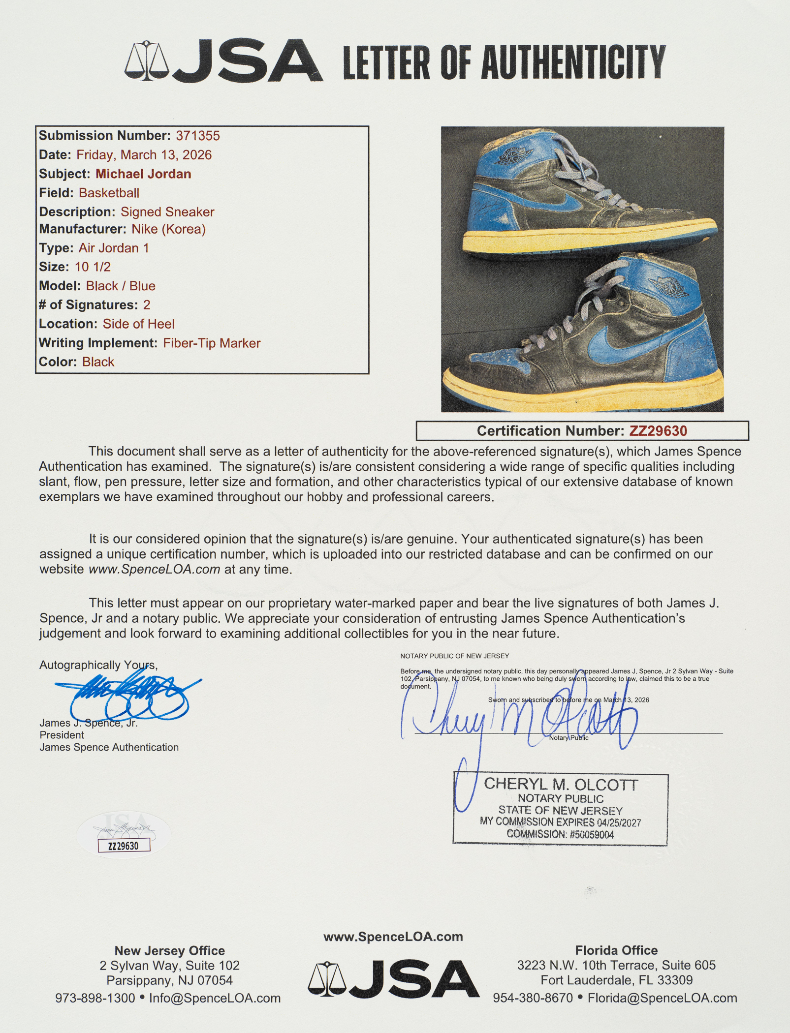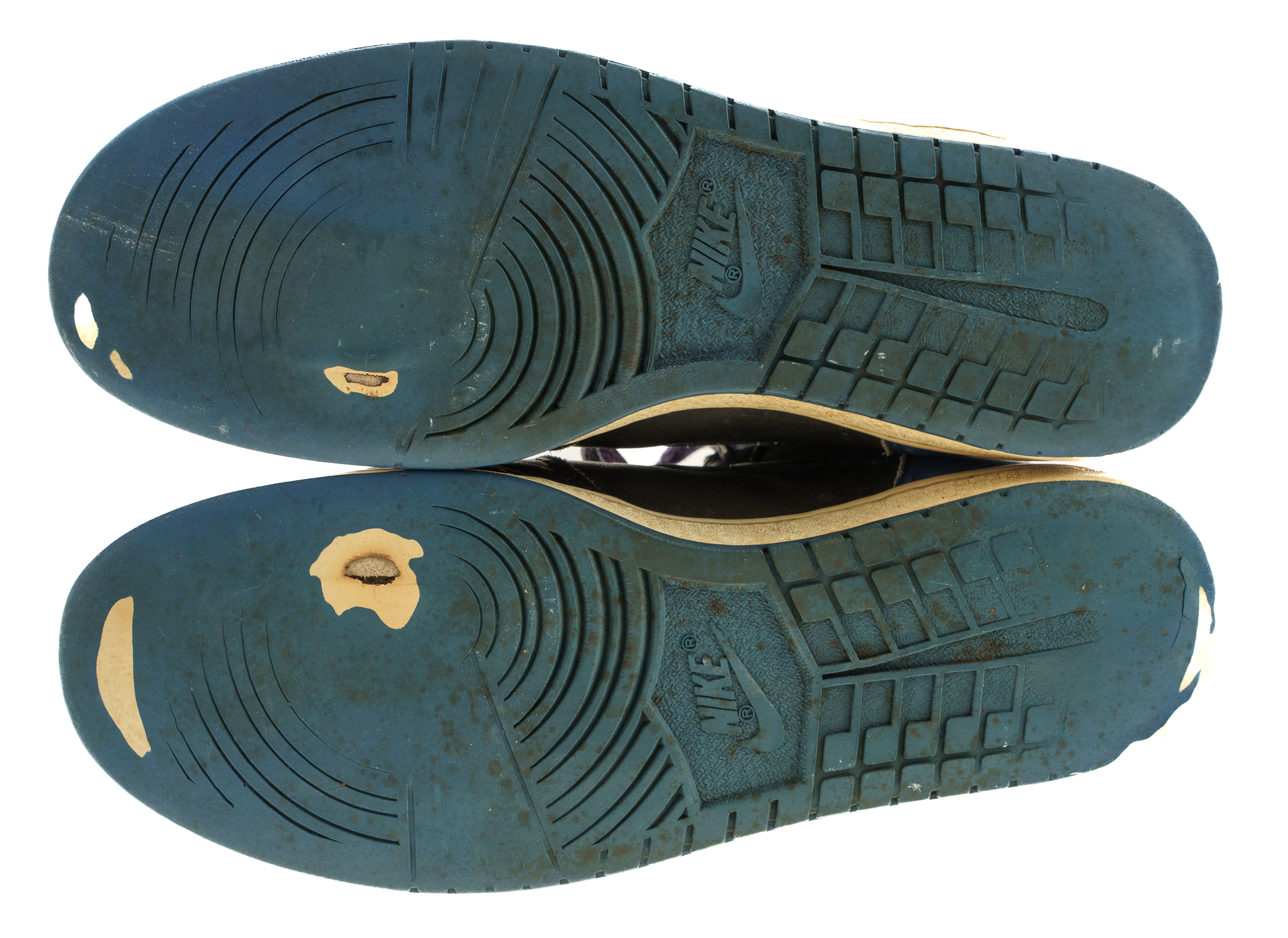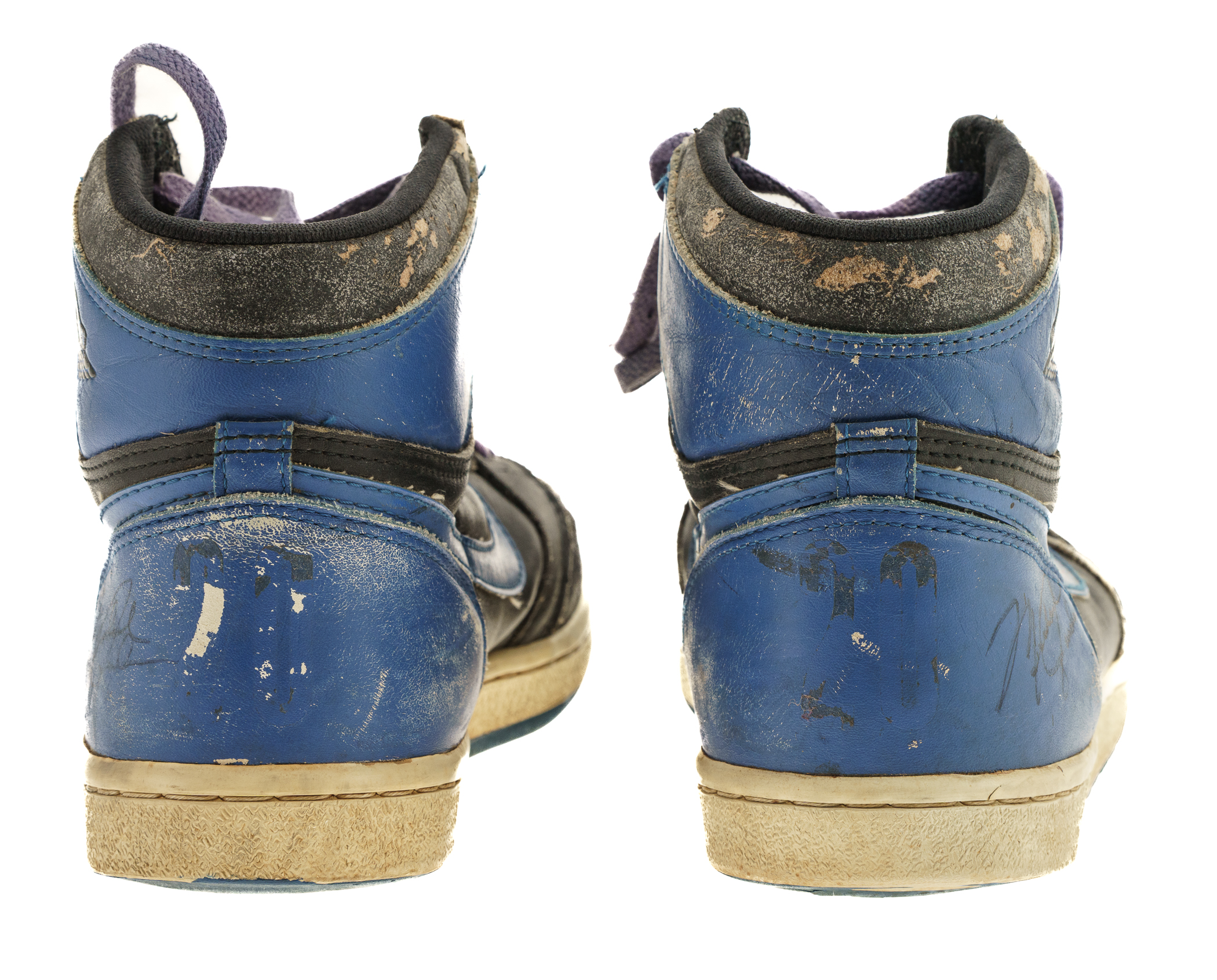 Pair of Nike Air Jordan 1 sneakers, each signed by Michael Jordan in black marker. The sneakers (size 10.5) display heavy wear and are in Fair condition overall. Full LOA from James Spence/JSA.