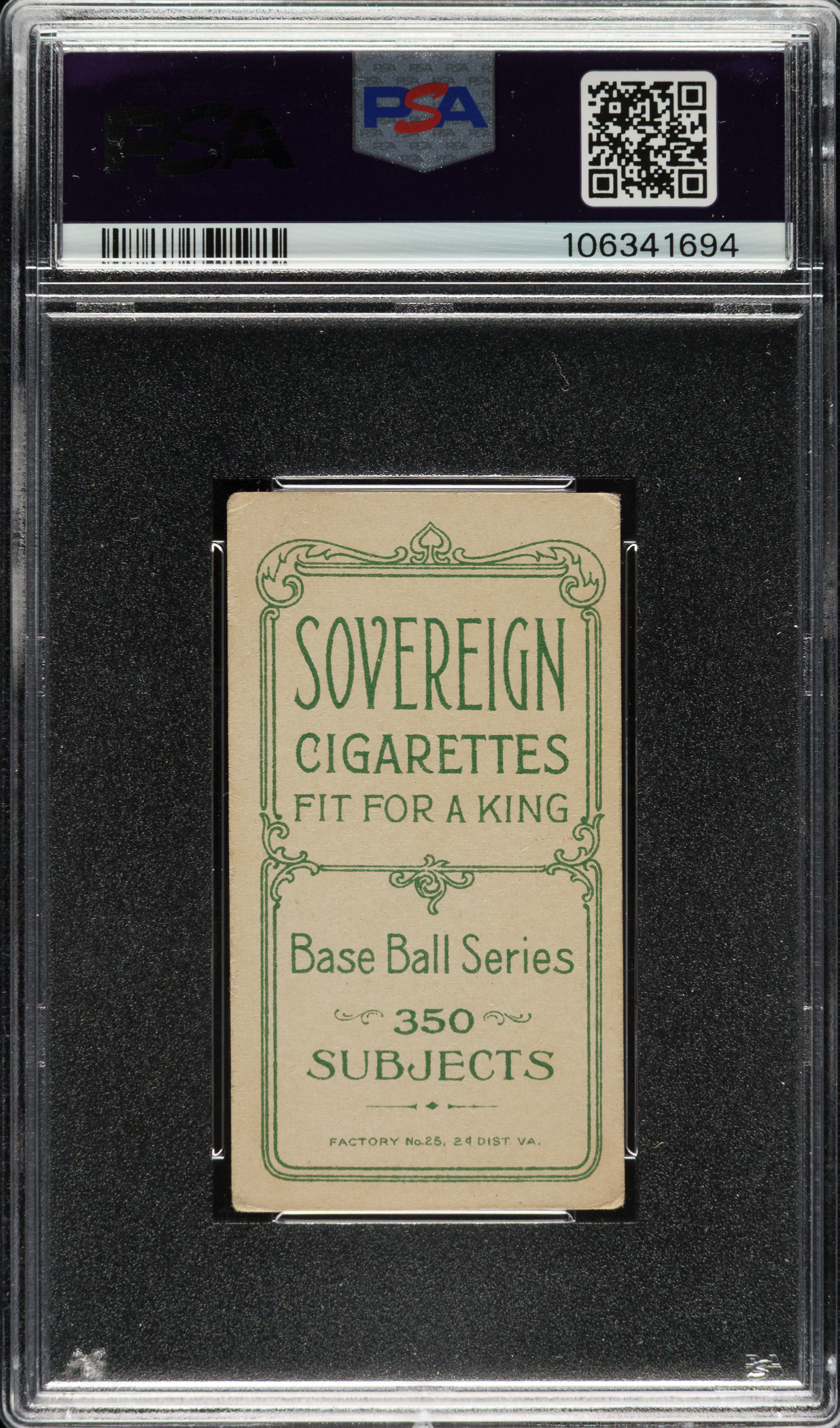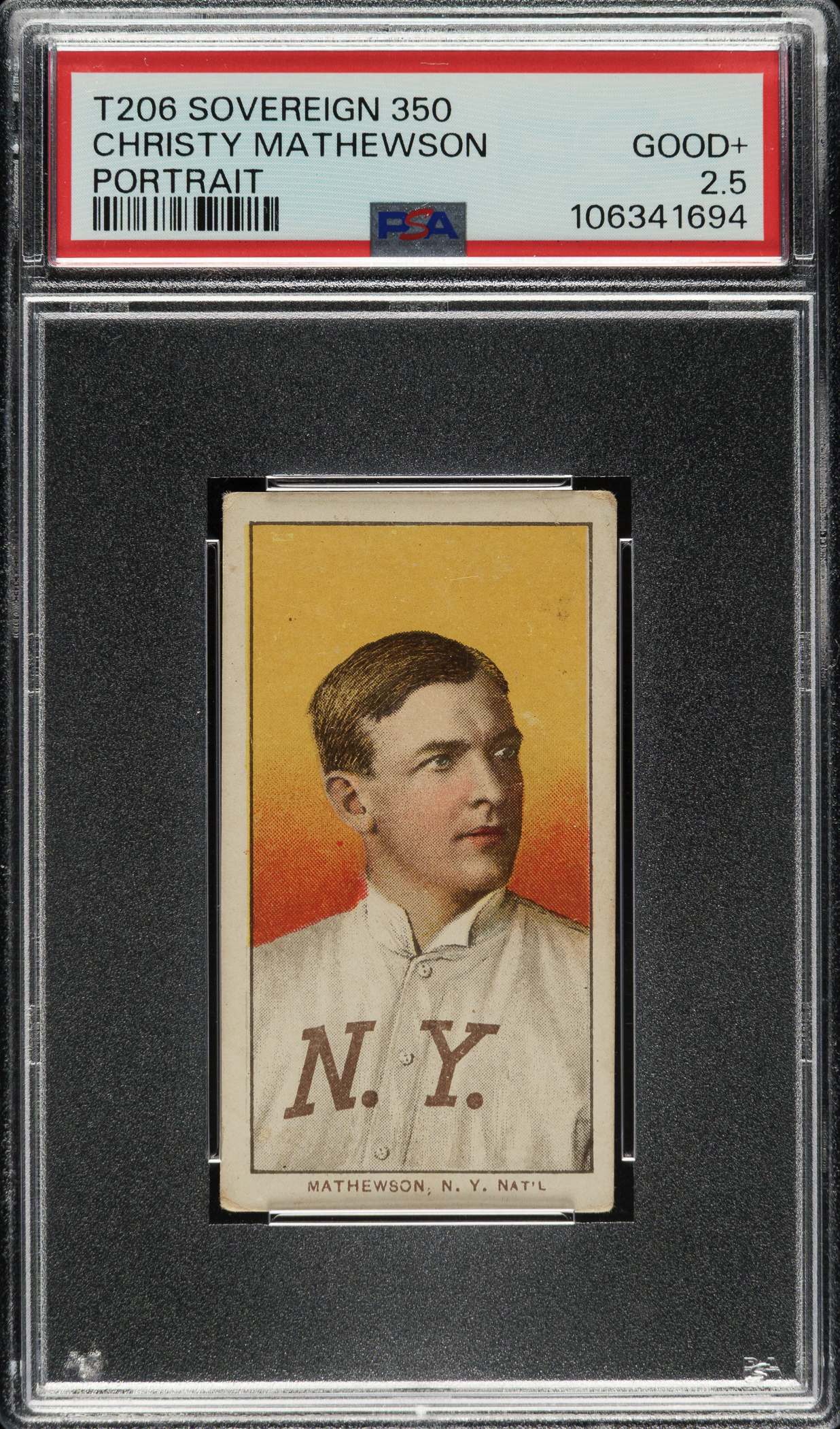 Graded GOOD+ 2.5 by PSA. Very attractive example of one of the three classic poses of New York Giants Hall of Famer Christy Mathewson from the T206 White Borders series. The offered example is noteworthy for its uncommon Sovereign 350 advertising back. This well-centered card has beautiful colors, outstanding registration, and even corner wear. The important Sovereign 350 advertising is boldly printed. This is an appealing and scarce back example of this classic Christy Mathewson tobacco card.