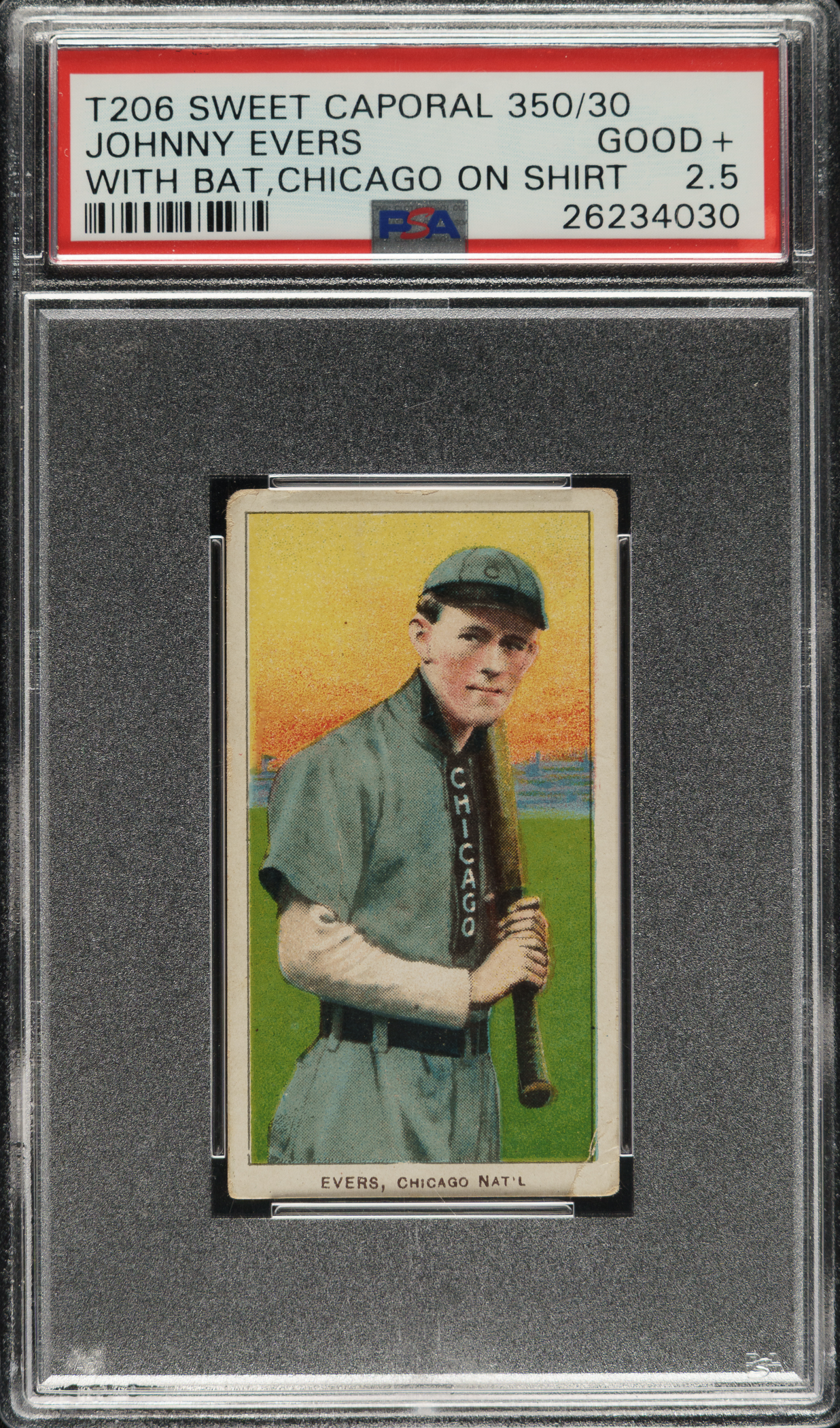 Lot # 304: 1909-1911 T206 White Border Johnny Evers with Bat, Chicago on Shirt PSA GOOD+ 2.5