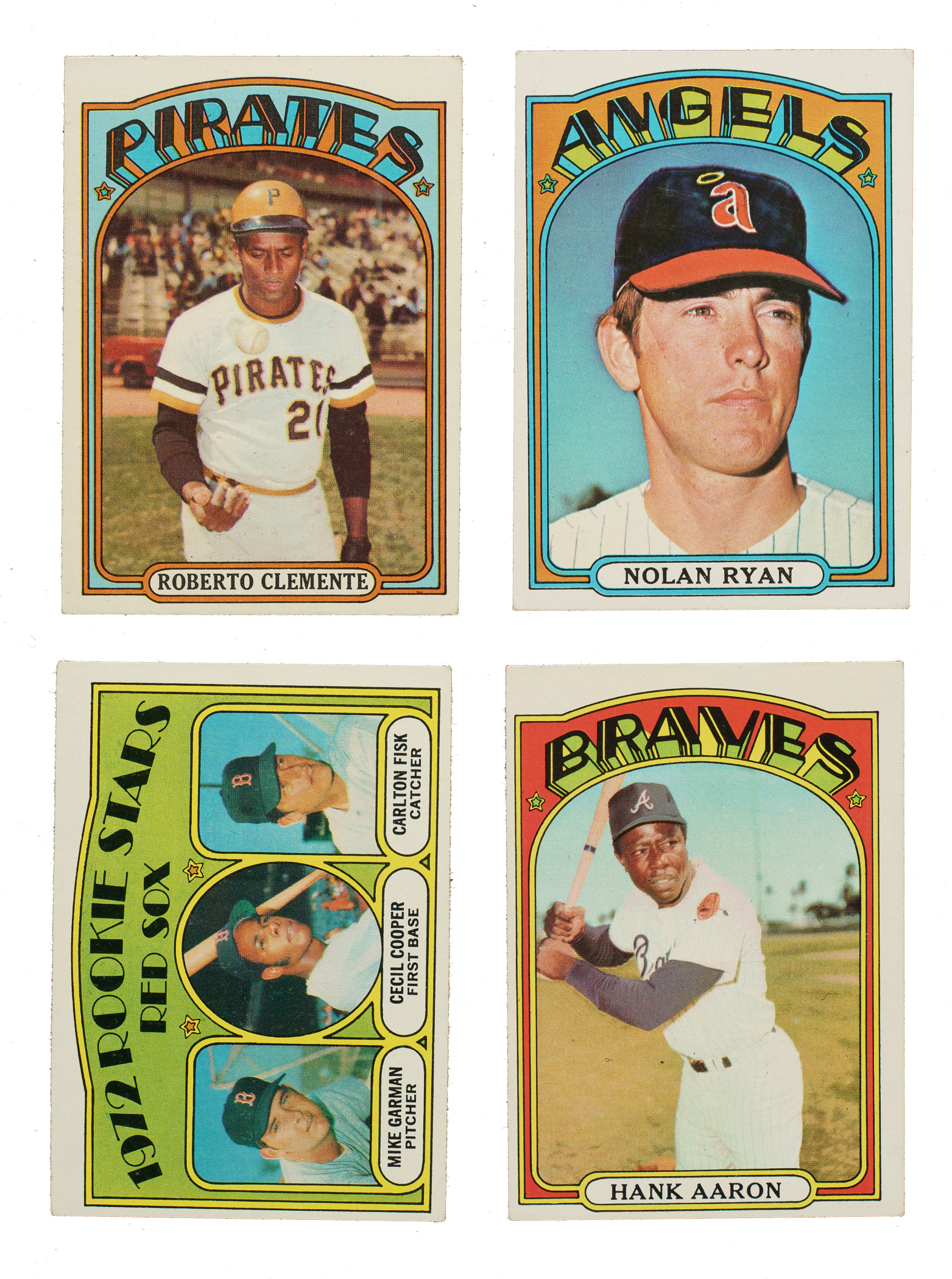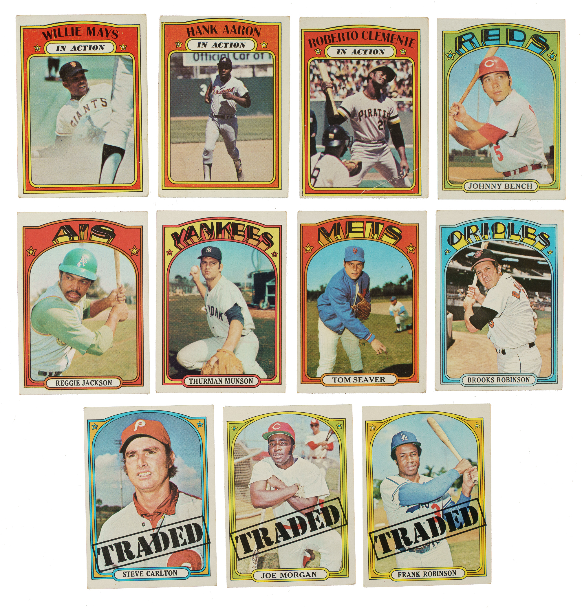 Presented is a near-complete set consisting of 781 different cards (out of 787 in the set) from the 1972 Topps series, one of the most popular Topps sets of the decade. Missing the following six cards for completion: #49 Mays, 559 Rose, 560 Rose IA, 686 Garvey, 695 Carew, and 696 Carew IA. Condition is 13% Ex to Ex-Mt (including a couple better), 82% Vg to Vg-Ex, and 5% lesser. Keys: #50 Mays IA (Gd+), 79 Fisk RC (Vg-Ex+), 299 Aaron (Ex), 300 Aaron IA (Fr-Gd), 309 Clemente (Vg), 310 Clemente IA (Gd), 433 Bench (Vg-Ex), 435 Jackson (Ex), 441 Munson (Ex), 445 Seaver (Vg), 550 B. Robinson (Vg), 595 Ryan (Vg), 751 Carlton Traded (Vg-Ex), 752 Morgan Traded (Vg-Ex+), and 754 F. Robinson Traded (Vg-Ex). This is a very attractive and consistent mid-grade set of one of the great classic Topps sets of the era. Total: 781 cards.