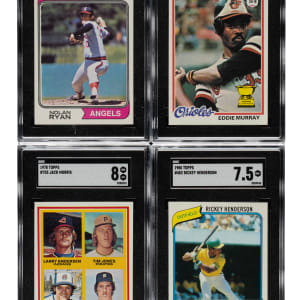 Collection of six complete baseball sets spanning the years 1974 through 1980. Also included are two Traded series. Each set offers numerous highlights, including key rookie cards of several Hall of Famers, among them Dave Winfield, Dennis Eckersley, Bruce Sutter, Andre Dawson, Paul Molitor, Ozzie Smith, and Rickey Henderson. We have selected four cards for grading and encapsulation by SGC. This collection consists of the following: 1) 1974 Topps Complete Set (660): 35% Ex-Mt to Nr/Mt, 47% Vg-Ex to Ex, and 18% Gd to Vg. Keys: #1 Aaron (Vg), 20 Ryan (NM 7), 252 Parker RC (Vg-Ex+), 283 Schmidt (Ex-Mt), 300 Rose (Ex-Mt), 456 Winfield RC (Vg+). 2) 1976 Topps Complete Set (660) Plus Traded Series (44): 29% Nr/Mt to Nr/Mt-Mt (including a few Mint), 63% Ex to Ex-Mt (mostly due to centering), and 8% Vg to Vg-Ex (including some due to centering). Keys: #19 Brett (80/20 T/B, otherwise Nr/Mt+), 98 Eckersley RC (25/75 L/R, otherwise Nr/Mt), 240 Rose (Nr/Mt due to centering), 330 Ryan (80/20 T/B, otherwise Nr/Mt+), 345 Ruth ATAS (100/0 T/B, otherwise Nr/Mt), 550 Aaron (Vg), and 599 Guidry RC (Vg-Ex). Condition of the Traded series ranges from Ex to Nr/Mt-Mt (averaging Ex-Mt+), with a couple Vg-Ex. 3) 1977 Topps Complete Set (660): 43% Nr/Mt to Nr/Mt-Mt (including a few Mint), 47% Ex to Ex-Mt, and 10% Vg to Vg-Ex. Keys: #144 Sutter RC (Nr/Mt), 473 Dawson RC (Ex), 476 Murphy RC (Vg), and 650 Ryan (Ex-Mt). 4) 1978 Topps Complete Set (726): 40% Nr/Mt to Nr/Mt-Mt (including a few Mint), 53% Ex to Ex-Mt, and 7% Vg to Vg-Ex. Keys: #20 Rose (Nr/Mt-Mt), 36 Murray RC (NM/MT 8), 400 Ryan (Ex-Mt), 703 Morris RC (NM/MT 8), 704 Whitaker RC (Ex+), 707 Molitor RC (measures a bit small, otherwise Nr/Mt). 5) 1979 Topps Complete Set (726): 12% Nr/Mt or better, 61% Ex to Ex-Mt, and 27% Vg to Vg-Ex (including a couple lesser). Keys: #24 Molitor (Vg-Ex), 115 Ryan (Vg-Ex), and 116 Smith RC (85/15 L/R, otherwise Vg-Ex). 6) 1980 Topps Complete Set (726): 30% Nr/Mt or better, 38% Ex to Ex-Mt, and 32% Vg to Vg-Ex (including a couple lesser). Keys: #393 Smith (Ex-Mt), 482 Henderson RC (NM+ 7.5), and 580 Ryan (Nr/Mt). This is a very attractive mid- to high-grade Topps complete set collection. Total: 6 sets, 4,202 cards. The size/weight of this item requires that there will be an additional shipping charge for this lot.