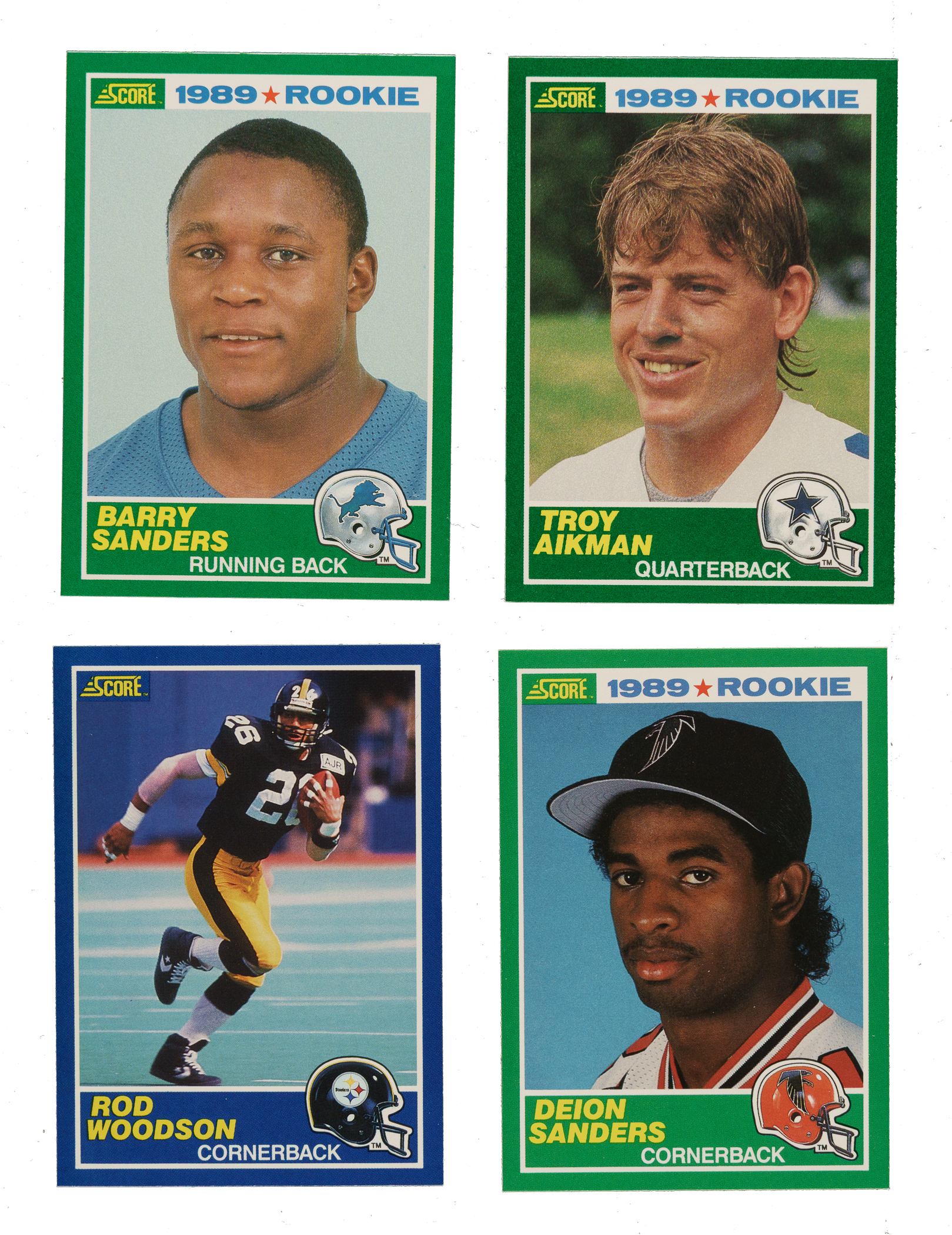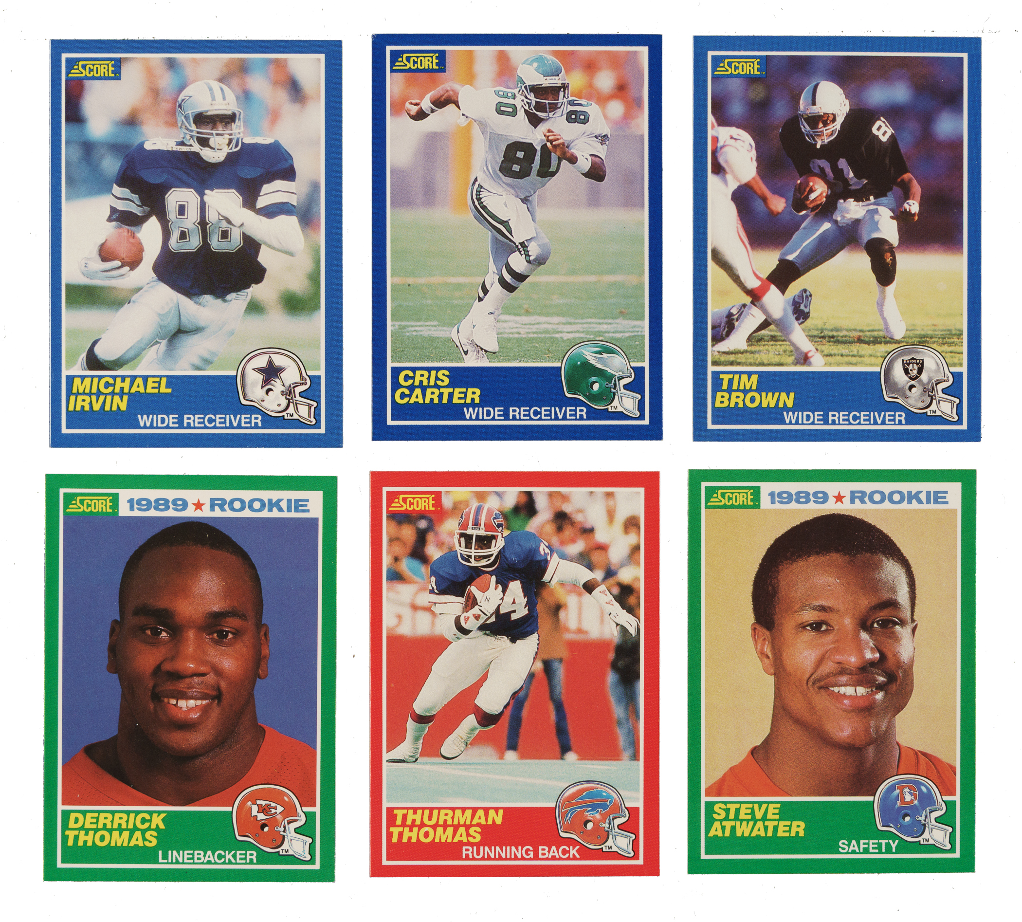Complete set of 1989 Score Football. Condition is Nr/Mt to Nr/Mt-Mt overall, with some Mint and 6% lesser. Keys: #18 Irvin RC (Nr/Mt-Mt), 72 Carter RC (Vg-Ex), 78 Woodson RC (Nr/Mt-Mt+), 86 Brown RC (Nr/Mt-Mt+), 211 T. Thomas RC (Ex), 246 D. Sanders RC (Nr/Mt-Mt), 257 B. Sanders RC (Nr/Mt-Mt+), 258 D. Thomas RC (Nr/Mt+), 263 Atwater RC (Nr/Mt+), and 270 Aikman RC (Nr/Mt-Mt). Total: 330 cards. The size/weight of this item requires that there will be an additional shipping charge for this lot.