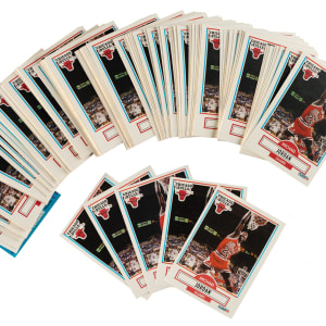Presented is an extremely substantial collection of 126 high-grade complete sets of 1990-1991 Fleer basketball (198 cards per set) plus one complete 12-card set of All-Stars inserts. These superb sets have bright colors, strong corners, and an overall pack-fresh quality. The key to the set, of course, is Michael Jordan (card #26), with dozens of additional Hall of Famers and rookies adding to the appeal, including Larry Bird, Magic Johnson, Tim Hardaway (rookie), and Shawn Kemp (rookie). The condition of the 126 Michael Jordan cards is 85% ranging from Nr/Mt to Mint (averaging Nr/Mt-Mt) and 15% Ex to Ex-Mt (including one Vg-Ex). The #5 Jordan All-Star insert grades Nr/Mt. The condition of the balance of the sets is 88% ranging from Nr/Mt to Mint (averaging Nr/Mt-Mt) and 12% Ex to Ex-Mt (including 1% lesser). This is an outstanding high-grade collection of complete sets of 1990-1991 Fleer basketball cards. Total: 127 sets, 24,960 cards. The size/weight of this item requires that there will be an additional shipping charge for this lot.