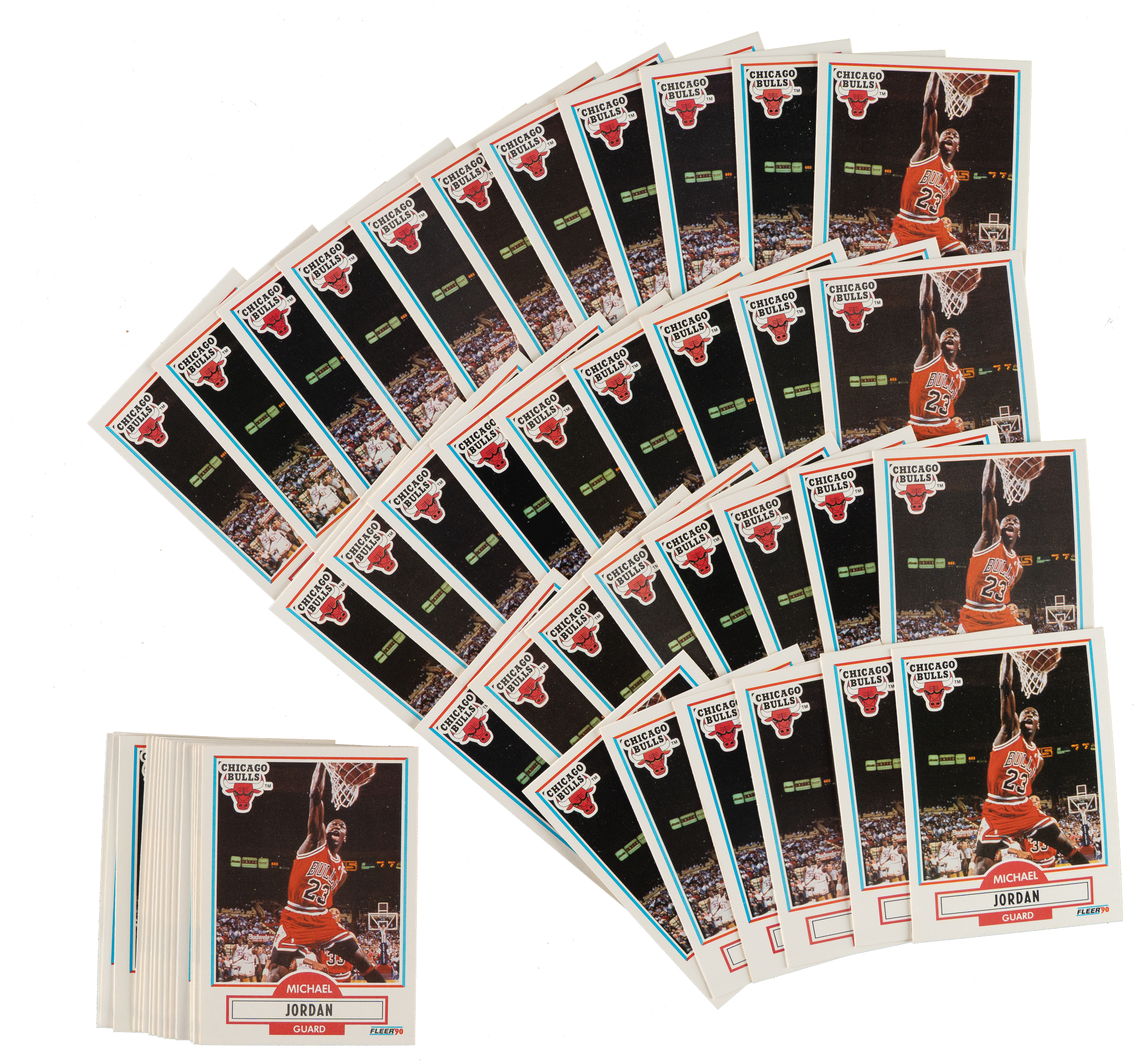Presented are fifty high-grade 198-card complete sets of 1990-1991 Fleer basketball. These superb sets have bright colors, sharp corners, and an overall pack-fresh quality. The key to the set, of course, is Michael Jordan (card #26), with dozens of additional Hall of Famers and rookies adding to the appeal, including Larry Bird, Magic Johnson, Tim Hardaway (rookie), and Shawn Kemp (rookie). The condition of the fifty Michael Jordan cards ranges from Nr/Mt to Mint (averaging Nr/Mt-Mt), with six slightly lesser. The condition of the balance of the sets is 90% ranging from Nr/Mt to Mint (averaging Nr/Mt-Mt), with 10% slightly lesser. This is an outstanding high-grade collection of complete sets of 1990-1991 Fleer basketball cards. Total: 50 sets, 9,900 cards. The size/weight of this item requires that there will be an additional shipping charge for this lot.