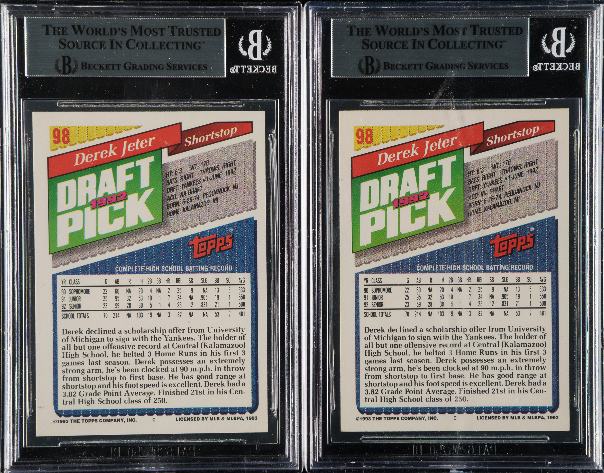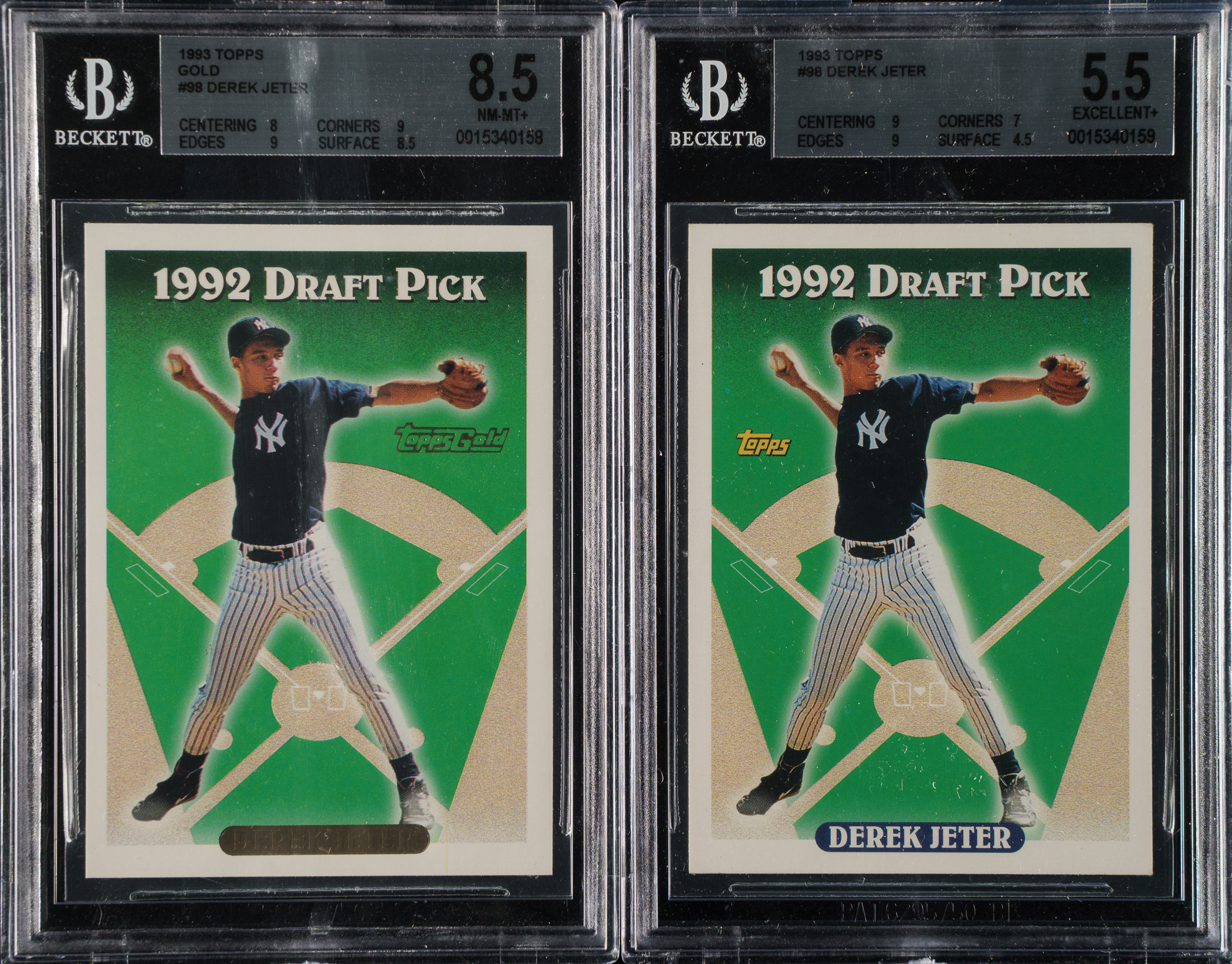 Pair of 1993 Topps cards, featuring New York Yankees Hall of Famer Derek Jeter. Both cards have been graded and encapsulated by BGS. This pair consists of the following: #98 Jeter RC/Gold (NM-MT+ 8.5) and 98 Jeter RC (EX+ 5.5). Total: 2 cards.