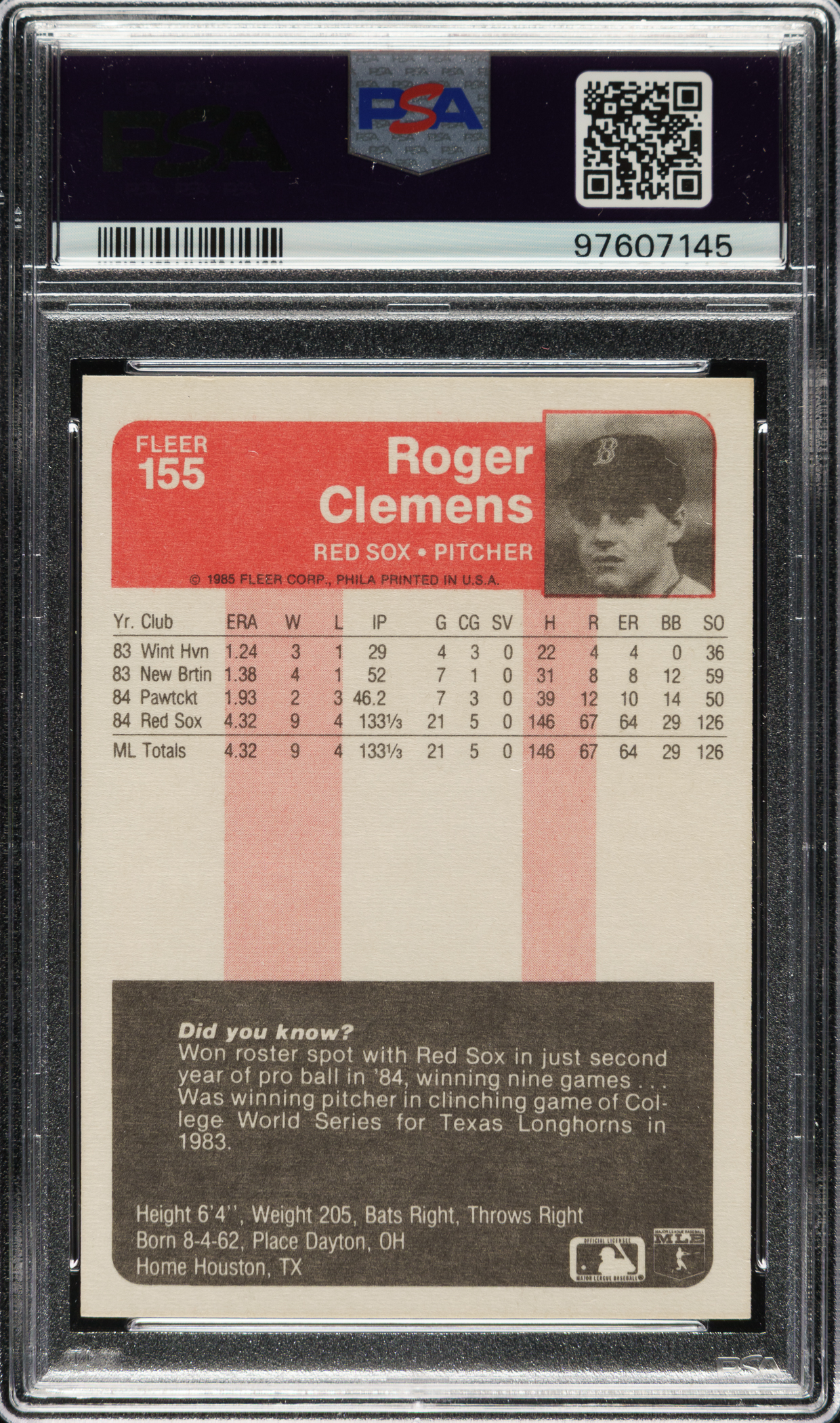Lot # 2222: 1985 Fleer #155 Roger Clemens Rookie PSA MINT 9