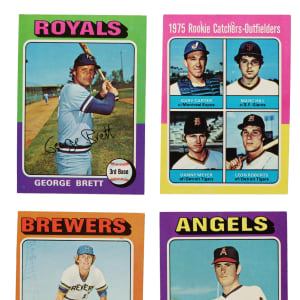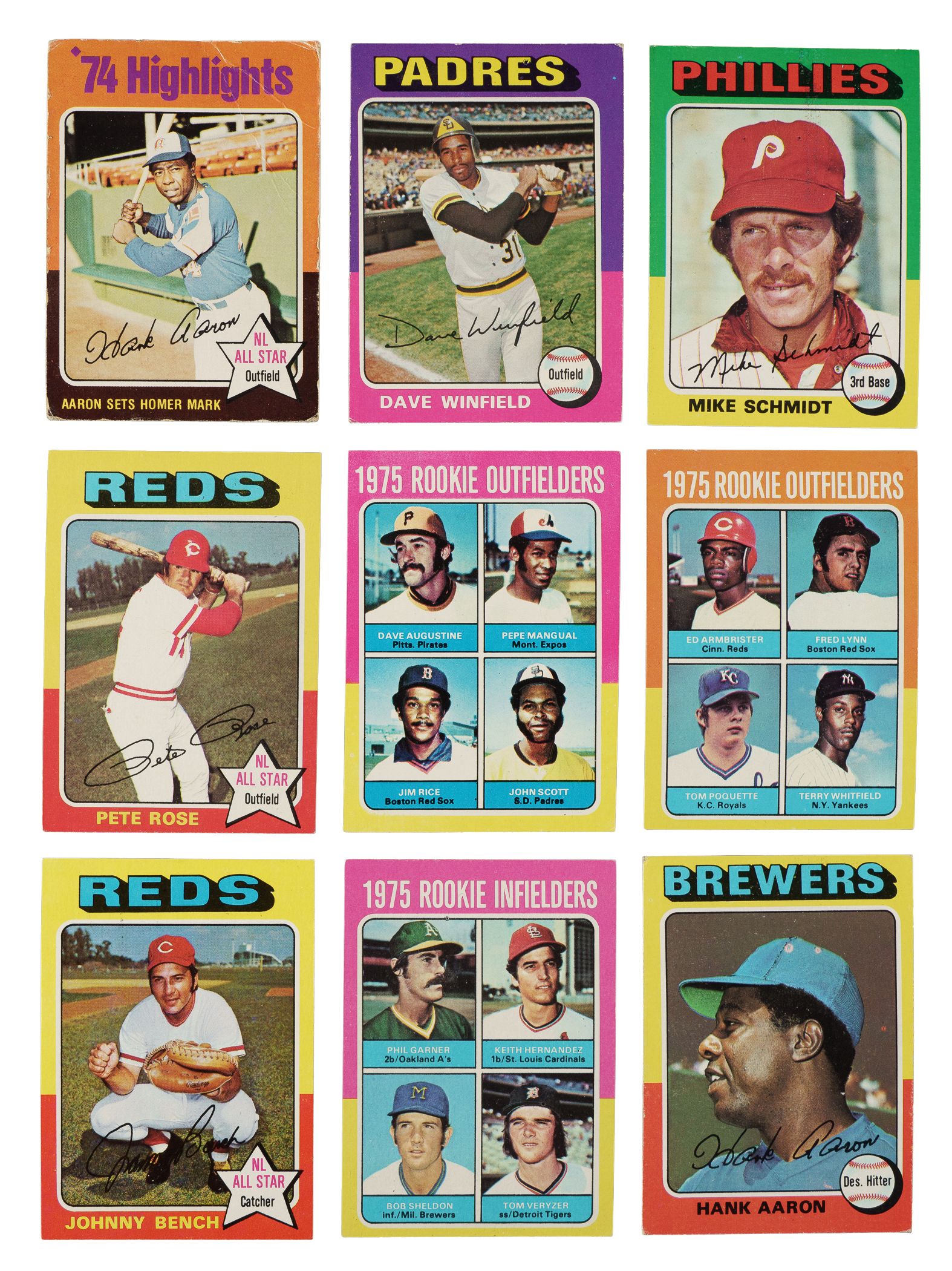 The rookie cards of Hall of Famers George Brett, Robin Yount, Gary Carter, and Jim Rice highlight the 1975 Topps issue, one of the most popular and unusual sets of the 1970s. The colored flush-to-the-border design of the 1975 Topps set makes this issue particularly challenging to collect in high grade. Condition is 12% Ex-Mt to Nr/Mt, 75% Vg-Ex to Ex, and 13% Gd to Vg (including 2% lesser). Keys: #1 Aaron HL (Gd), 61 Winfield (Vg-Ex), 70 Schmidt (Ex+), 223 Yount RC (Ex), 228 Brett RC (Ex-Mt), 260 Bench (Nr/Mt), 320 Rose (Ex), 500 Ryan (Vg-Ex+), 616 Rice RC (Ex), 620 Carter RC (Ex), 622 Lynn RC (Ex), 623 Hernandez RC (Ex+), and 660 Aaron (Vg). This is a very attractive and consistent mid-grade set loaded with Hall of Famers and stars from the 1970s. Total: 660 cards.