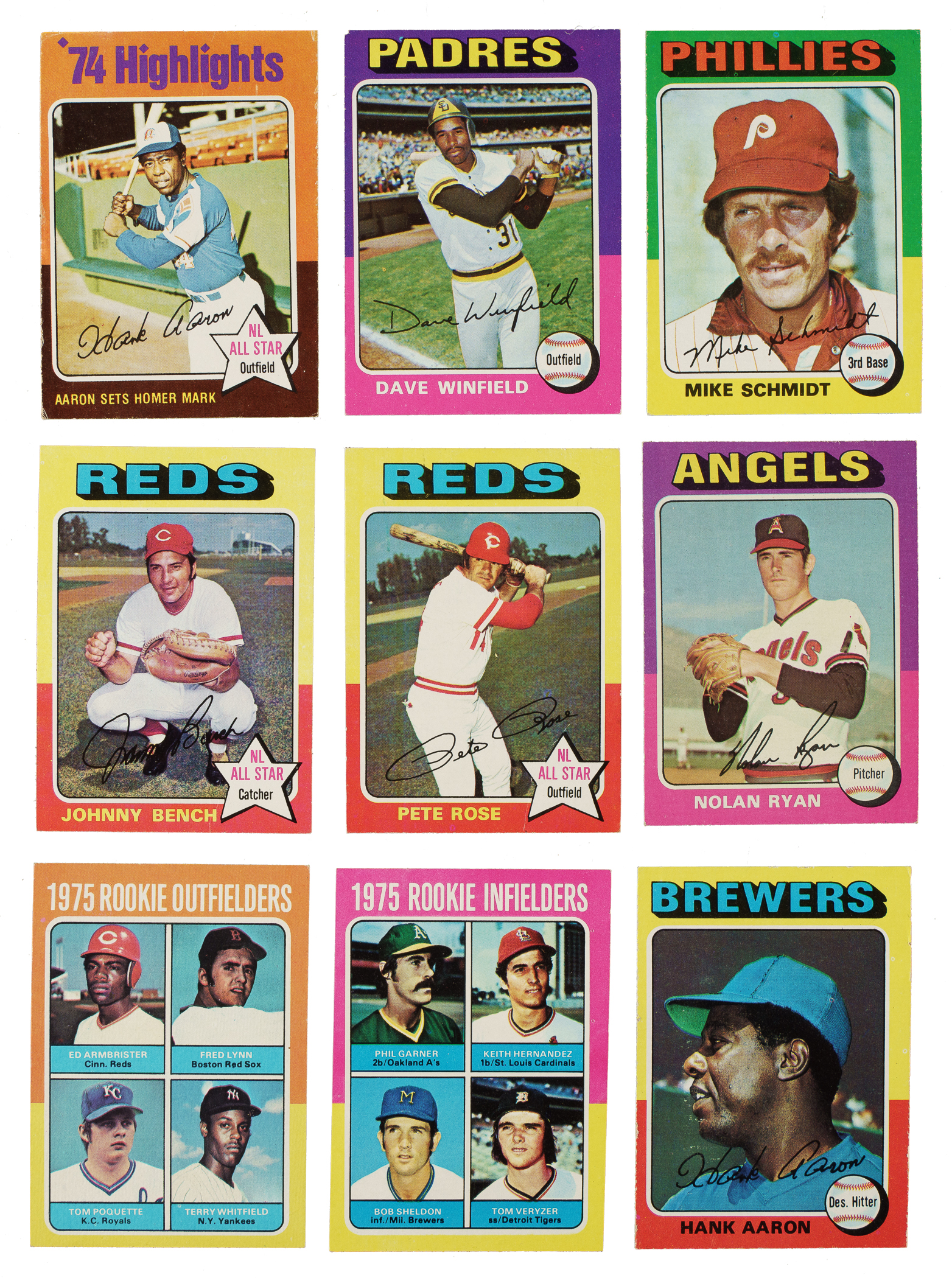 The rookie cards of Hall of Famers George Brett, Robin Yount, Gary Carter, and Jim Rice highlight the 1975 Topps issue, one of the most popular and unusual sets of the 1970s. The colored flush-to-the-border design of the 1975 Topps set makes this issue particularly challenging to collect in extremely high grade. Condition is 18% Nr/Mt to Nr/Mt-Mt (mostly Nr/Mt), 60% Ex to Ex-Mt, and 22% Vg to Vg-Ex (including 4% lesser due mostly to miscut centering or marked team checklists). Keys: #1 Aaron HL (Gd), 61 Winfield (Vg), 70 Schmidt (Vg-Ex+), 223 Yount RC (Ex+), 228 Brett RC (Ex-Mt), 260 Bench (Vg), 320 Rose (Gd+), 500 Ryan (Ex-Mt), 616 Rice RC (Nr/Mt+), 620 Carter RC (Ex-Mt), 622 Lynn RC (Ex), 623 Hernandez RC (Ex-Mt), and 660 Aaron (Vg+). This is a very attractive mid- to high-grade set loaded with Hall of Famers and stars from the 1970s. Total: 660 cards.