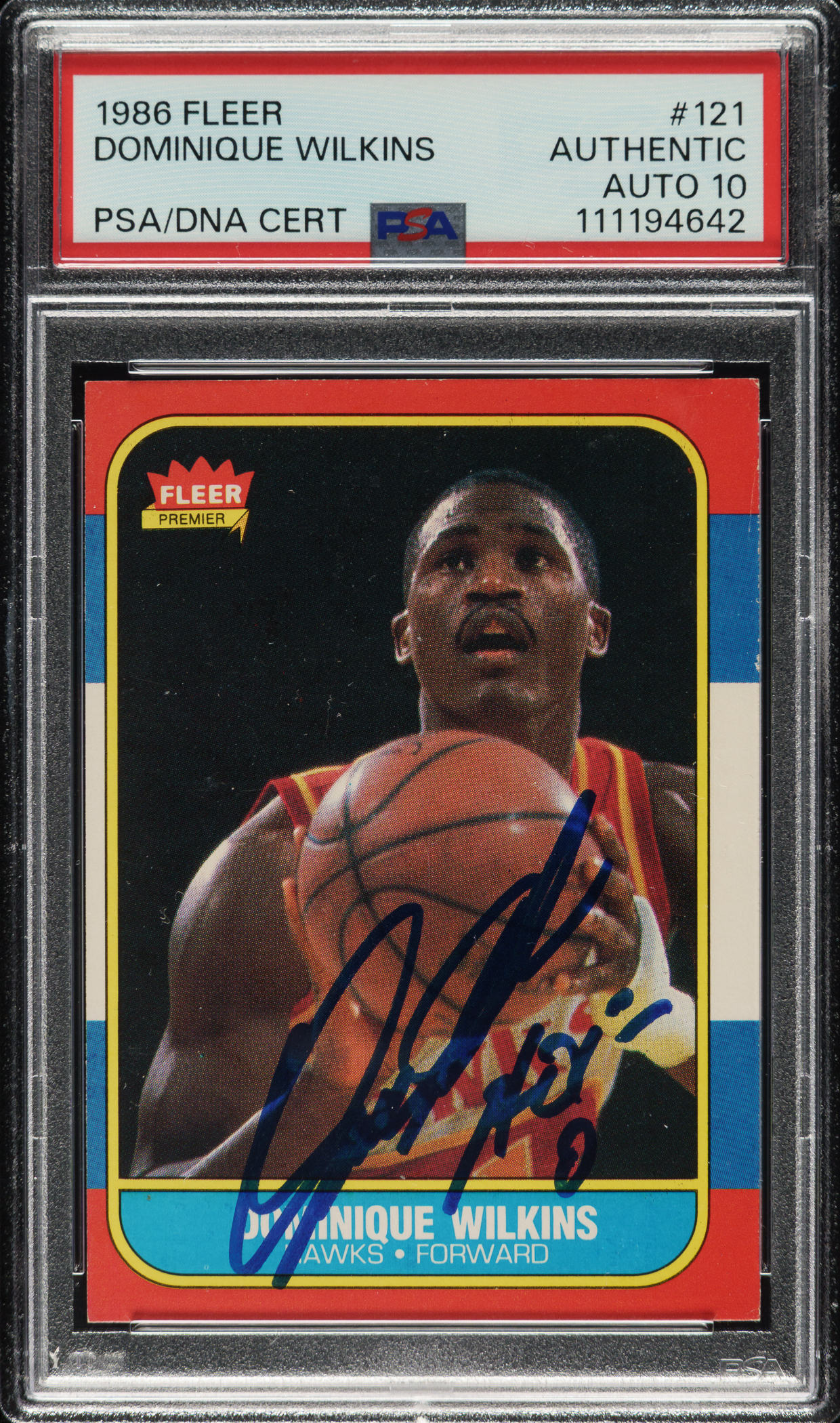 PSA/DNA has encapsulated the card, grading the signature GEM MINT 10. Atlanta Hawks basketball Hall of Famer Dominque Wilkins.