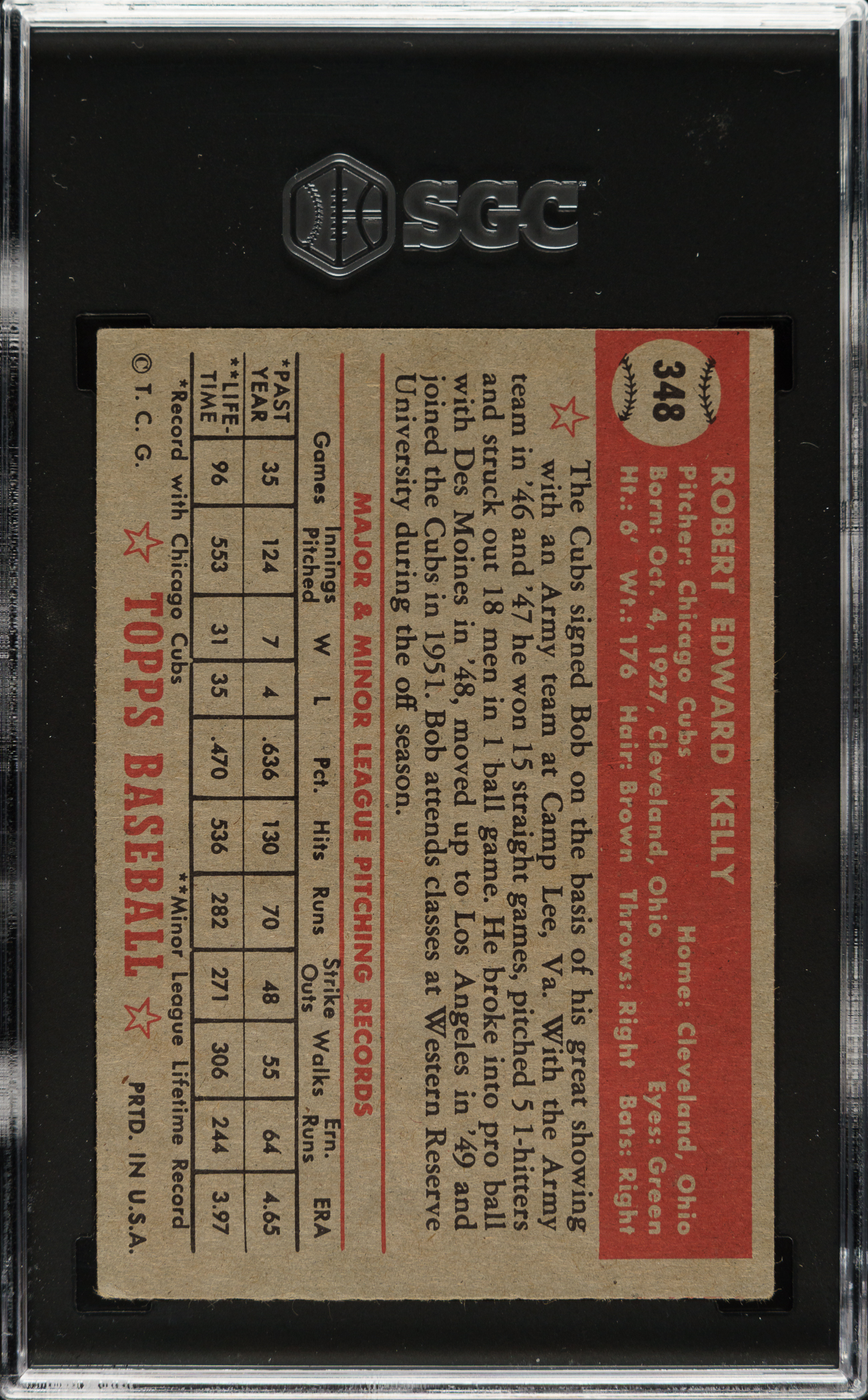 Lot # 1481: 1952 Topps #348 Bob Kelly High Number SGC VG/EX+ 4.5