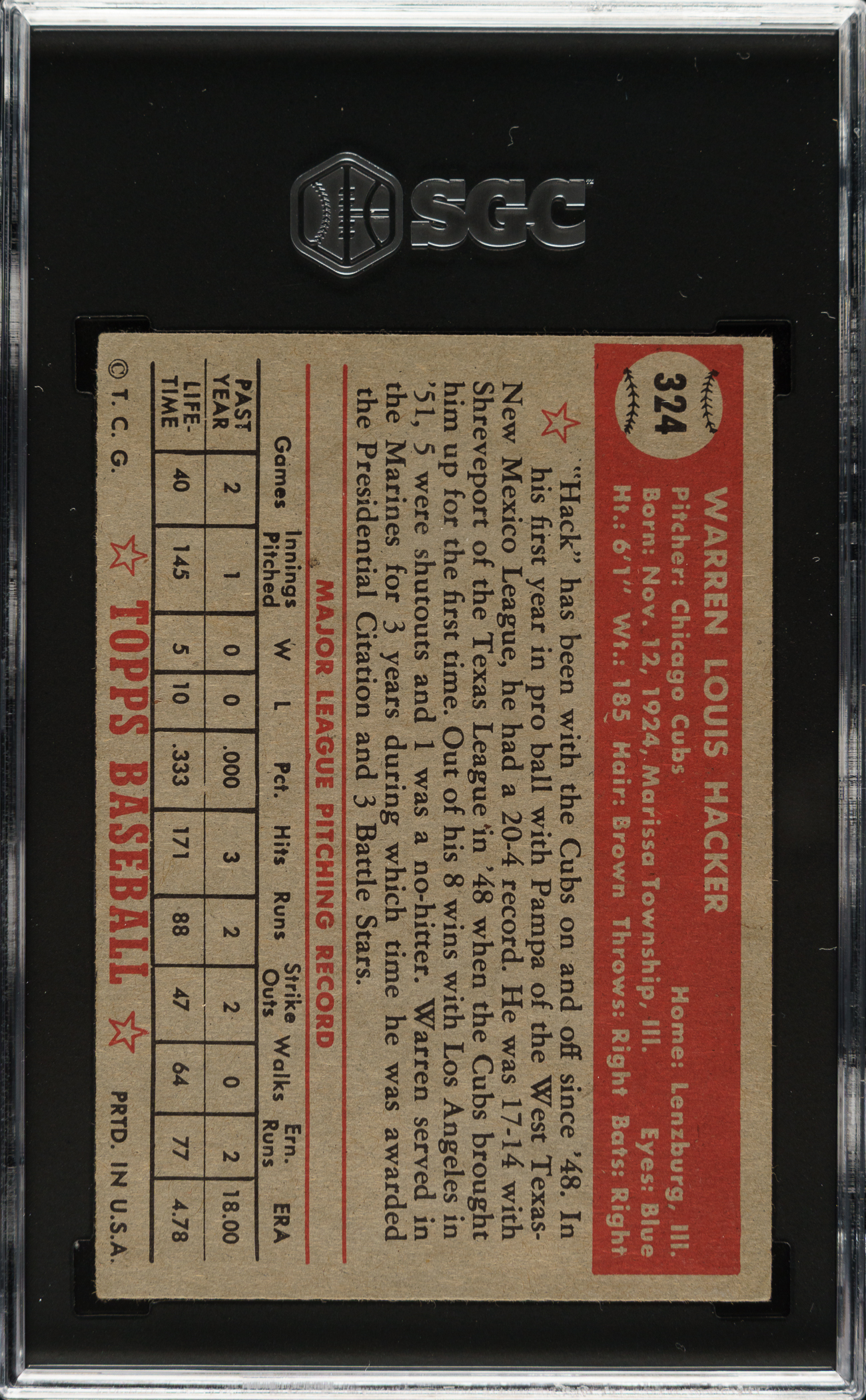 Lot # 1468: 1952 Topps #324 Warren Hacker High Number SGC VG/EX 4