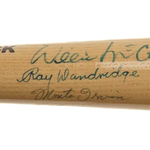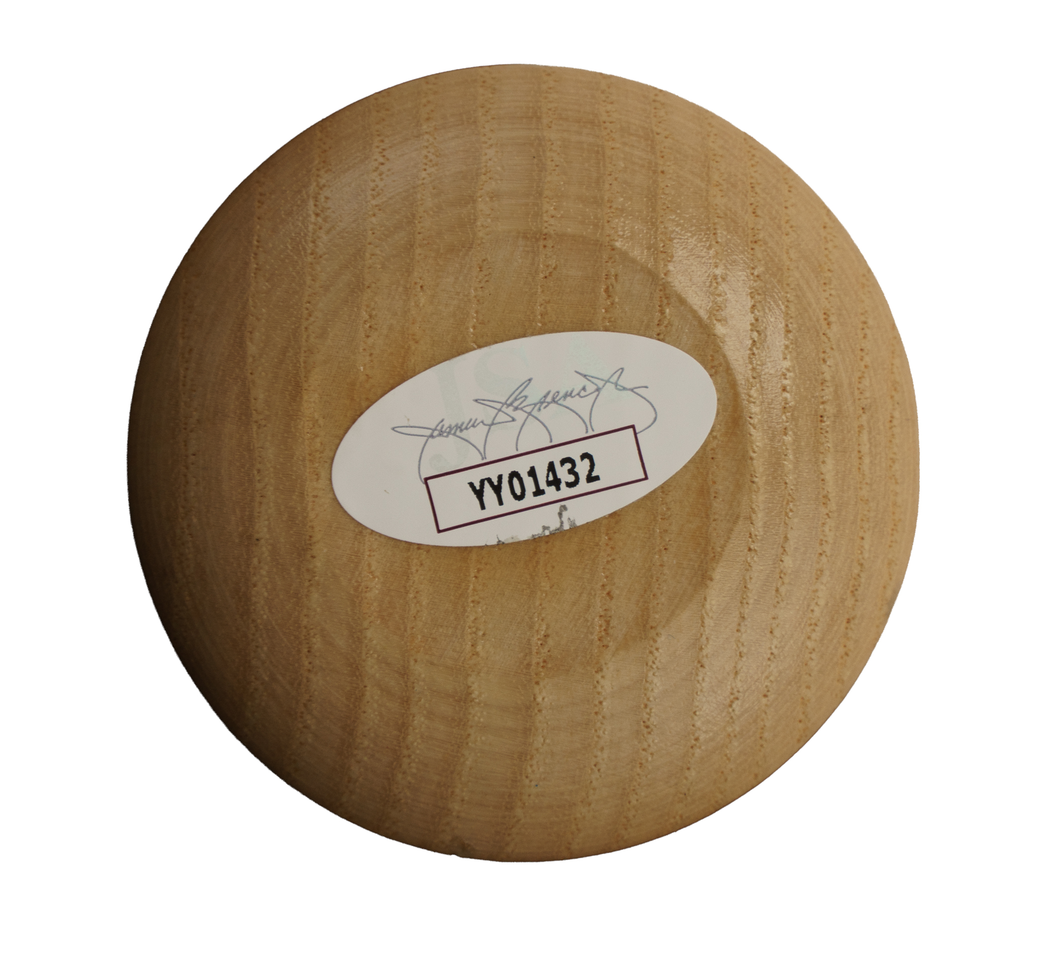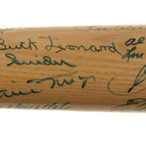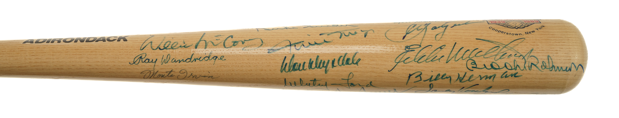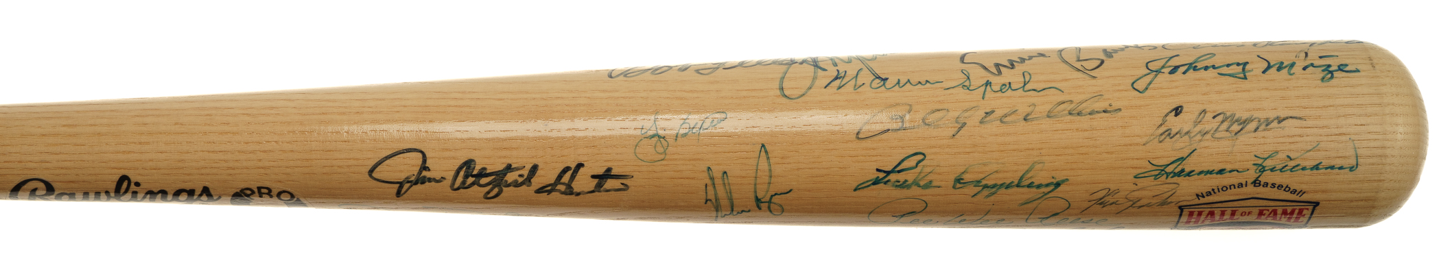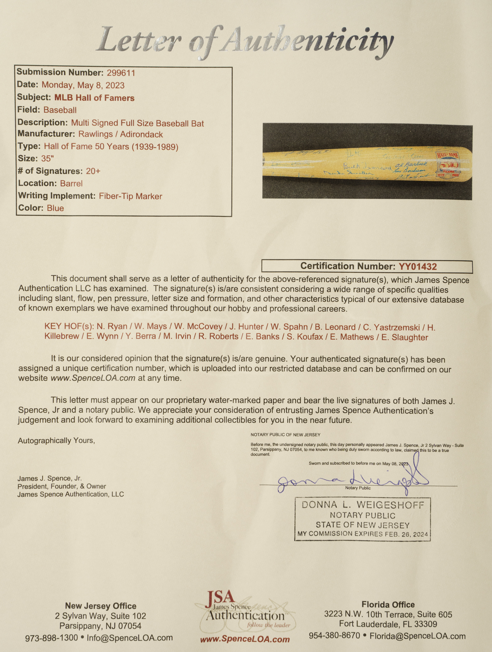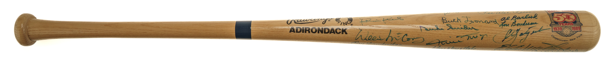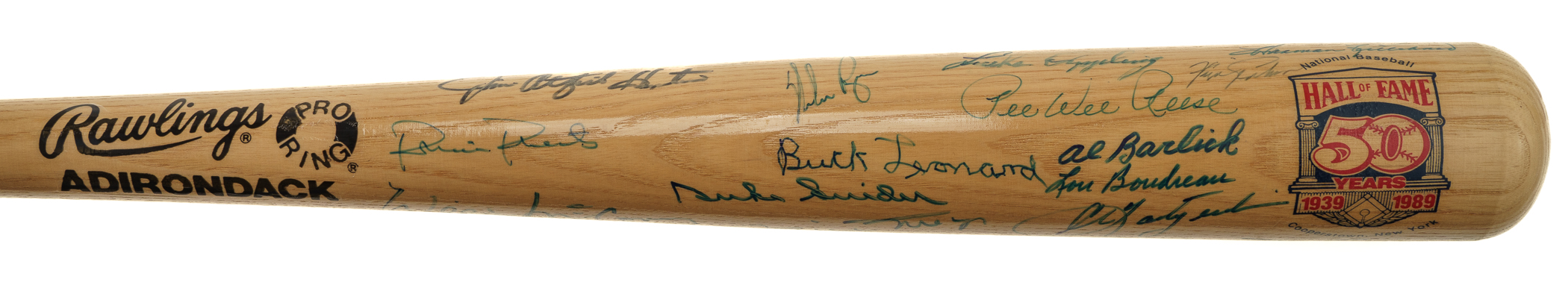 Hall of Fame "50th Anniversary" commemorative bat, produced by Rawlings, signed by 31 Hall of Fame players. Notable signatures include Ryan, Mays, McCovey, Hunter, Spahn, Leonard, Yastrzemski, Killebrew, Wynn, Berra, Irvin, Roberts, Jenkins, Drysdale, Snider, Ford, Banks, Koufax, Reese, Mathews, B. Robinson, Seaver, B, Herman, Appling, Feller, Mize, Barlick, Boudreau, Dandridge, B. Williams, and Slaughter. The bat (35 inches) is in Near Mint condition. Full LOA from James Spence/JSA (a corresponding sticker is affixed to the knob). The size/weight of this item requires that there will be an additional shipping charge for this lot.
