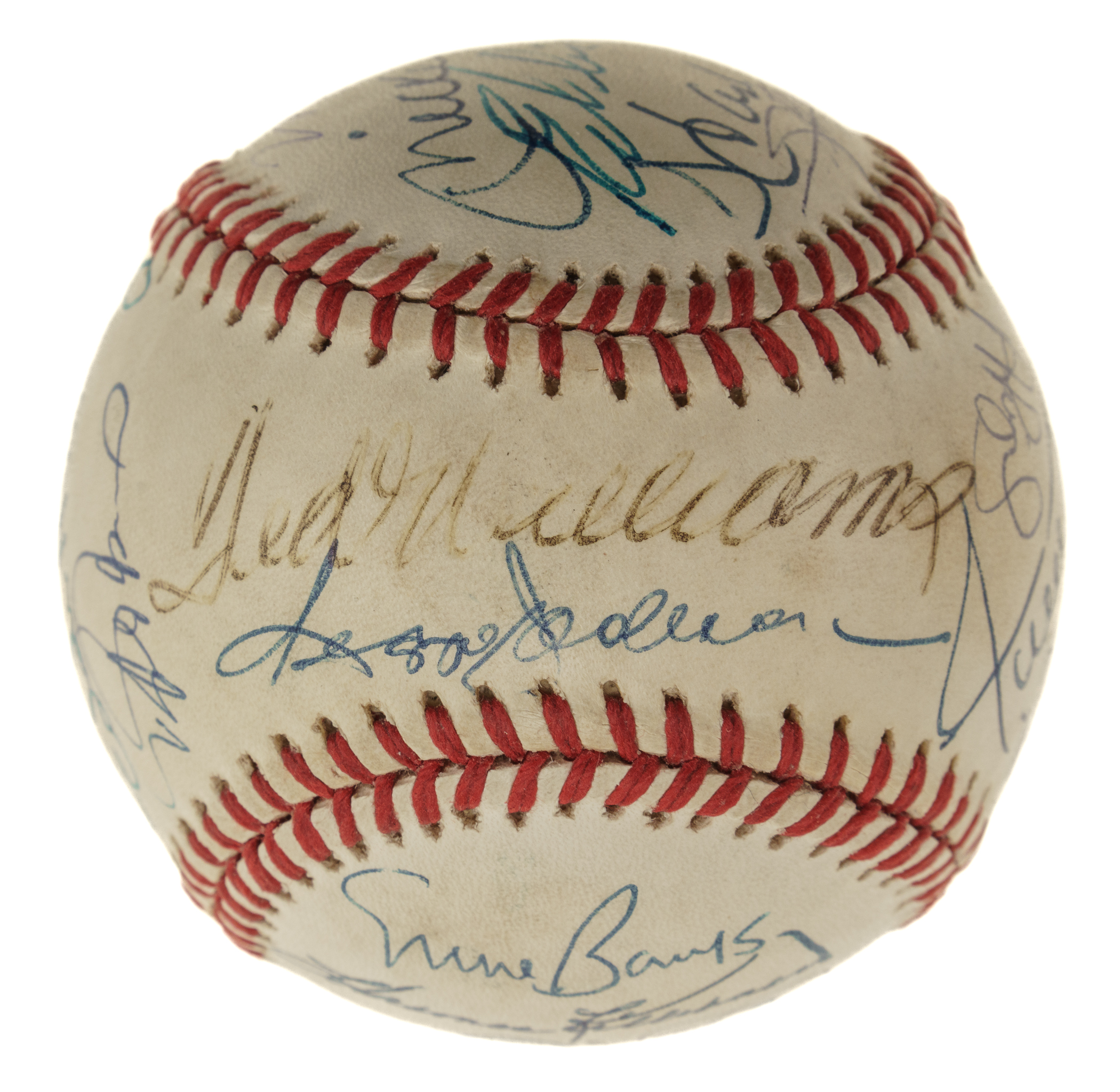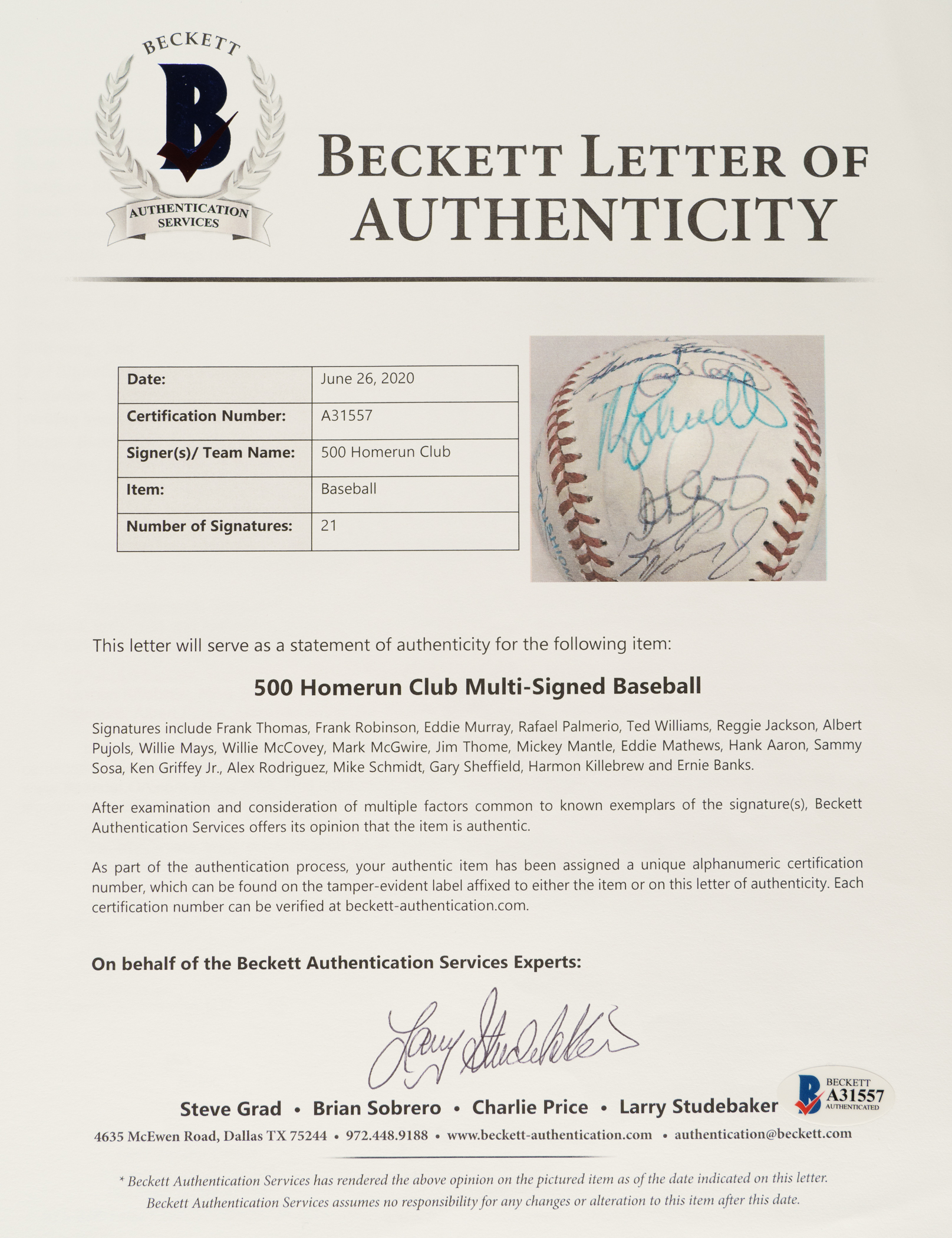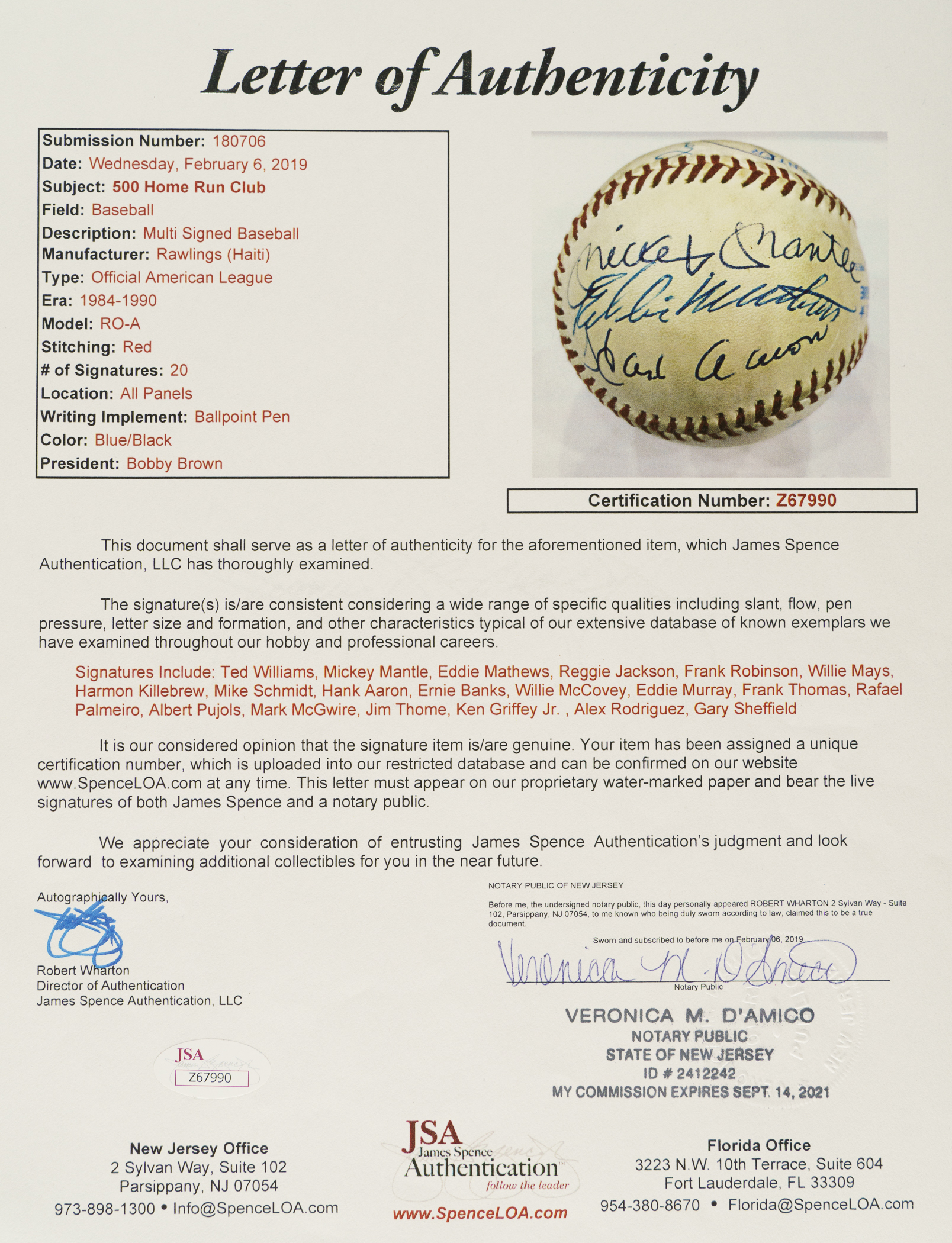 Official American League (Brown) signed primarily in ink by 20 of the 28 members of baseball's legendary 500 Home Run Club. This is a remarkable 500 Home Run Club ball, as it lacks only the signatures of Barry Bonds, Miguel Cabrera, David Ortiz, Manny Ramirez, and Sammy Sosa (all of whom are still alive and accessible to autograph collectors) for modern-day completeness (Ruth, Foxx, and Ott, the first three players to reach the 500 home-run plateau, passed away long before such theme balls were in vogue among collectors). The signatures presented here are those of Ted Williams (sweet spot), Reggie Jackson (sweet spot), Mickey Mantle, Eddie Mathews, Frank Robinson, Willie Mays, Harmon Killebrew, Mike Schmidt, Hank Aaron, Ernie Banks, Willie McCovey, Eddie Murray, Frank Thomas, Rafael Palmeiro, Albert Pujols, Mark McGwire, Jim Thome, Ken Griffey Jr., Alex Rodriguez, and Gary Sheffield. The ball is lightly toned throughout but is otherwise in Near Mint condition. This is an outstanding 500 Home Run Club ball and one that, with some effort, could certainly be completed by a dedicated collector. It should be noted that in our May 2010 auction, REA offered another 500 Home Run Club ball with 21 of the then 25 possible signatures (missing only Bonds for modern-day completeness) that realized a final sale price of $9,988 (Lot 1129). Given that result, and the enormous significance and extreme rarity of a fully signed modern-day example (we've never seen one), the quest to obtain the final five signatures on this ball (and there is room to add additional signatures) could prove to be a wise investment in time and resources for the winning bidder. Full LOA from James Spence/JSA. Full LOA from Steve Grad and Brian Sobrero/Beckett Authentication Services.