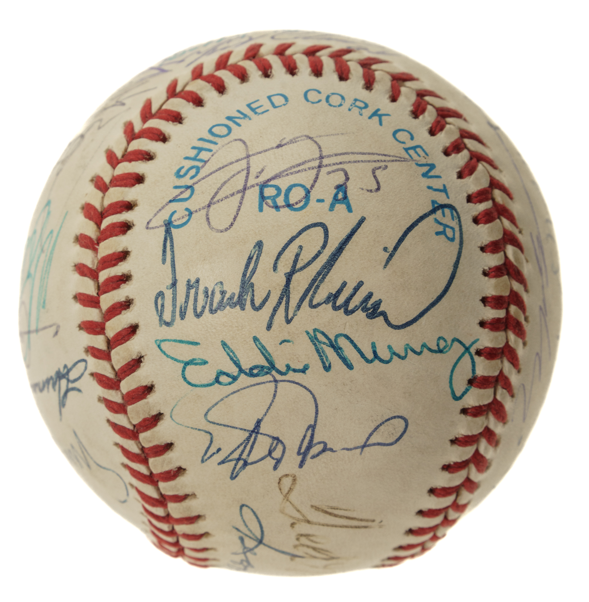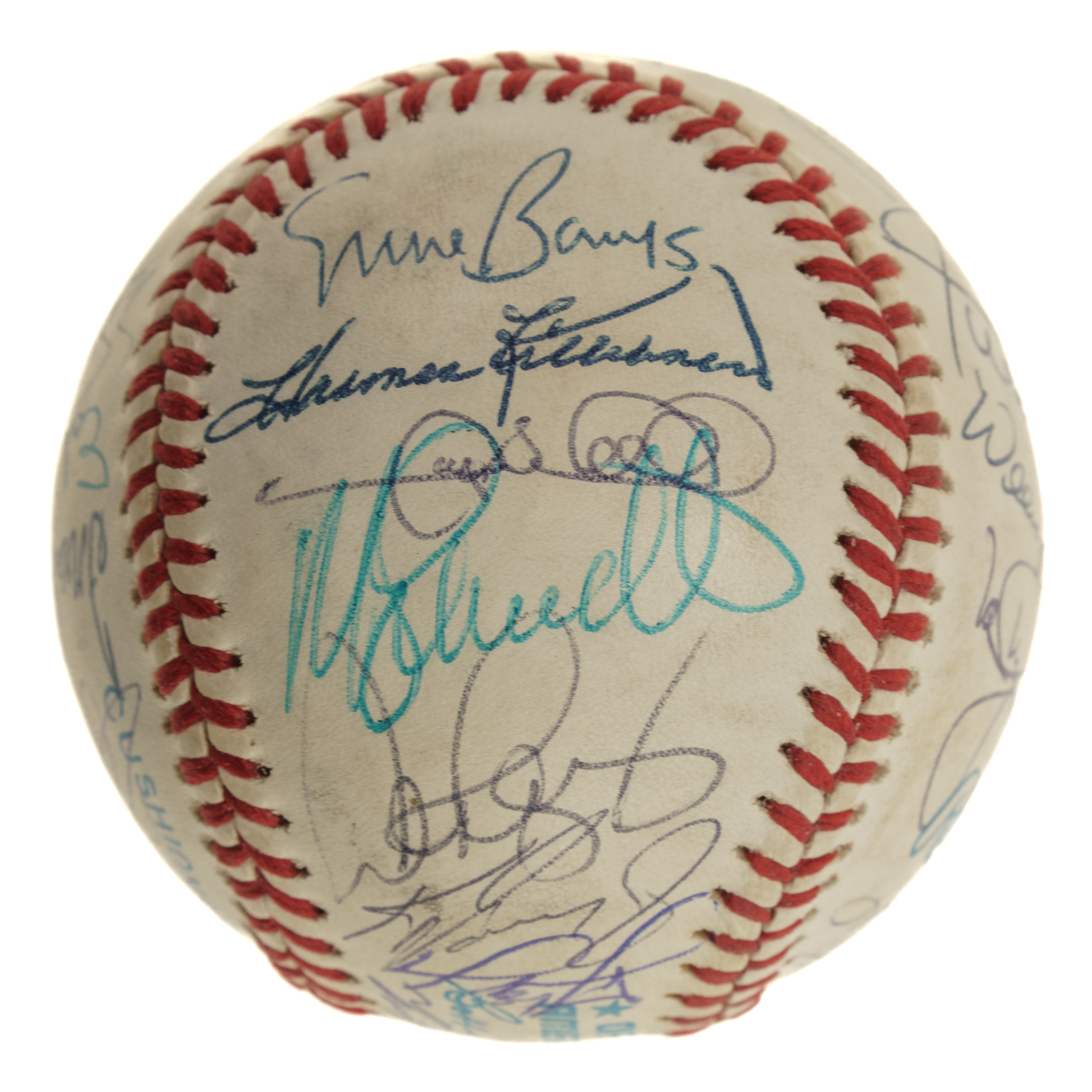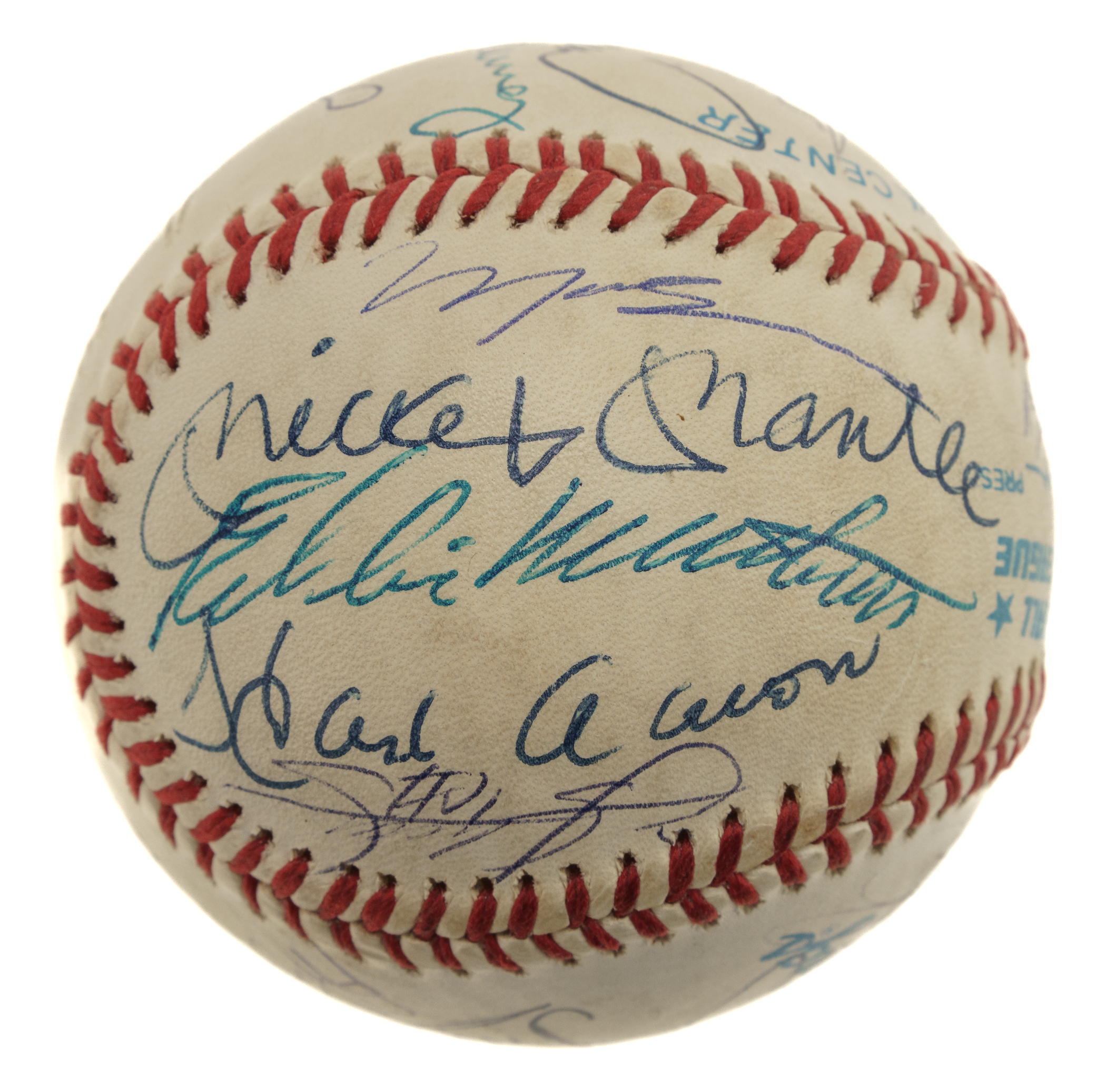Official American League (Brown) signed primarily in ink by 20 of the 28 members of baseball's legendary 500 Home Run Club. This is a remarkable 500 Home Run Club ball, as it lacks only the signatures of Barry Bonds, Miguel Cabrera, David Ortiz, Manny Ramirez, and Sammy Sosa (all of whom are still alive and accessible to autograph collectors) for modern-day completeness (Ruth, Foxx, and Ott, the first three players to reach the 500 home-run plateau, passed away long before such theme balls were in vogue among collectors). The signatures presented here are those of Ted Williams (sweet spot), Reggie Jackson (sweet spot), Mickey Mantle, Eddie Mathews, Frank Robinson, Willie Mays, Harmon Killebrew, Mike Schmidt, Hank Aaron, Ernie Banks, Willie McCovey, Eddie Murray, Frank Thomas, Rafael Palmeiro, Albert Pujols, Mark McGwire, Jim Thome, Ken Griffey Jr., Alex Rodriguez, and Gary Sheffield. The ball is lightly toned throughout but is otherwise in Near Mint condition. This is an outstanding 500 Home Run Club ball and one that, with some effort, could certainly be completed by a dedicated collector. It should be noted that in our May 2010 auction, REA offered another 500 Home Run Club ball with 21 of the then 25 possible signatures (missing only Bonds for modern-day completeness) that realized a final sale price of $9,988 (Lot 1129). Given that result, and the enormous significance and extreme rarity of a fully signed modern-day example (we've never seen one), the quest to obtain the final five signatures on this ball (and there is room to add additional signatures) could prove to be a wise investment in time and resources for the winning bidder. Full LOA from James Spence/JSA. Full LOA from Steve Grad and Brian Sobrero/Beckett Authentication Services.