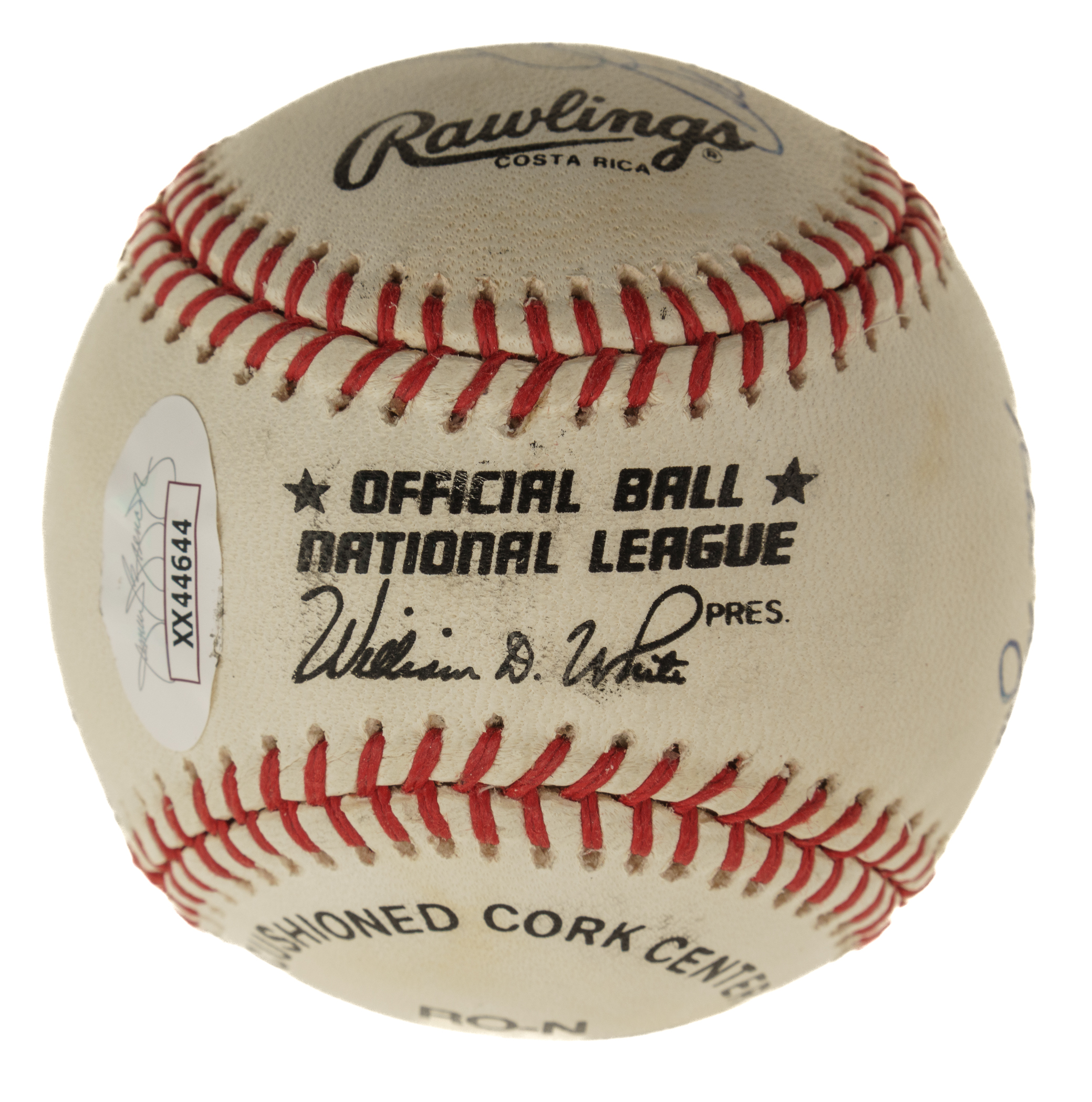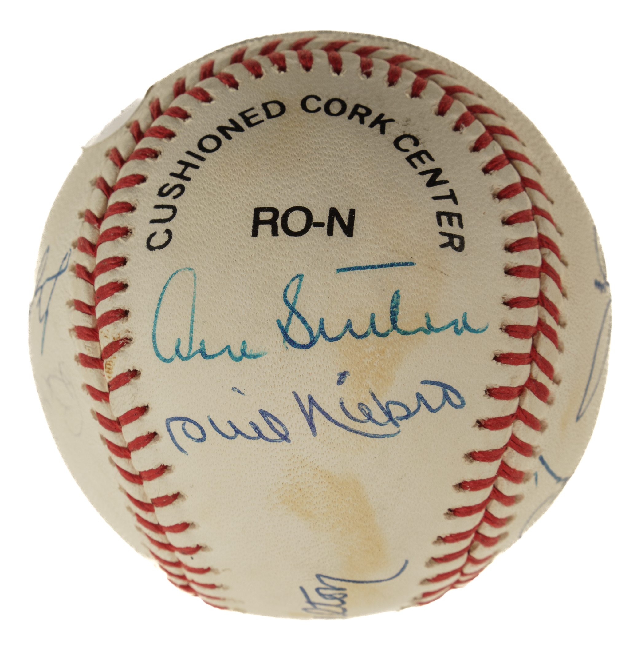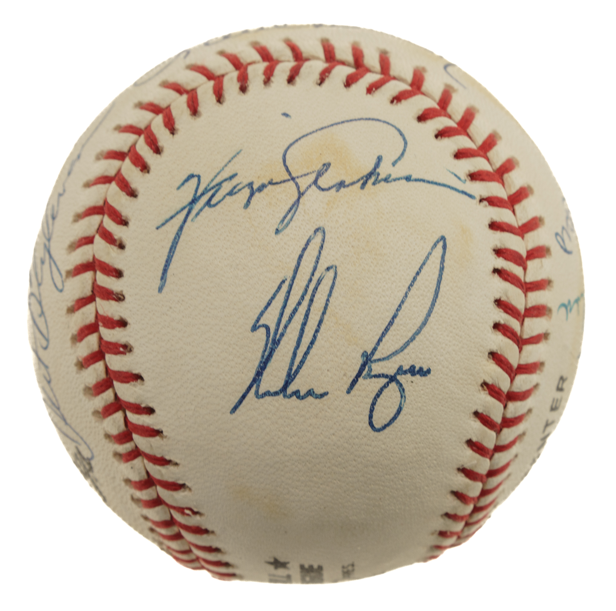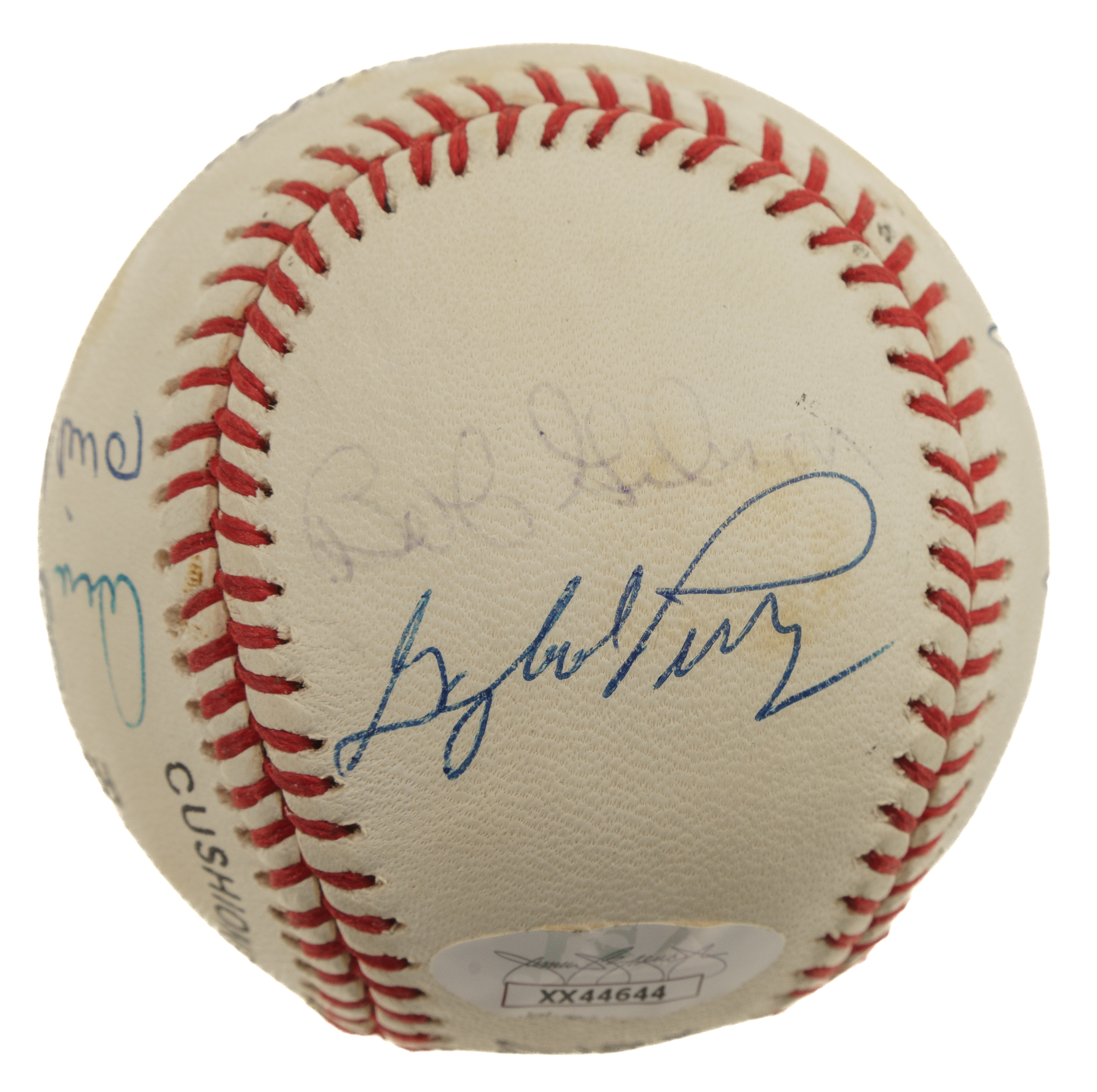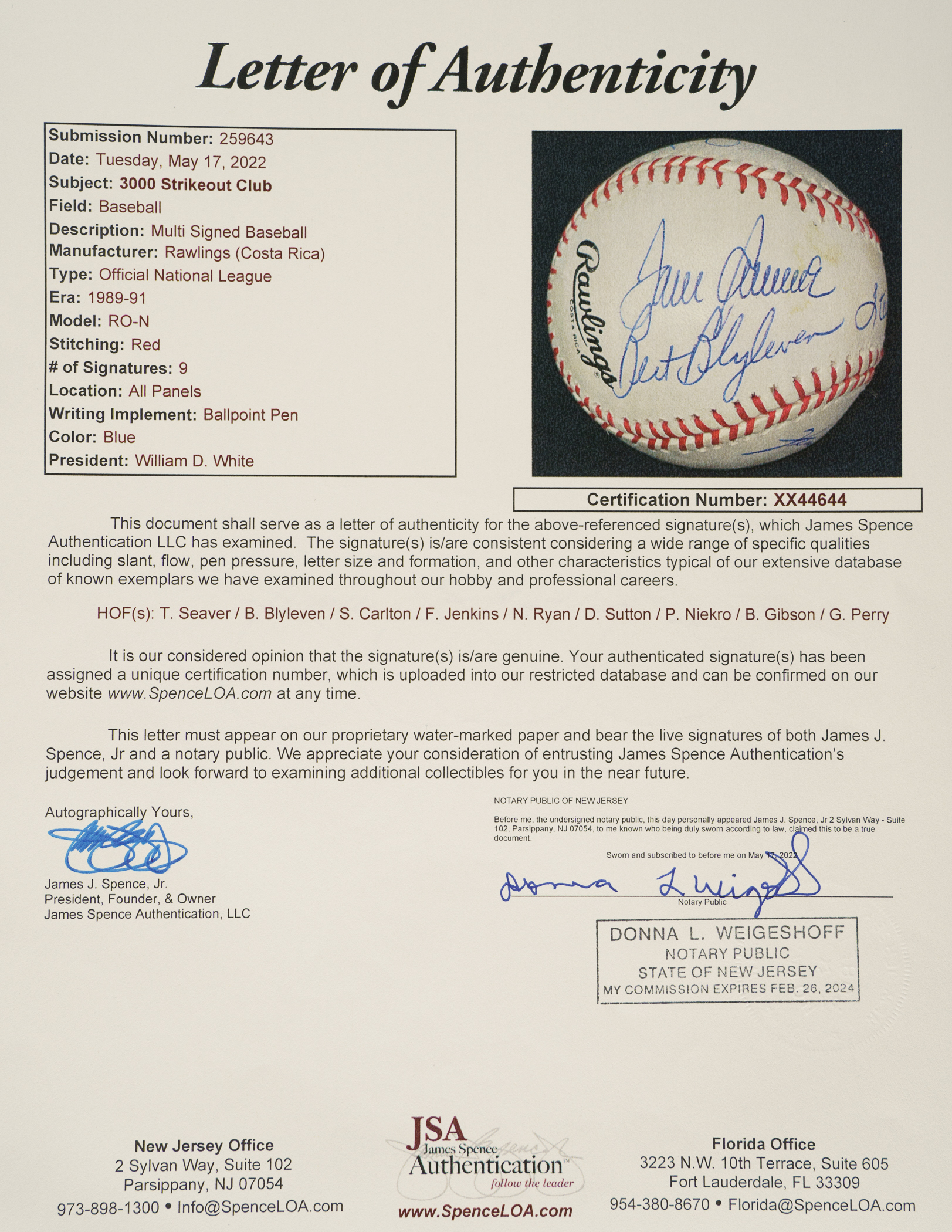 Official National League baseball (White) signed in blue ink by nine members of the elite 3,000 strikeout club. The ball is signed by Carlton (sweet spot), Seaver, Blyleven, Jenkins, Ryan, Sutton, Niekro, Gibson, and Perry. The ball displays scattered patches of moderate toning but is otherwise in Near Mint condition overall. Full LOA from James Spence/JSA. A James Spence/JSA certifcation sticker is affixed to the ball.