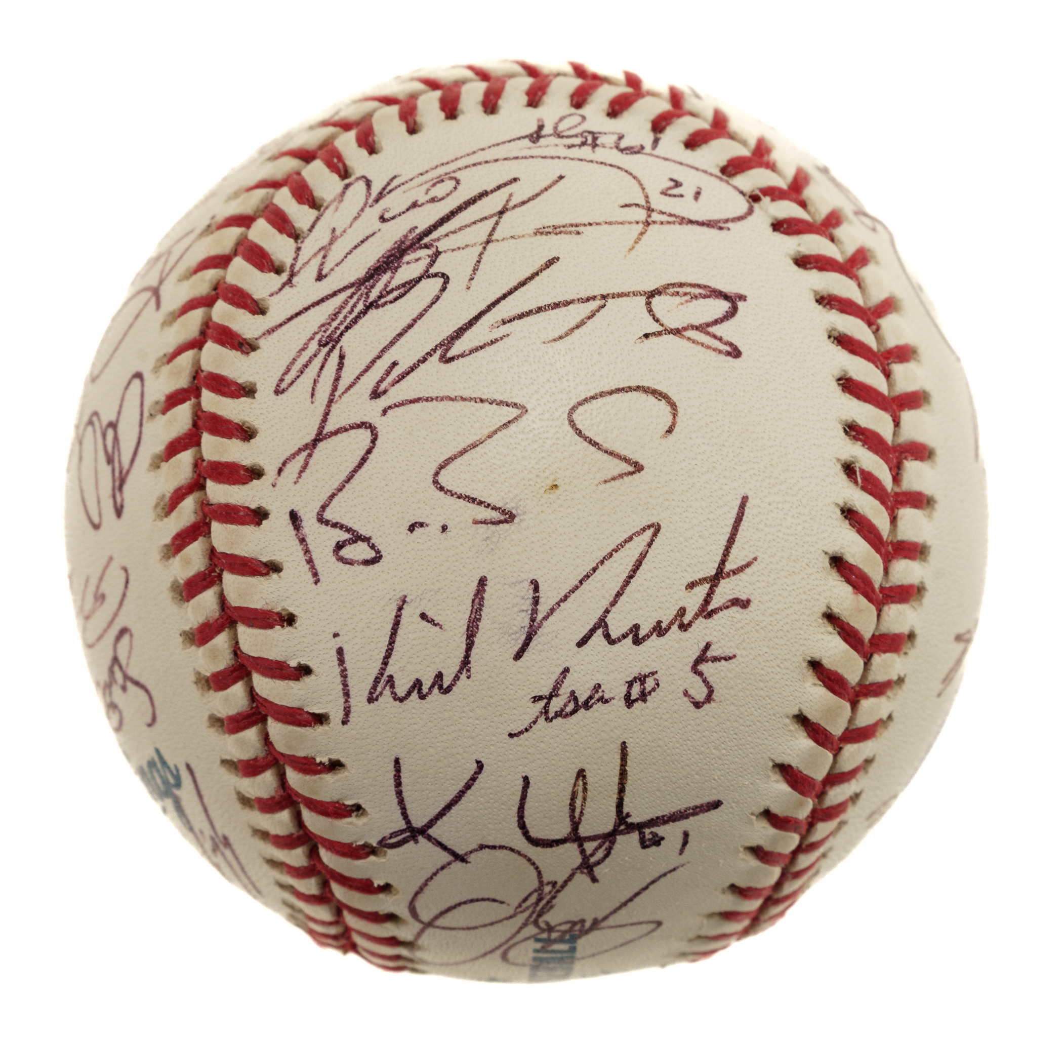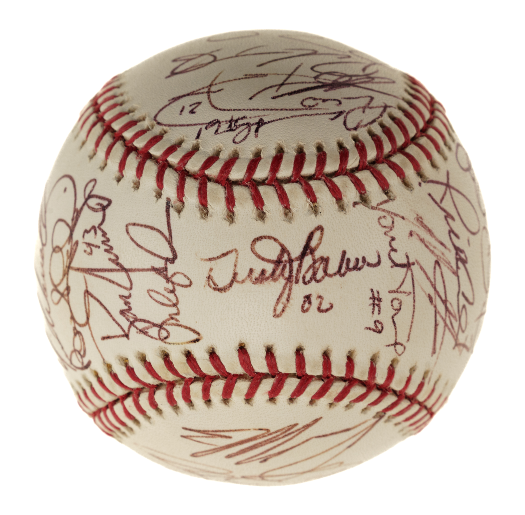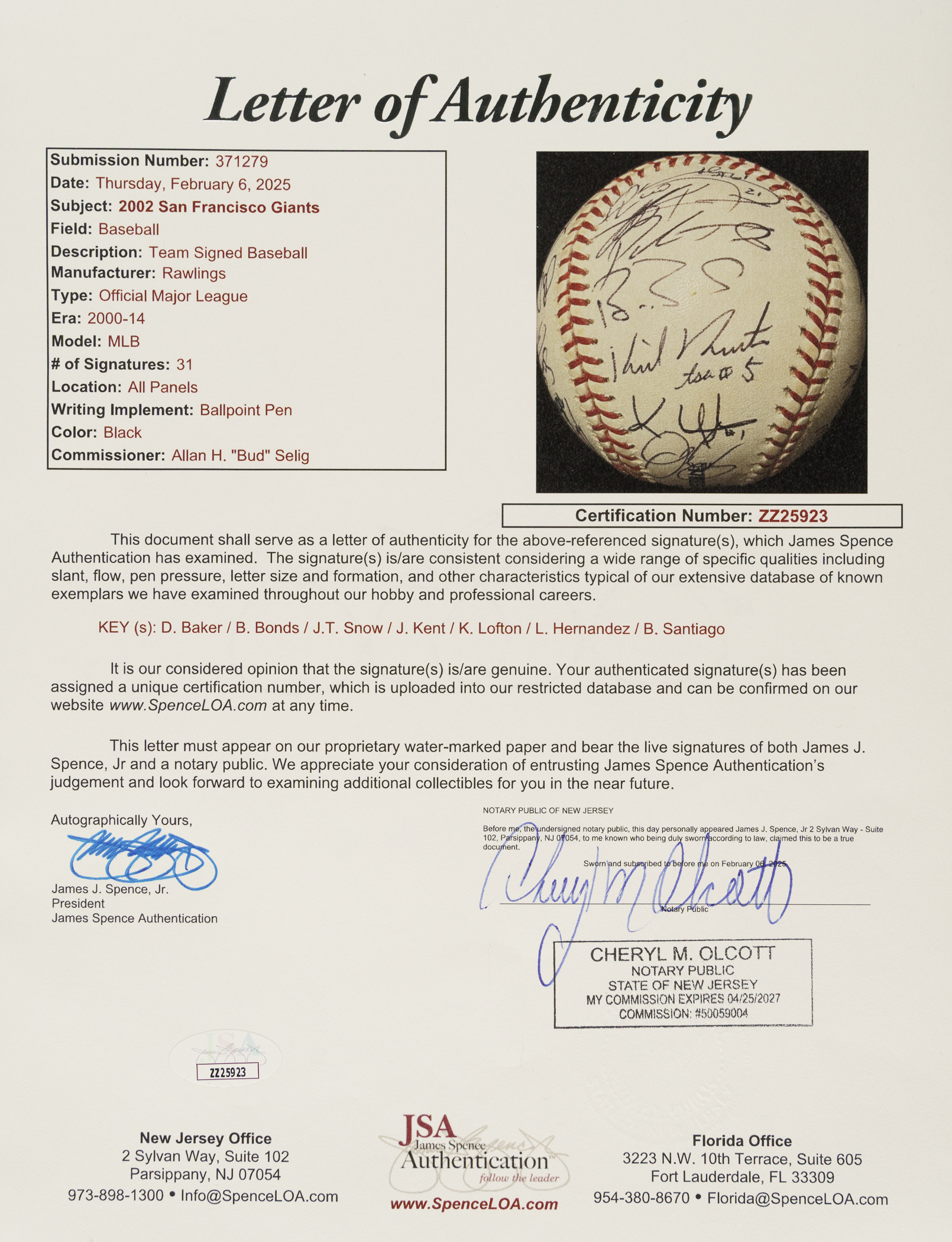 Official Major League baseball (Selig) signed in blue ink by 31 members of the 2002 National League Champion San Francisco Giants. Notable signatures include Baker (mgr., sweet spot, Bonds, Snow, Kent, Lofton, Hernandez, and Santiago. The ball is very lightly toned throughout but is otherwise in Near Mint condition overall. Full LOA from James Spence/JSA.