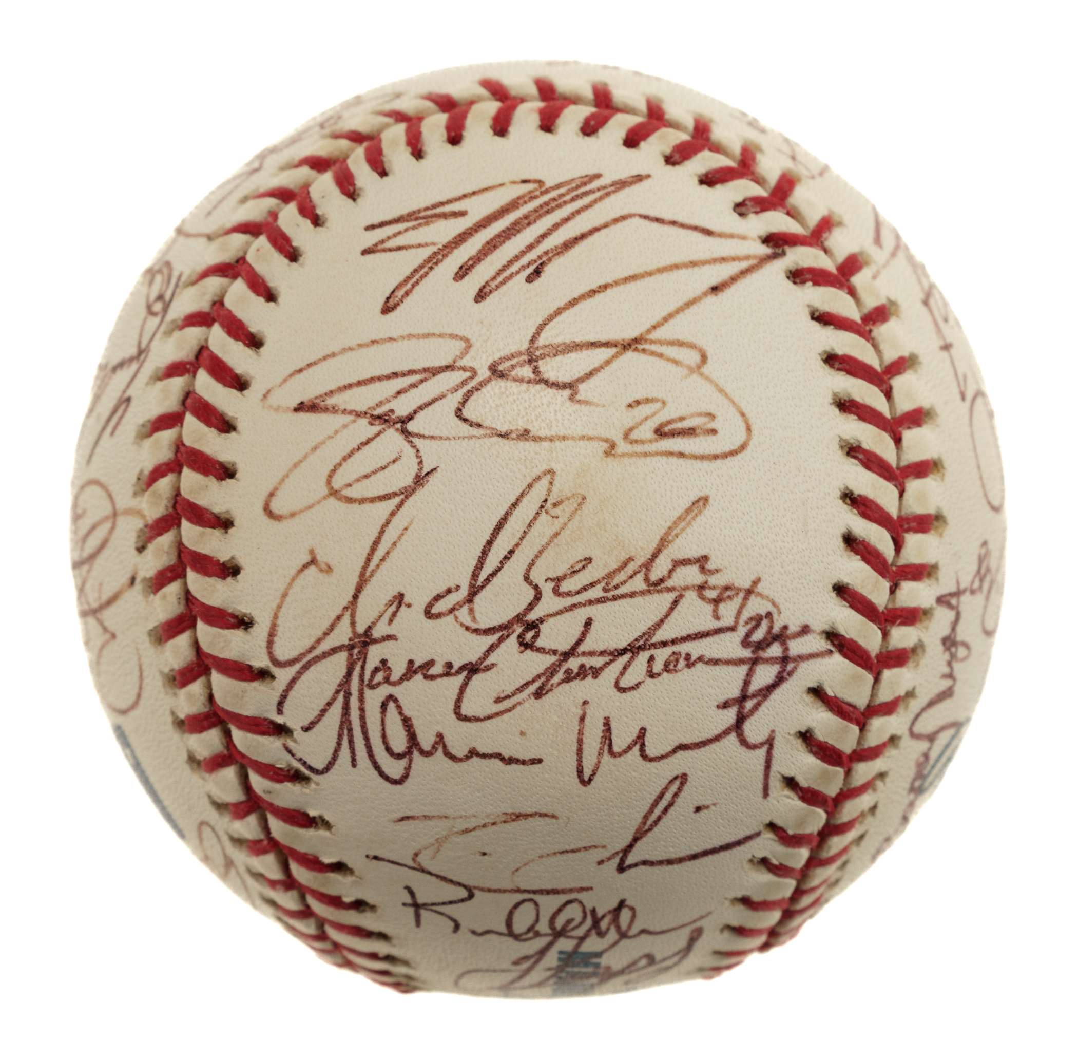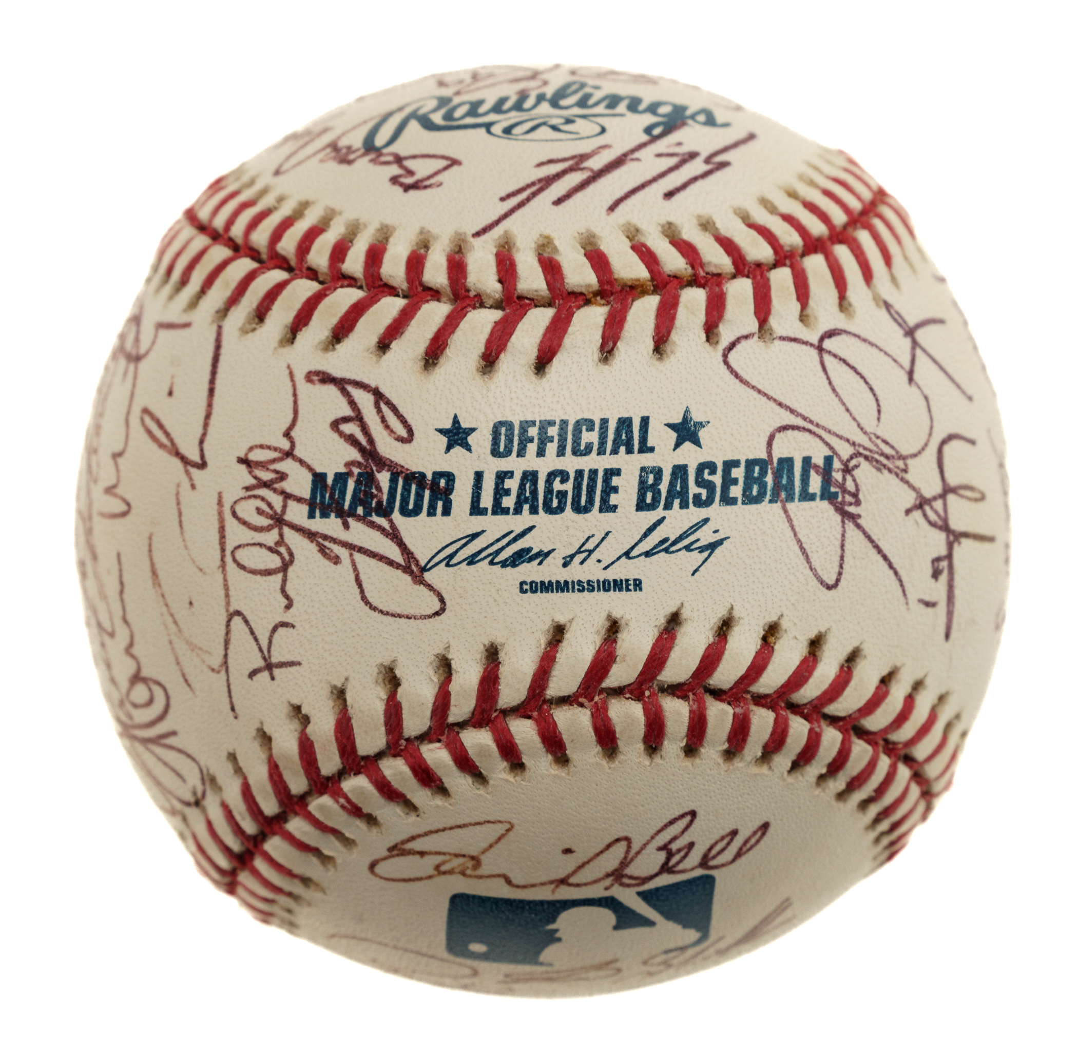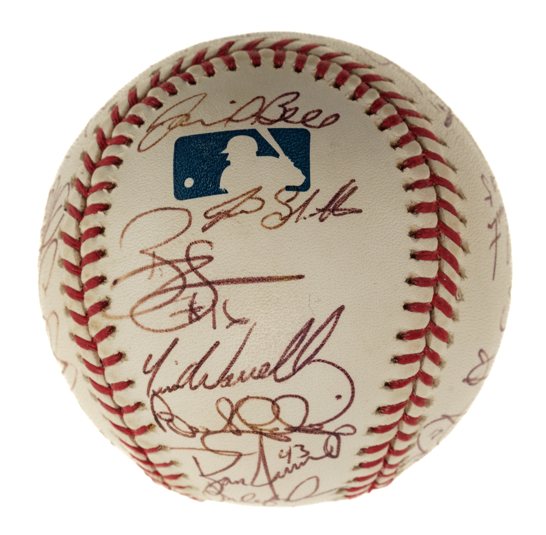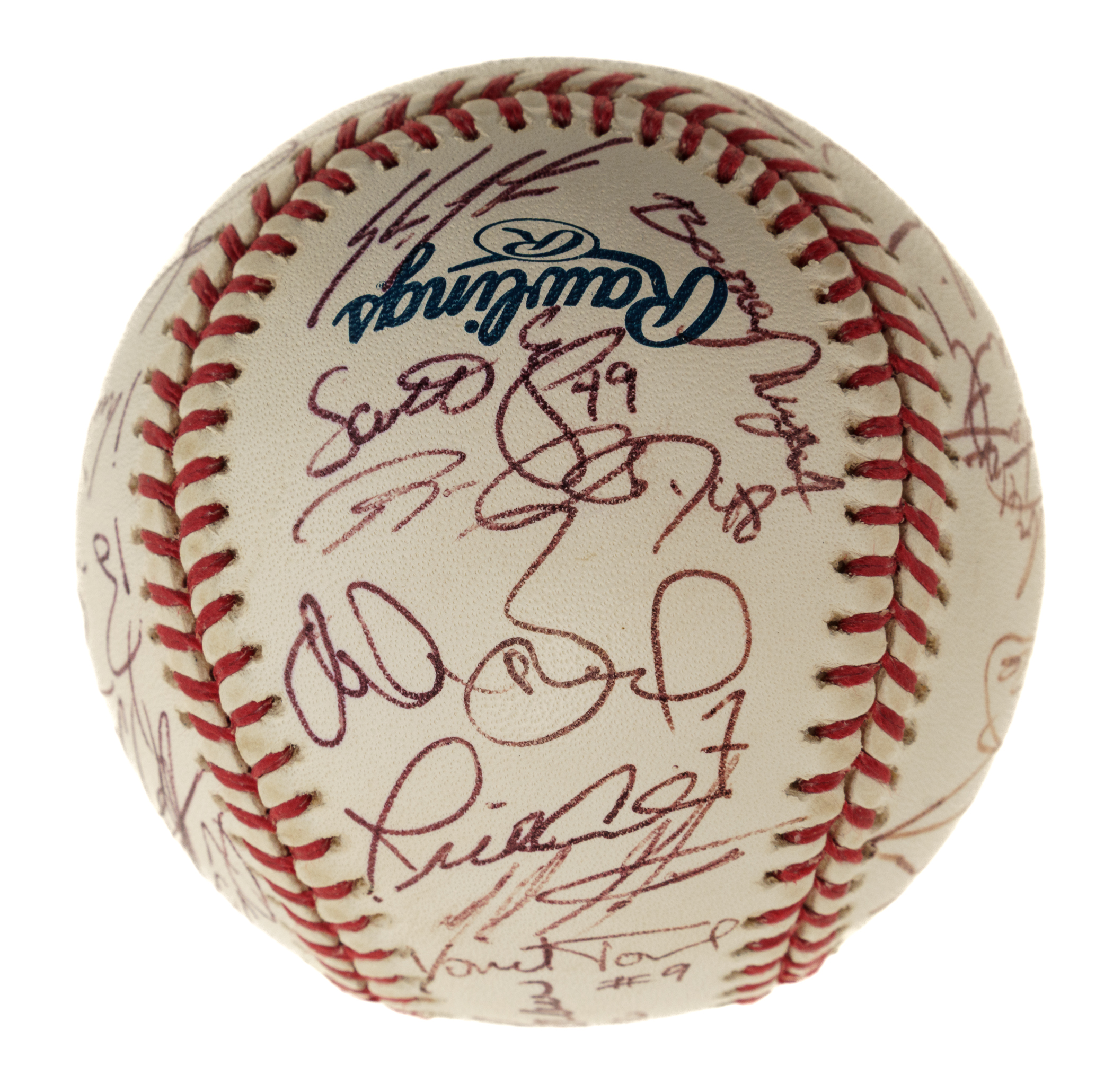 Official Major League baseball (Selig) signed in blue ink by 31 members of the 2002 National League Champion San Francisco Giants. Notable signatures include Baker (mgr., sweet spot, Bonds, Snow, Kent, Lofton, Hernandez, and Santiago. The ball is very lightly toned throughout but is otherwise in Near Mint condition overall. Full LOA from James Spence/JSA.