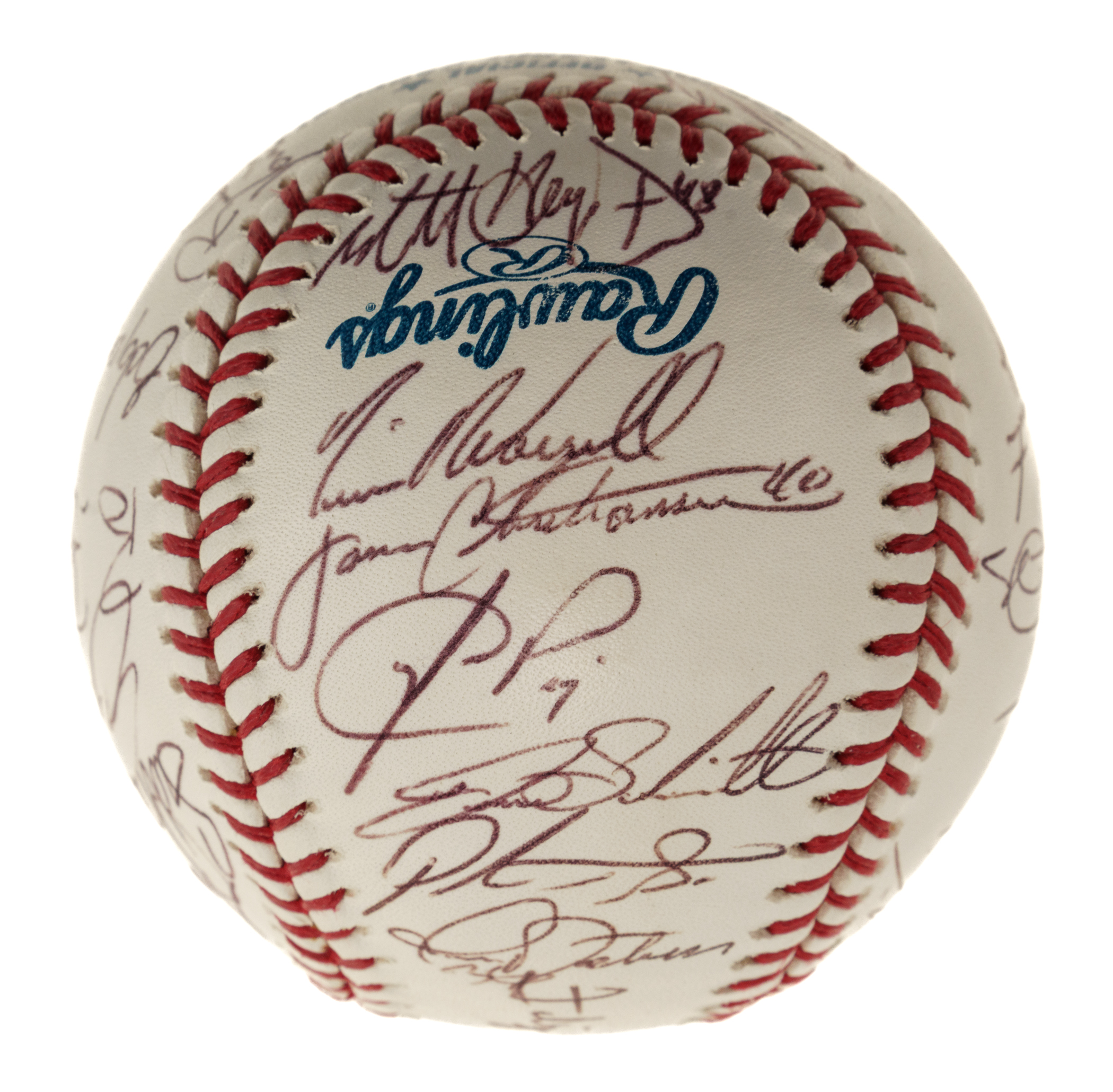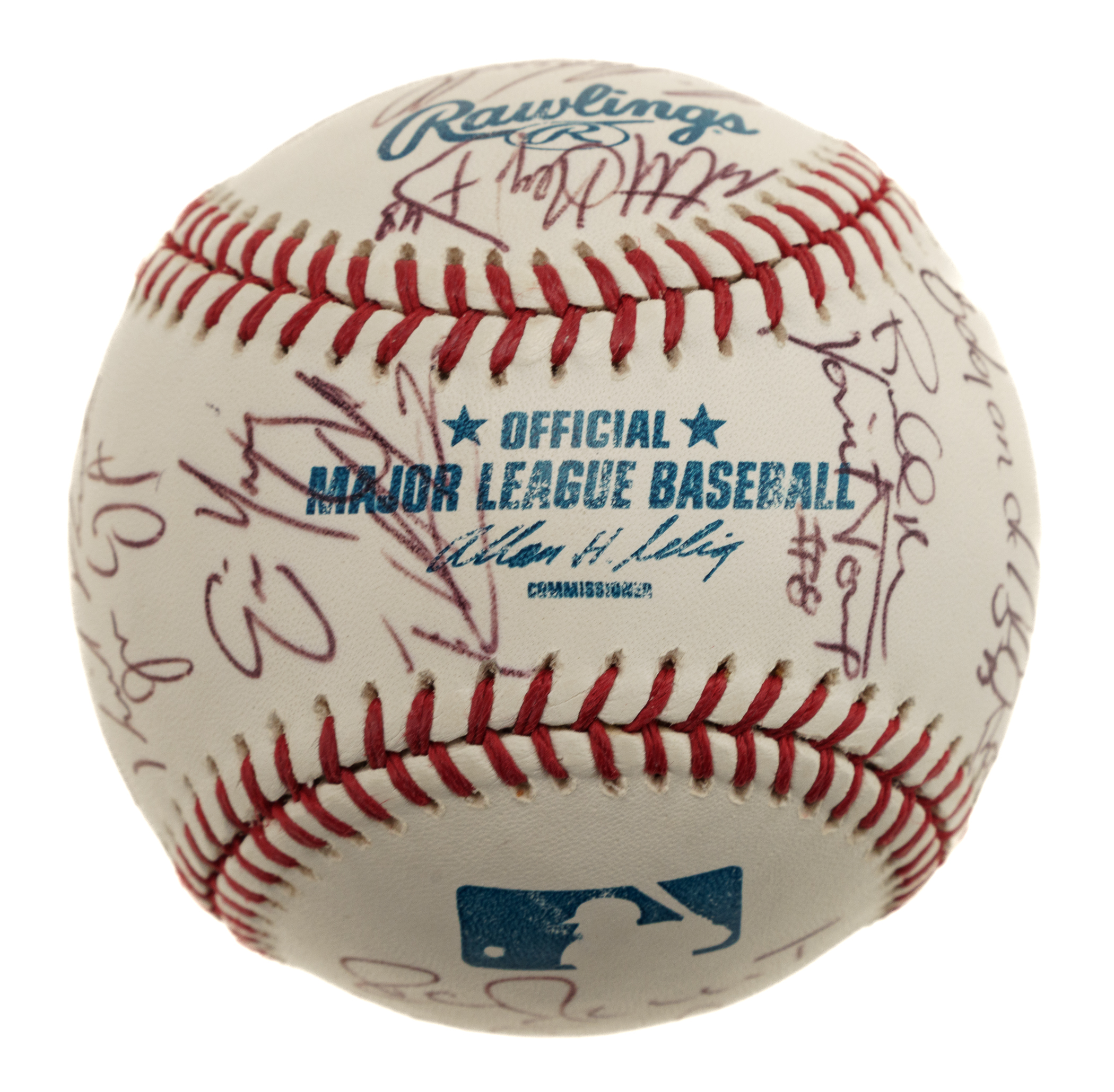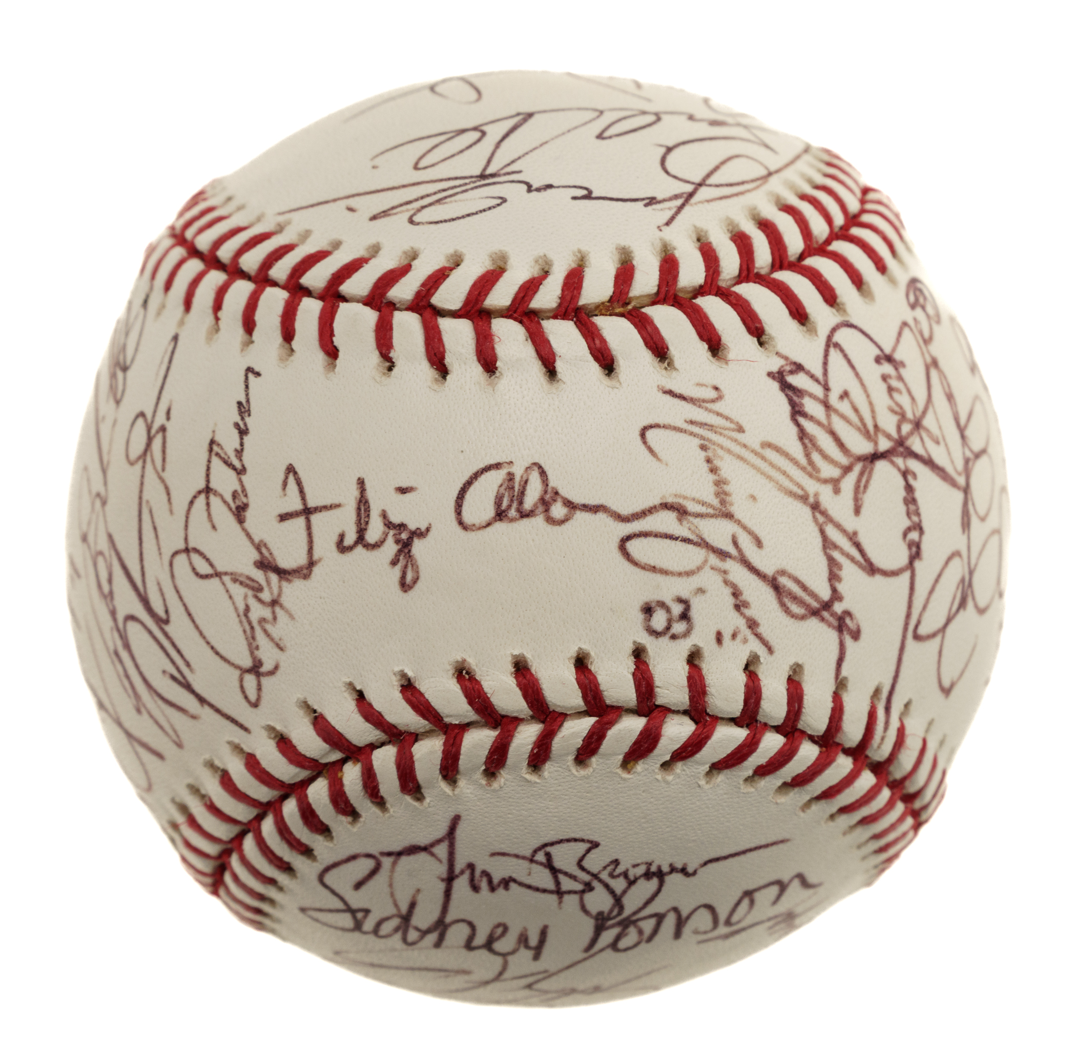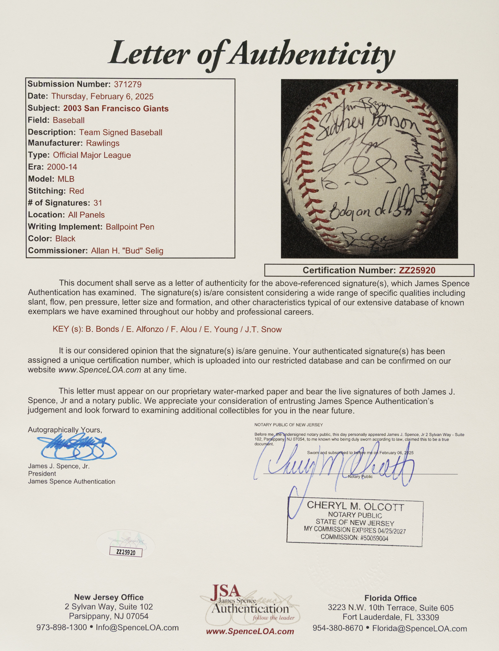 Official Major League baseball (Selig) signed in blue ink by 31 members of the 2003 San Francisco Giants. Notable signatures include Alou (mgr., sweet spot), Bonds, Alfonzo, Young, Snow, Schmidt, and Durham. Near Mint condition overall. Full LOA from James Spence/JSA.