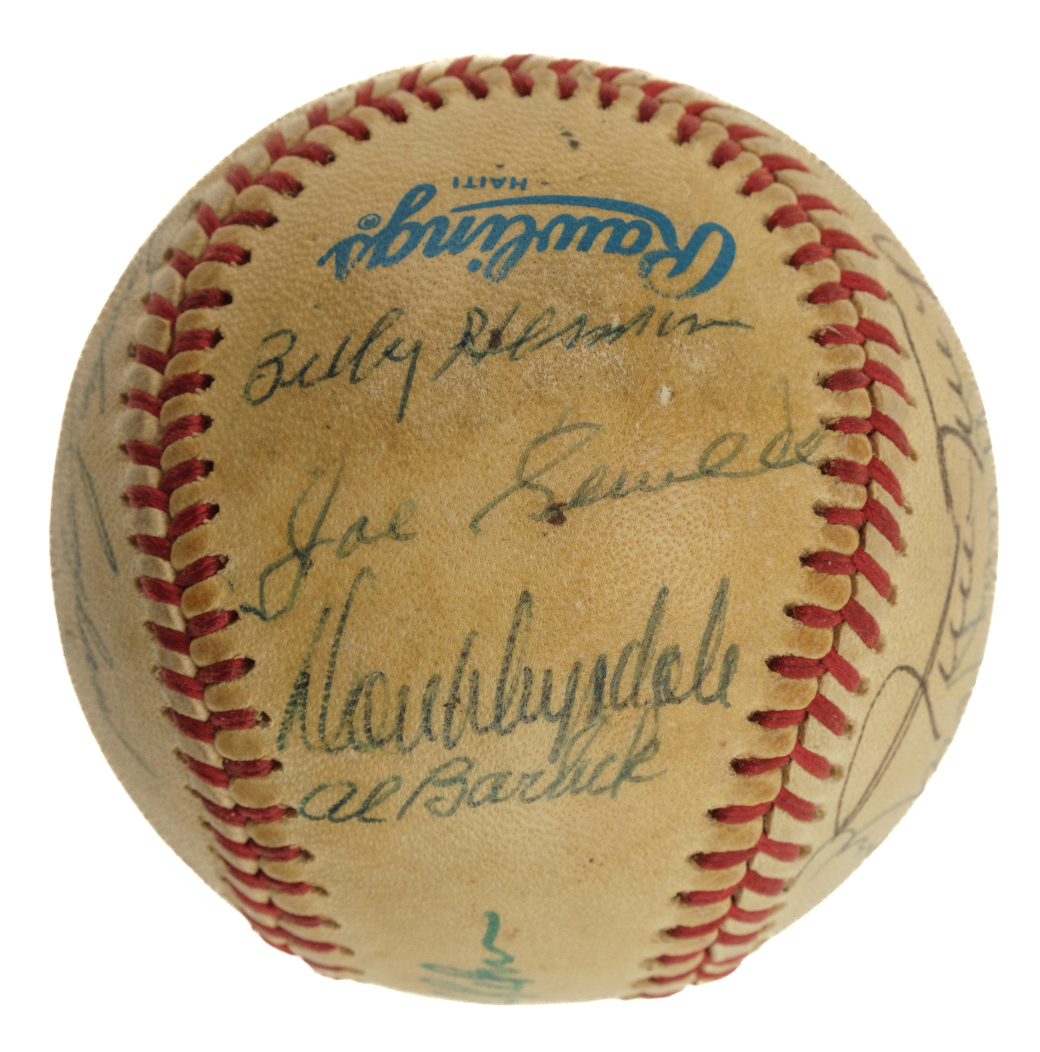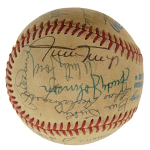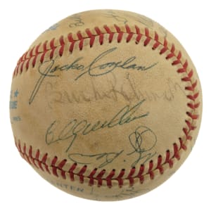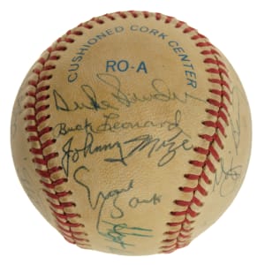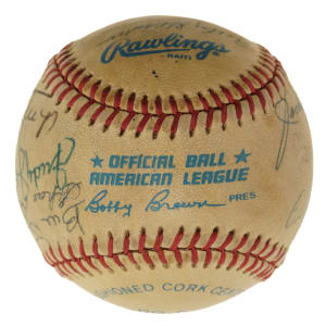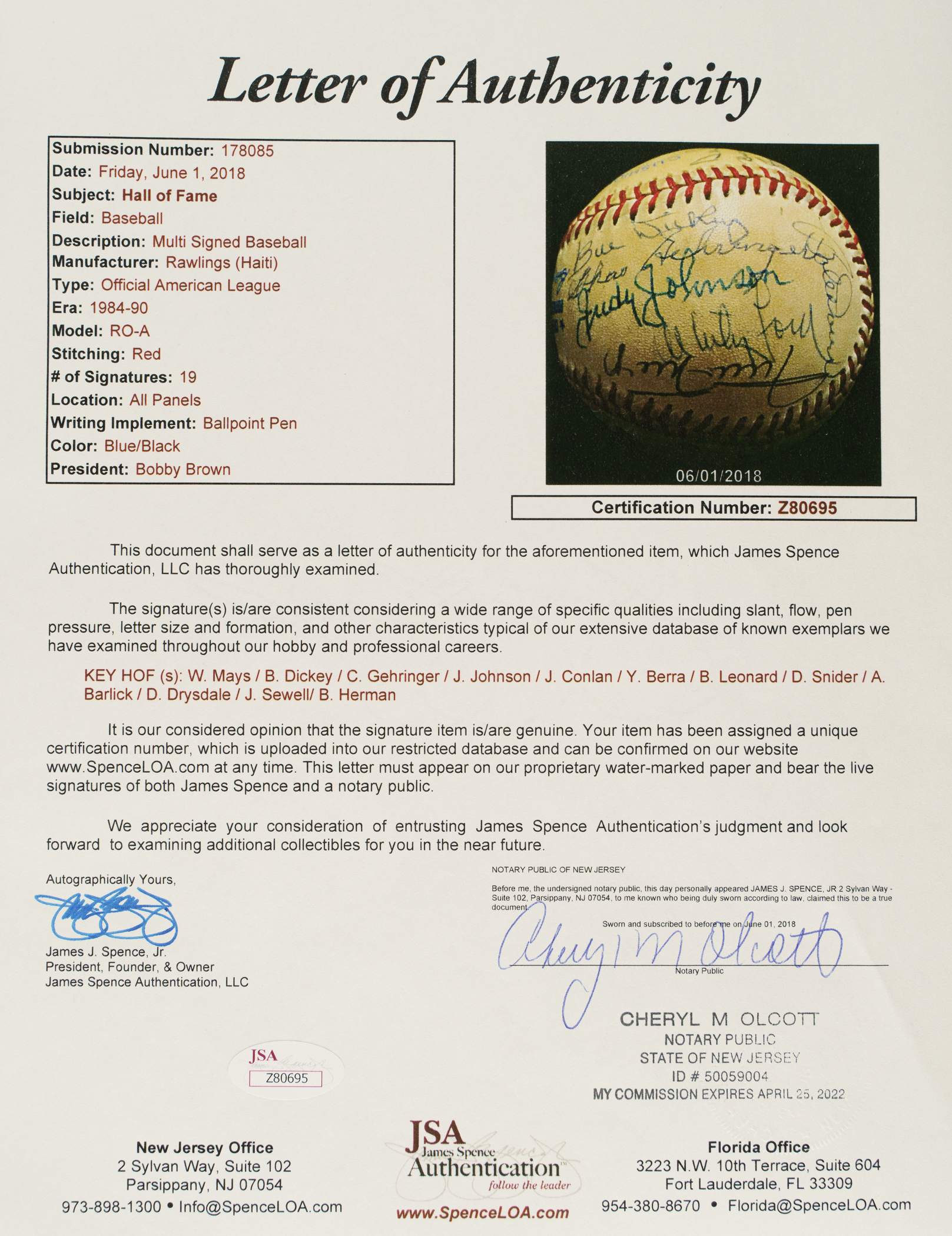 Official American League baseball (Brown) signed in blue and black ink by 19 Hall of Famers. The ball has been signed by Hoyt Wilhelm (sweet spot), Duke Snider, Buck Leonard, Johnny Mize, Ernie Banks, Billy Herman, Joe Sewell, Don Drysdale, Al Barlick, Jocko Conlan, Brooks Robinson, Billy Williams, Yogi Berra, Bill Dickey, Charlie Gehringer, Judy Johnson, Whitey Ford, Willie Mays, and Bobby Doerr. The ball is moderately toned throughout but is otherwise in Excellent condition overall. Full LOA from James Spence/JSA.