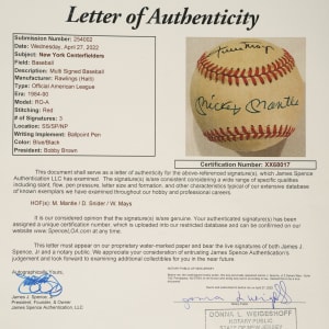 Official American League baseball (Brown) signed in blue and black ink by Mickey Mantle (sweet spot), Willie Mays, and Duke Snider. The ball displays light-to-moderate toning throughout but is otherwise in Near Mint condition overall. Full LOA from James Spence/JSA.