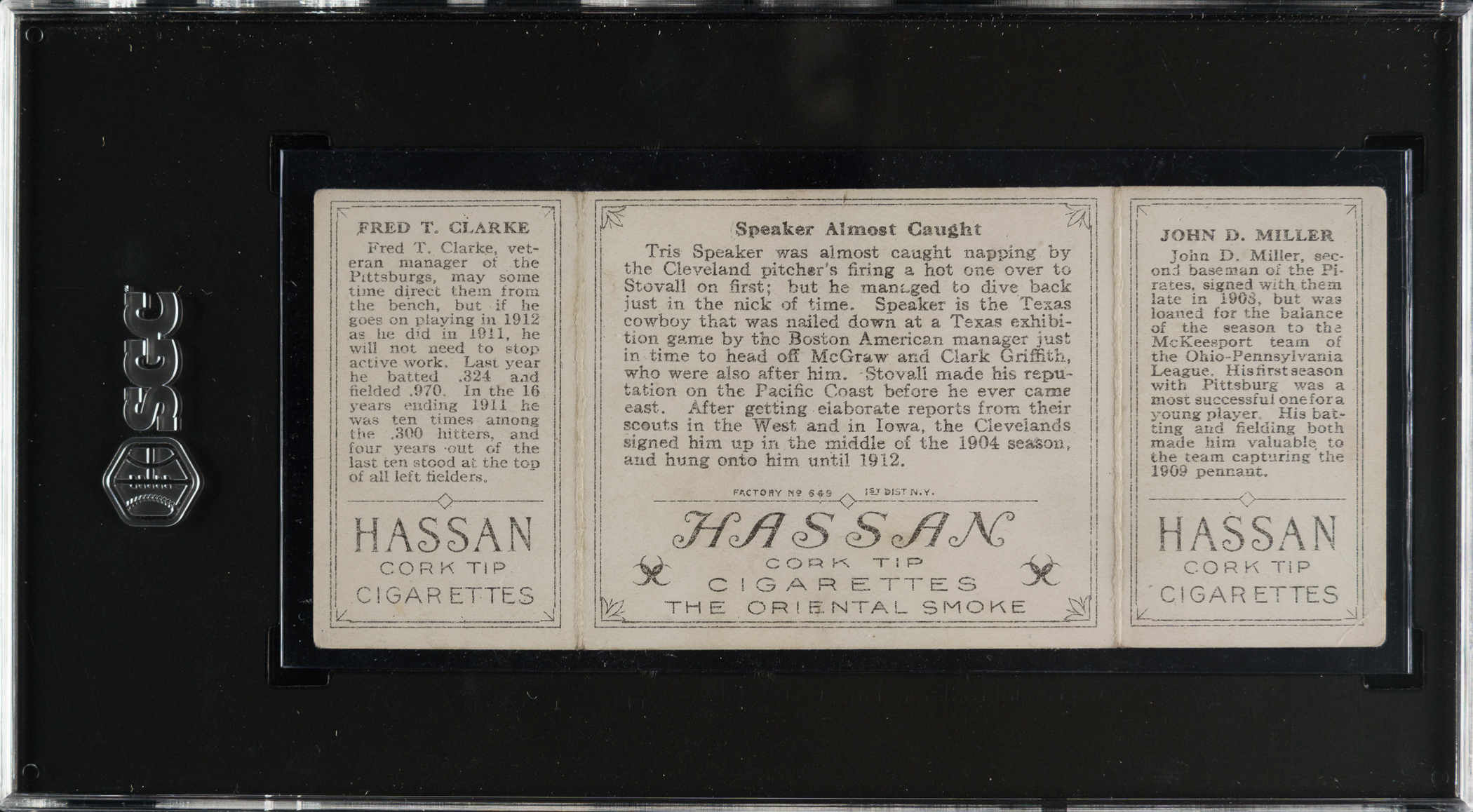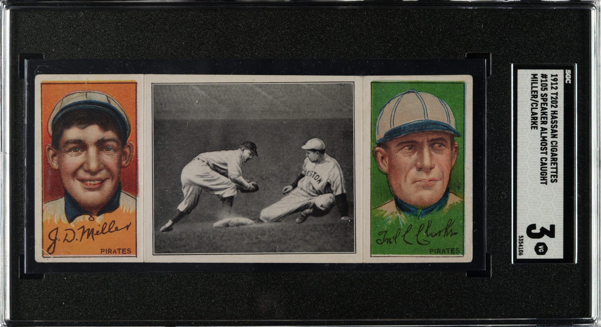 Lot # 883: 1912 T202 Hassan Triple Folder "Speaker Almost Caught" Fred Clarke/Miller SGC VG 3