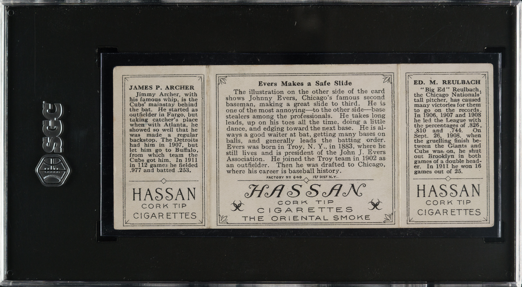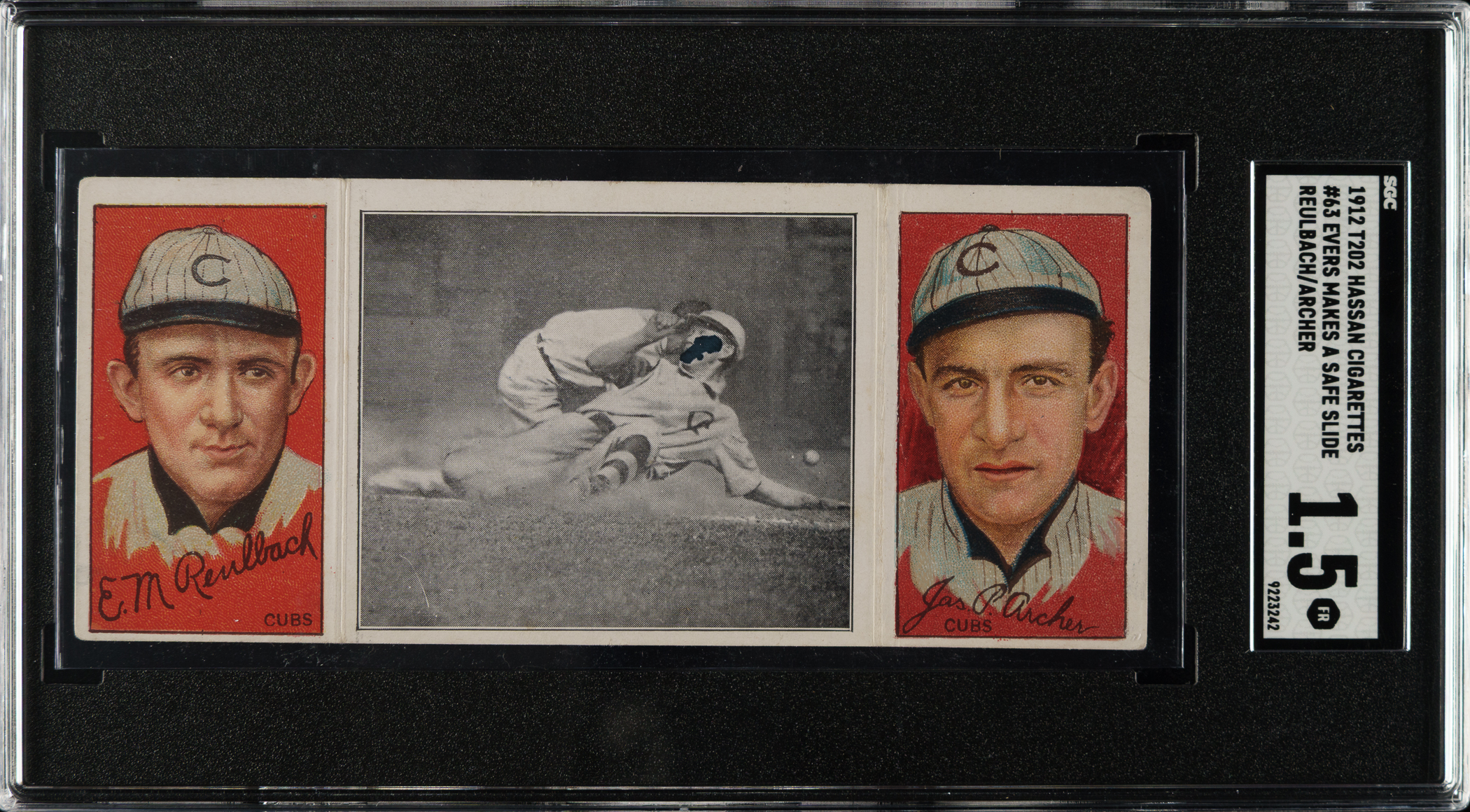 Lot # 860: 1912 T202 Hassan Triple Folder "Evers Make A Safe Slide" Archer/Reulbach SGC FAIR 1.5