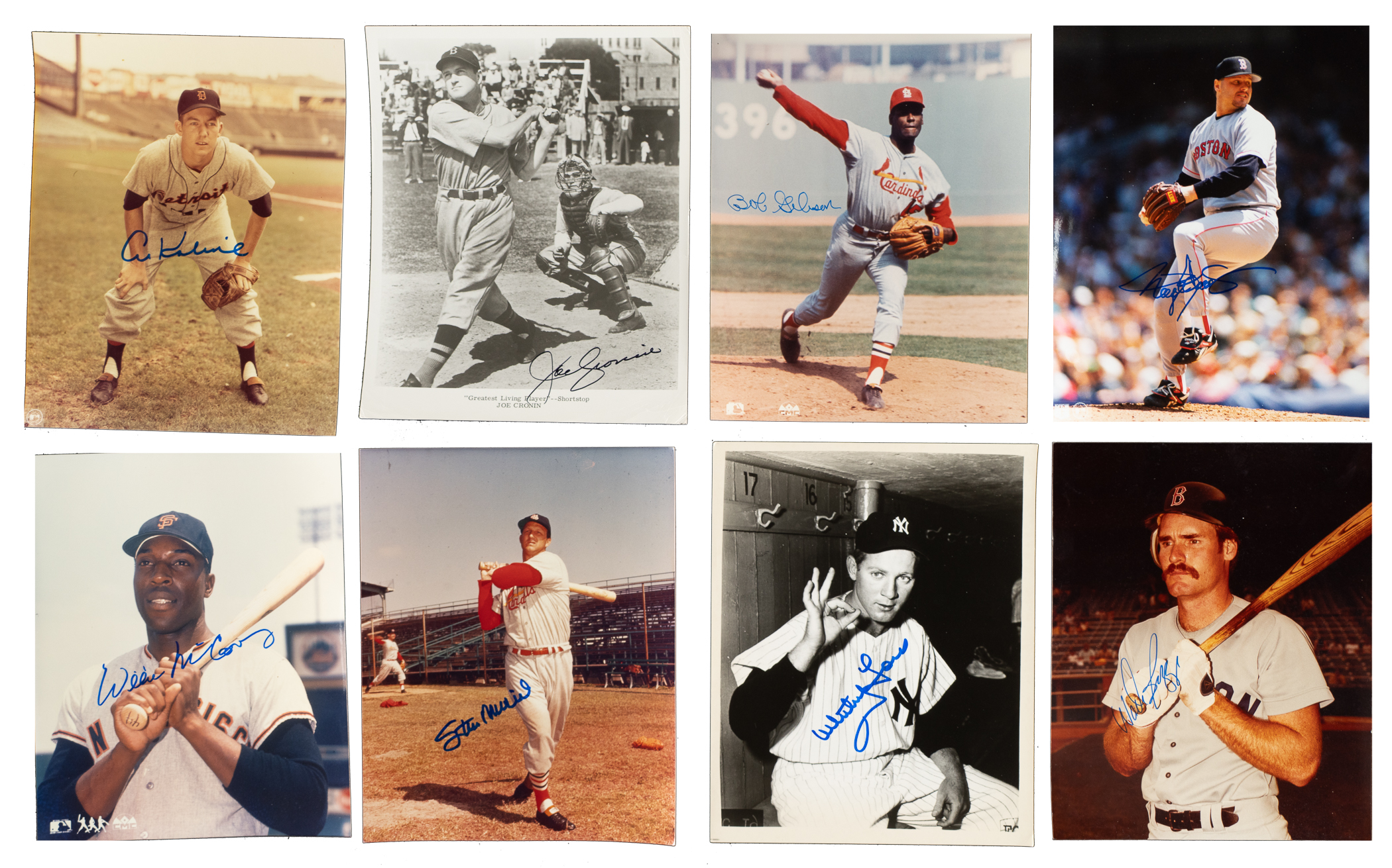 Presented is a collection of 145 Hall of Fame and star signed baseball photographs, both color and black-and white, each signed on the front by the player pictured. The signatures are scripted in a variety of inks. The photographs are modern prints (8 x 10 inches) and are in Excellent to Near Mint condition overall (with a few slightly lesser). This collection consists of the following: Allen, B. Allison, Anderson, Aparicio, two Appling, Ashburn, two Banks, Barlick, Bauer, Bench, two Berra, E. Blackwell, Boggs, Boudreau, Brett, two Brock, Buhner, Burnitz, Campaneris (1972-73-74 World Champion Oakland As), Cano, Carew, Carlton, G. Carter, Cepeda, Cey, Chambliss, Chandler, two J. Clark, Clemens, Coates, Cone, Cronin, Crosetti, Damon, Dandridge, Dawson, Dickey, two Doerr (one HOF 86), Downing, Drysdale, Durocher, Dykstra, Erskine (Not Hit Cubs 6/19/52, No Hit Giants 5/12/56), two Feller, Fingers, B. Fisher, three Ford, M. Garcia, two Gehringer, Gibson, Juan Gonzalez, Hanson, D. Harvey (umpire), Herman, Hubbell, two Hunter, Irvin, R. Jackson, Ripken Jr., Kaline, two Kell, Killebrew, Kiner, Lemon, Liriano, Lopat, Lyons, Marichal, Marion, three Mathews, McCovey, McLain, McReynolds, Mize, two Musial, Niekro, Ott, two Palmeiro, two Palmer, Parrish, Perez, G. Perry, J. Perry, Raines, Randolph, Rice, Rivers, Roberts, B. Robinson, two F. Robinson, Roush, Ruffing, Ryan, Schoendienst, G. Scott, Seaver, J. Sewell, L. Sewell, Skowron, three Slaughter, O. Smith, R. Smith, two Snider, M. Soto, two Spahn, Stephenson, Sutton, M. Tejada, Terry, F. Thomas, Thome, Vaughn, Weaver, Werber, Wilhelm, Billy Williams, Bernie Williams, Wills, M. Wilson, Winfield, Woodling, and two Wynn. Total: 145 photographs. Auction LOA from James Spence/JSA.