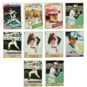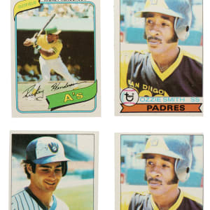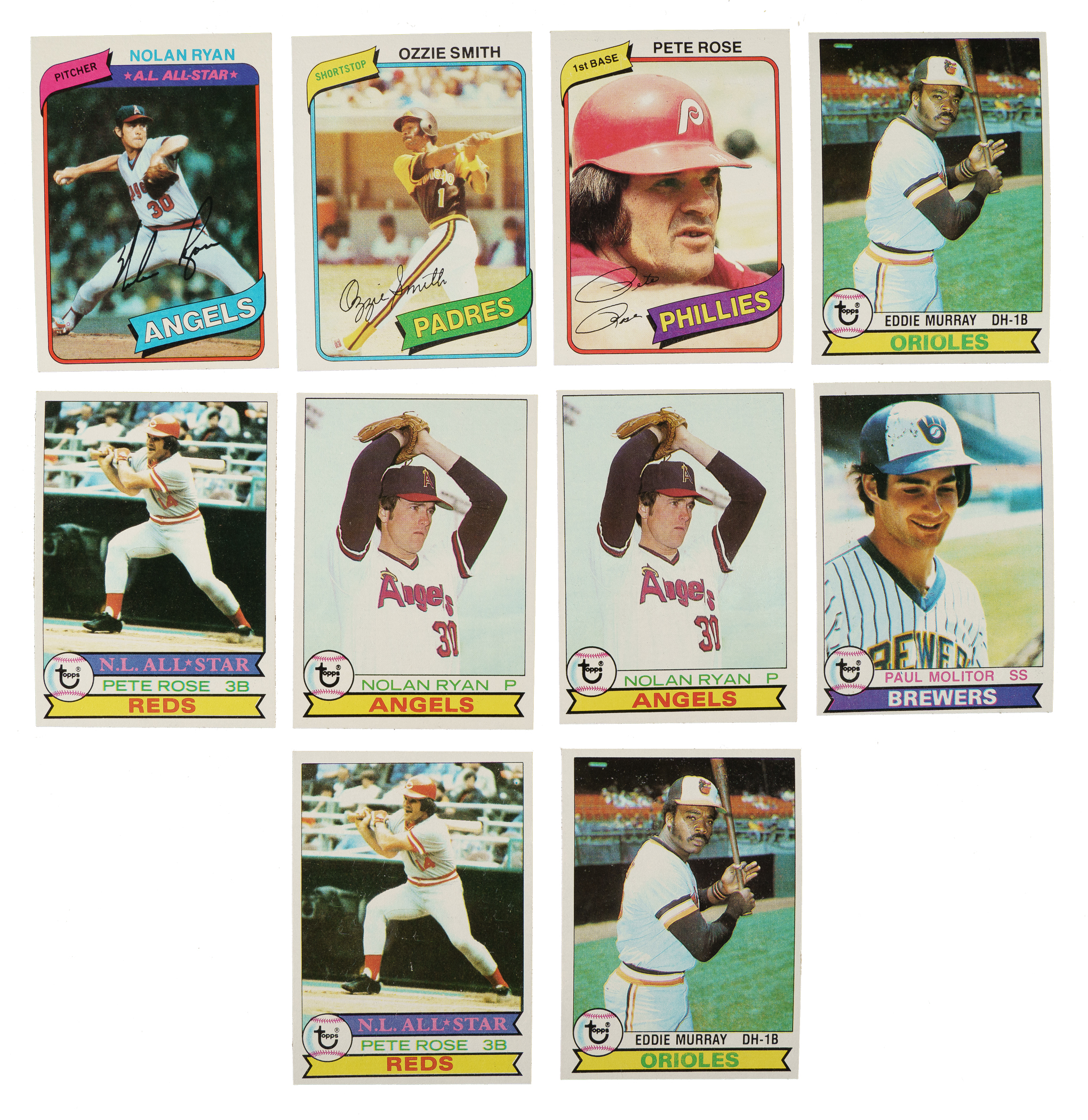 Impressive collection of three complete Topps baseball sets from 1979 (two) and 1980. Each set offers numerous highlights, including the key rookie cards of Hall of Famer: Rickey Henderson and Ozzie Smith. This collection consists of the following: 1) 1979 Complete Set (726): Condition is 47% Nr/Mt to Nr/Mt-Mt (including a few Mint) and 53% Ex to Ex-Mt (including 4% slightly lesser). Keys: #24 Molitor (Nr/Mt), 115 Ryan (Ex+), 116 Smith RC (99/1 L/R, otherwise Nr/Mt), 640 Murray (Nr/Mt), and 650 Rose (Nr/Mt-Mt). 2) 1979 Complete Set (726): Condition is 35% Nr/Mt to Nr/Mt-Mt (approximately two-thirds Nr/Mt and including some bordering on Mint), 54% Ex to Ex-Mt, and 11% Vg to Vg-Ex (including a couple lesser). Keys: #24 Molitor (Ex), 115 Ryan (Ex-Mt due to centering), 116 Smith RC (99/1 L/R, otherwise Nr/Mt), 640 Murray (70/30 L/R, otherwise Nr/Mt), and 650 Rose (Ex-Mt). 3) 1980 Complete Set (726): Condition is 47% Nr/Mt to Nr/Mt-Mt (including a few Mint), 46% Ex to Ex-Mt, and 7% Vg to Vg-Ex. Keys: #393 Smith (Ex due solely to centering), 482 Henderson RC (Nr/Mt), 540 Rose (Nr/Mt), and 580 Ryan (Nr/Mt+ due to centering). This is a very attractive mid- to high-grade Topps complete-set collection. Total: 2,178 cards. The size/weight of this item requires that there will be an additional shipping charge for this lot.