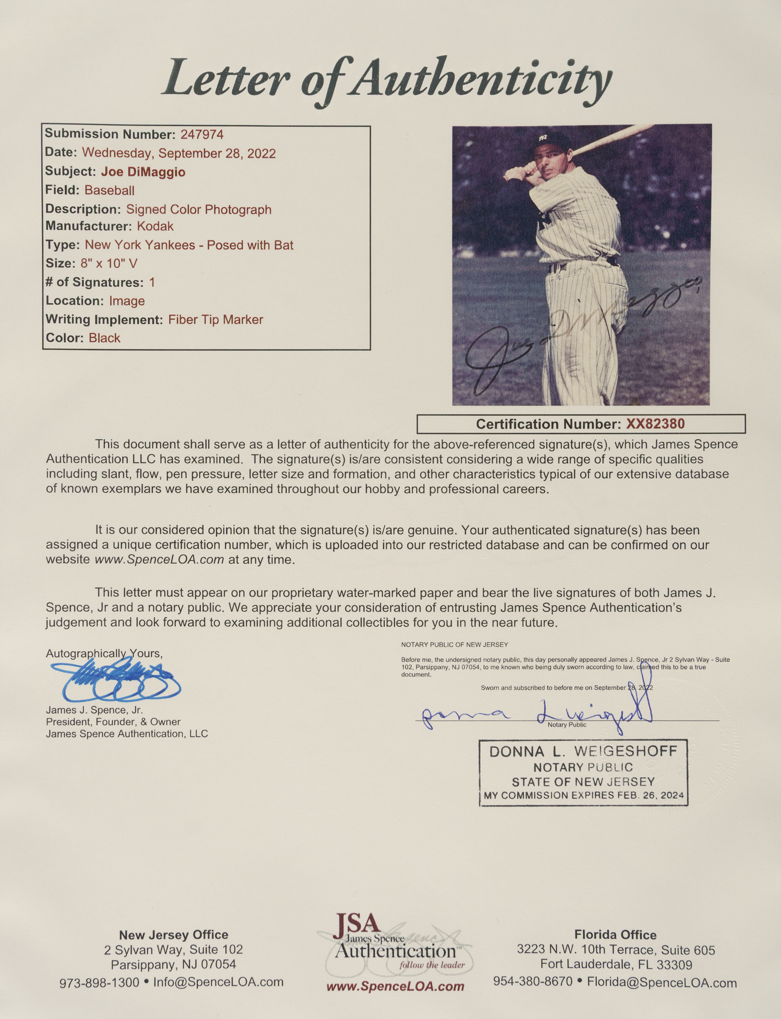 New York Yankees Hall of Famer Joe DiMaggio signed photograph. Total dimensions: 8 x 10 Inches. Full LOA from James Spence/JSA.