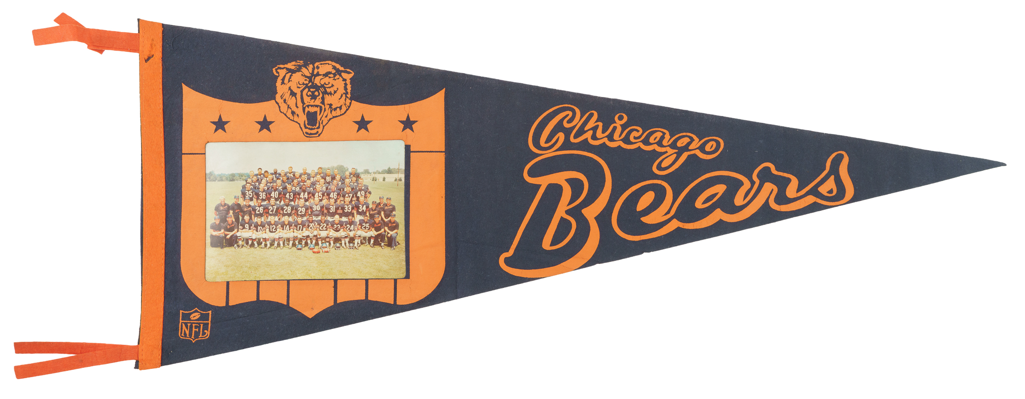 1963 Chicago Bears blue felt pennant. The pennant (29 inches long) is in Good to Very Good condition overall. The size/weight of this item requires that there will be an additional shipping charge for this lot.