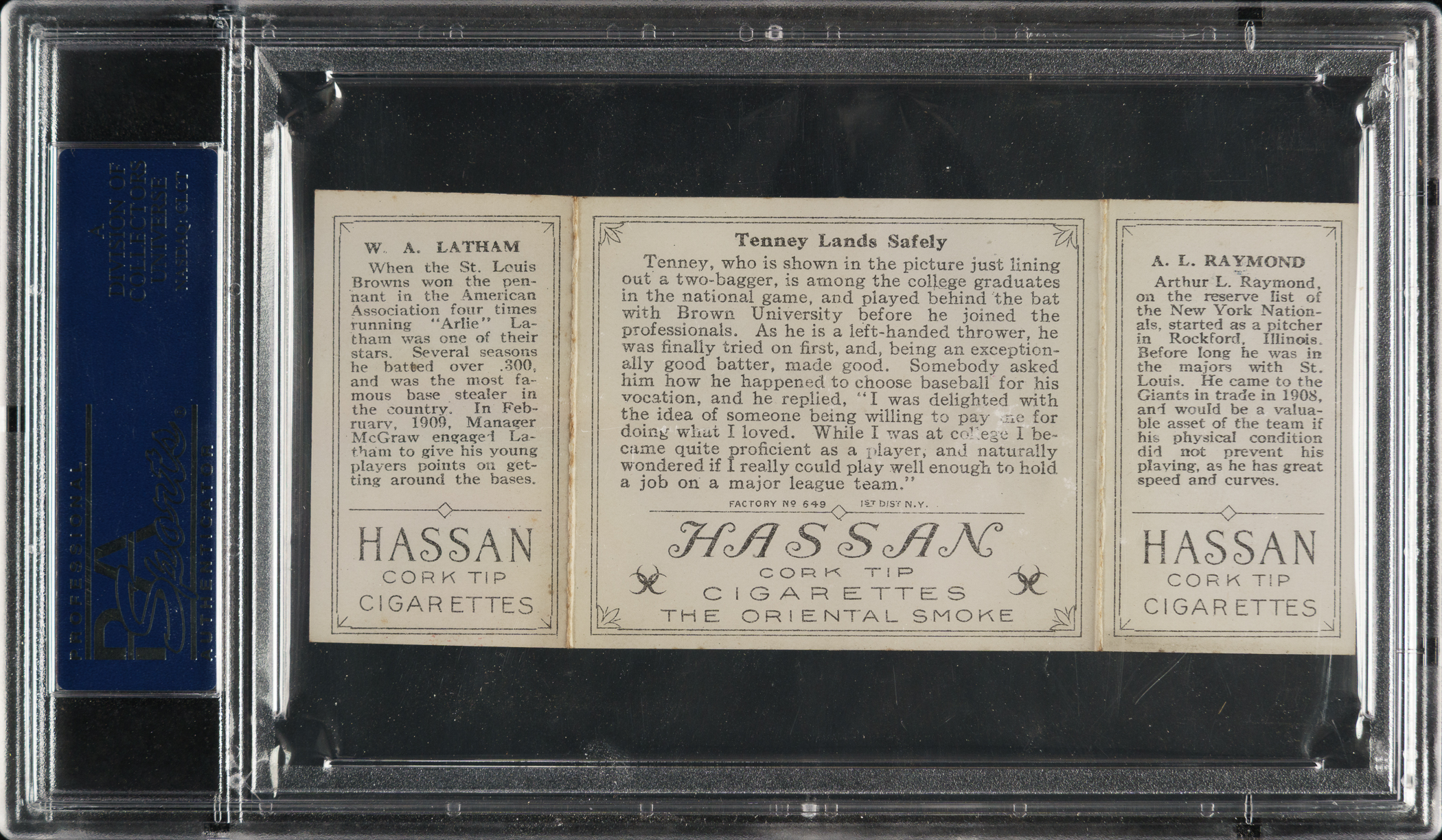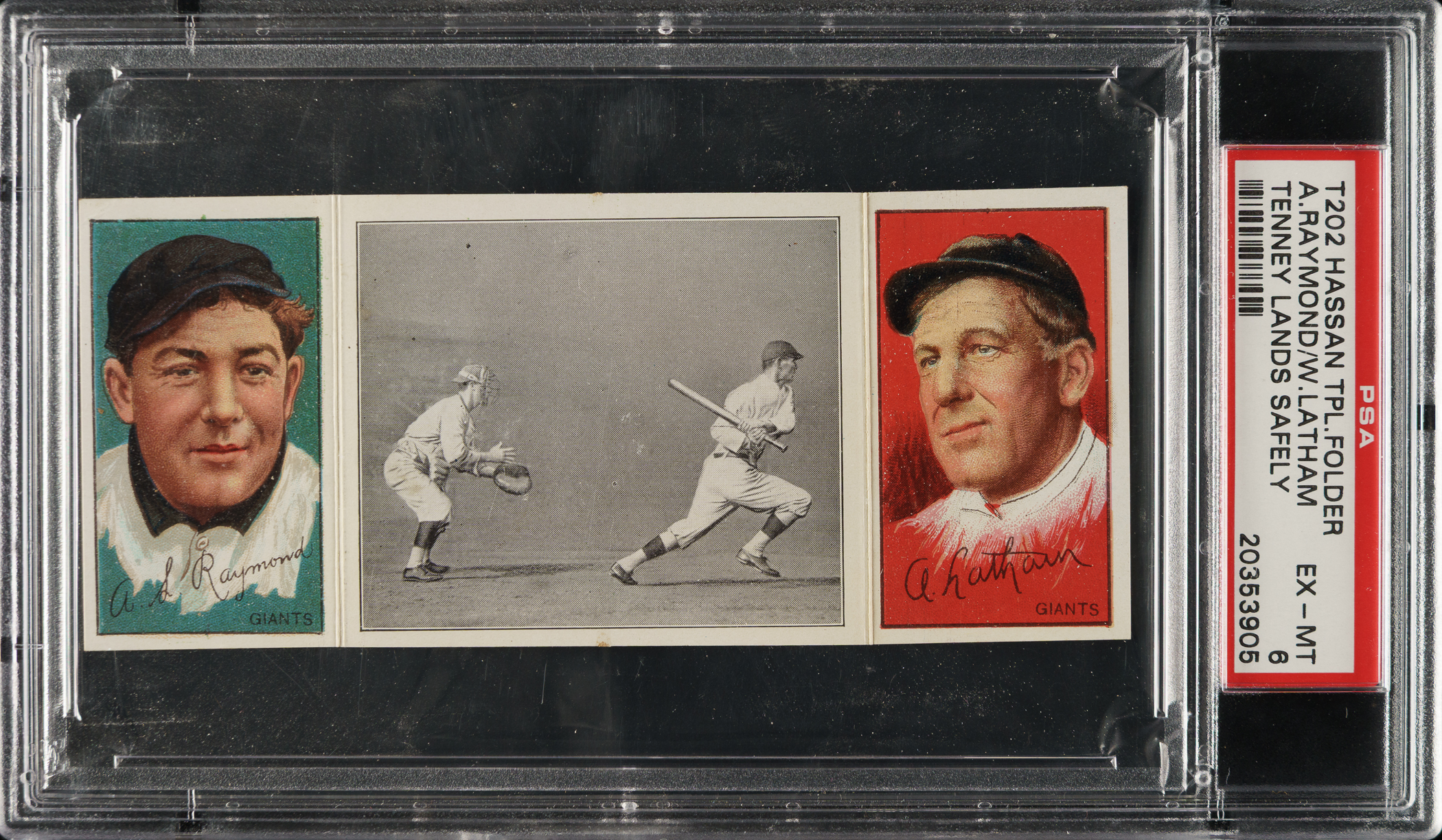 Lot # 888: 1912 T202 Hassan Triple Folder "Tenney Lands Safely" Raymond/Latham PSA EX-MT 6