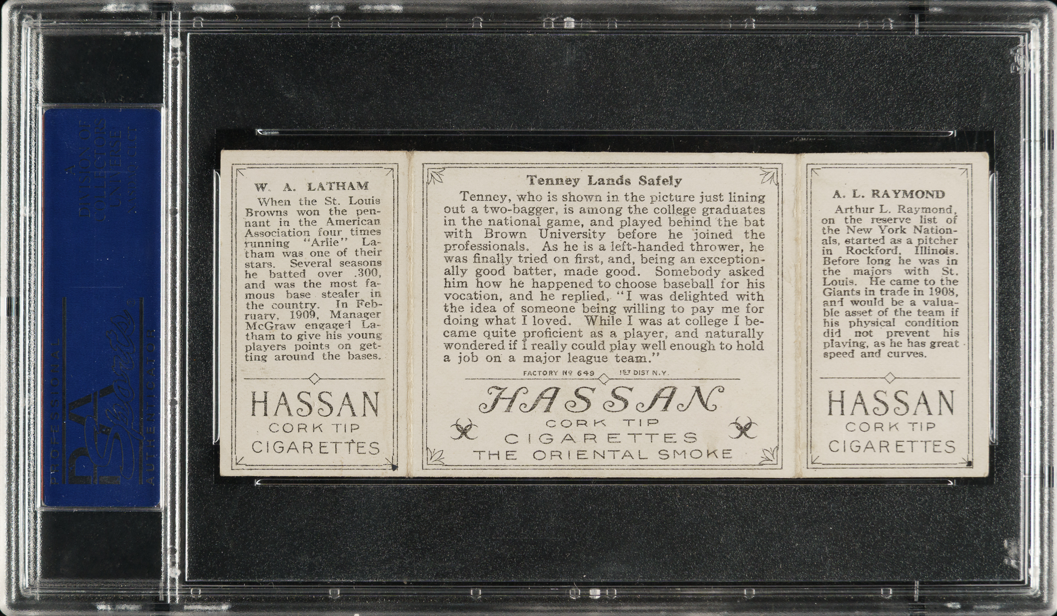 Lot # 889: 1912 T202 Hassan Triple Folder "Tenney Lands Safely" Raymond/Latham PSA VG-EX 4