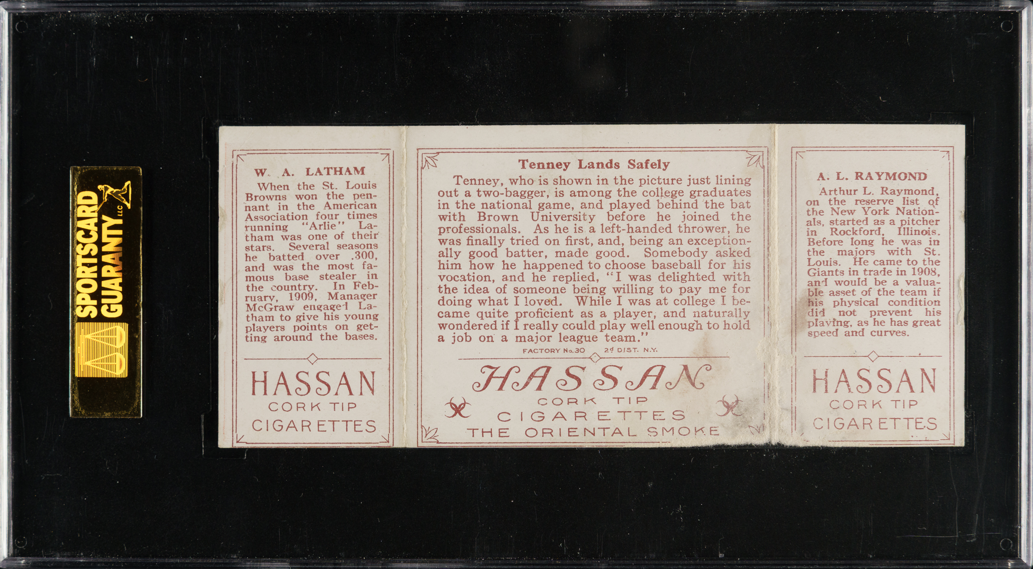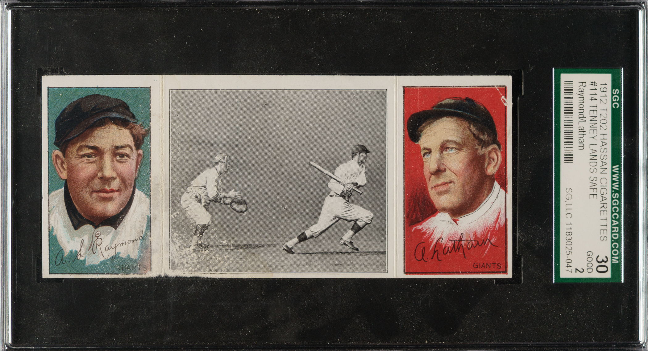 Lot # 890: 1912 T202 Hassan Triple Folder "Tenney Lands Safely" Raymond/Latham SGC GOOD 30
