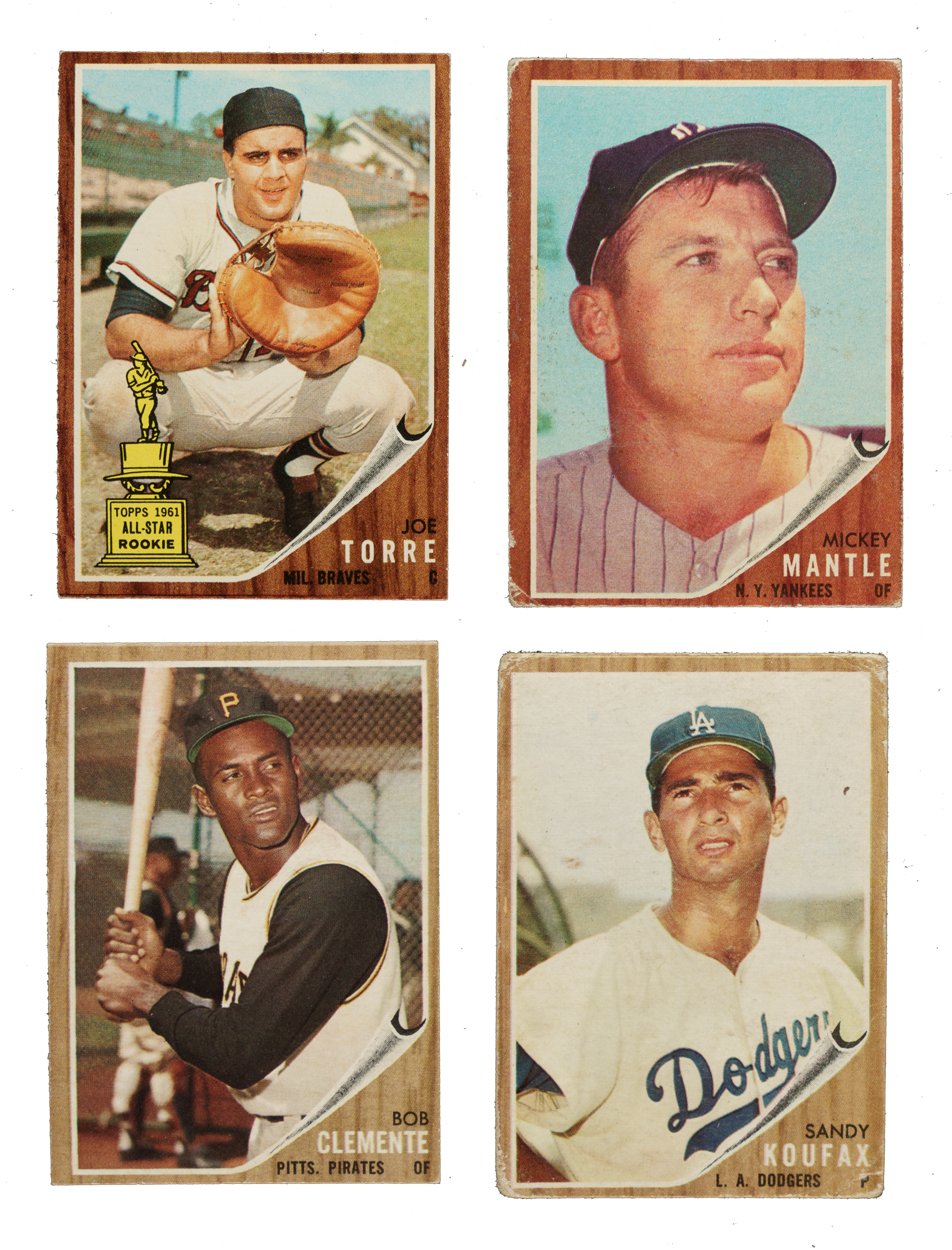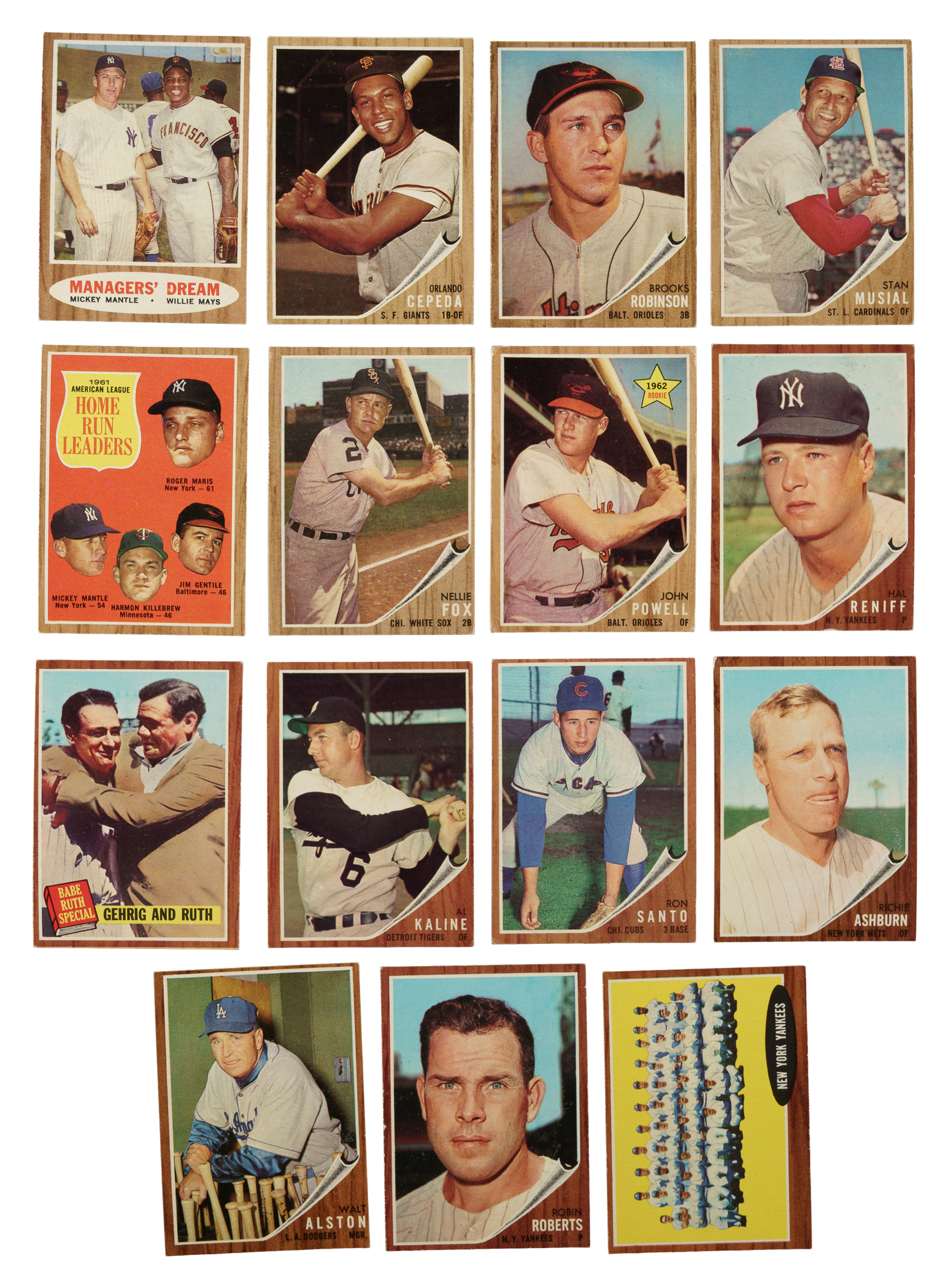 Presented is a very attractive and mostly mid-grade collection of 193 different 1962 Topps baseball cards, highlighted by Mickey Mantle, Roberto Clemente, and Sandy Koufax. Includes both variations of #116 and 192. Condition ranges from Vg to Ex-Mt (averaging Vg-Ex/Ex), with approximately 5% lesser and a few Nr/Mt. Keys: #5 Koufax (Fr), 10 Clemente (Vg-Ex), 18 Manager's Dream (Ex), 20 Colavito, 40 Cepeda (Vg-Ex+), 45 B. Robinson (Ex-Mt), 50 Musial (Vg-Ex), 52 NL Batting Ldrs, 53 AL HR Ldrs (Vg-Ex), 73 Fox (Ex), 99 Powell RC (Gd), seven #135-144 Ruth Specials, 139a Reniff/portrait (Vg-Ex), 140 Gehrig/Ruth (Ex), 150 Kaline (Ex), 170 Santo (Ex), 200 Mantle (pen impressions [but no ink] on surface, otherwise Gd-Vg), 213 Ashburn (Vg-Ex+), 217 Alston (20/80 T/B, otherwise Ex-Mt), 218 Torre RC (Ex-Mt), 234 WS gm. 3 - Maris, 235 WS gm. 4 - Ford, 243 Roberts (Ex), and 251 Yankees Team (Ex+). The collection includes no cards numbered higher than 283. Total: 193 cards. The size/weight of this item requires that there will be an additional shipping charge for this lot.