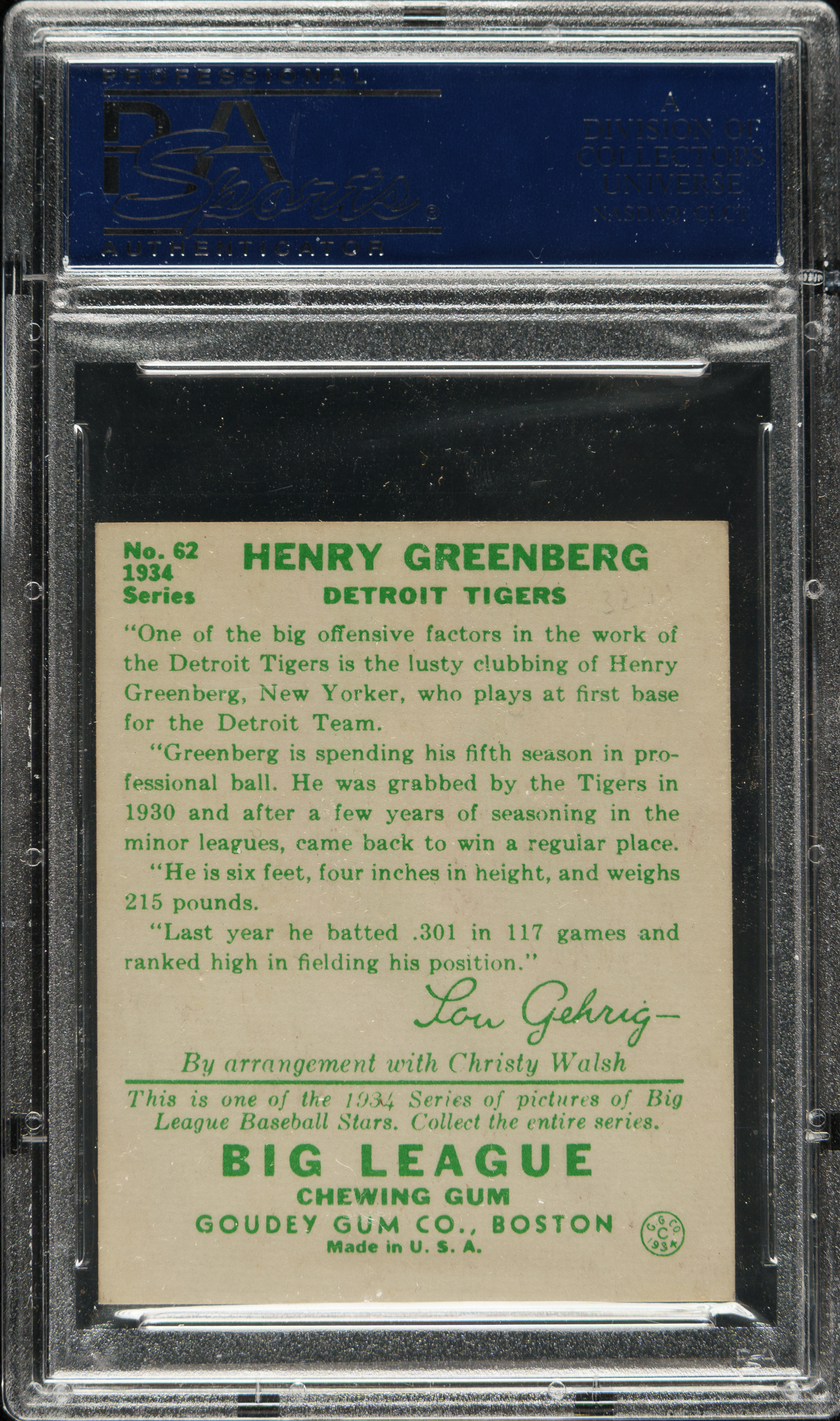 PSA/DNA has encapsulated the card, grading the signature Authentic. Detroit Tigers Hall of Famer Hank Greenberg.