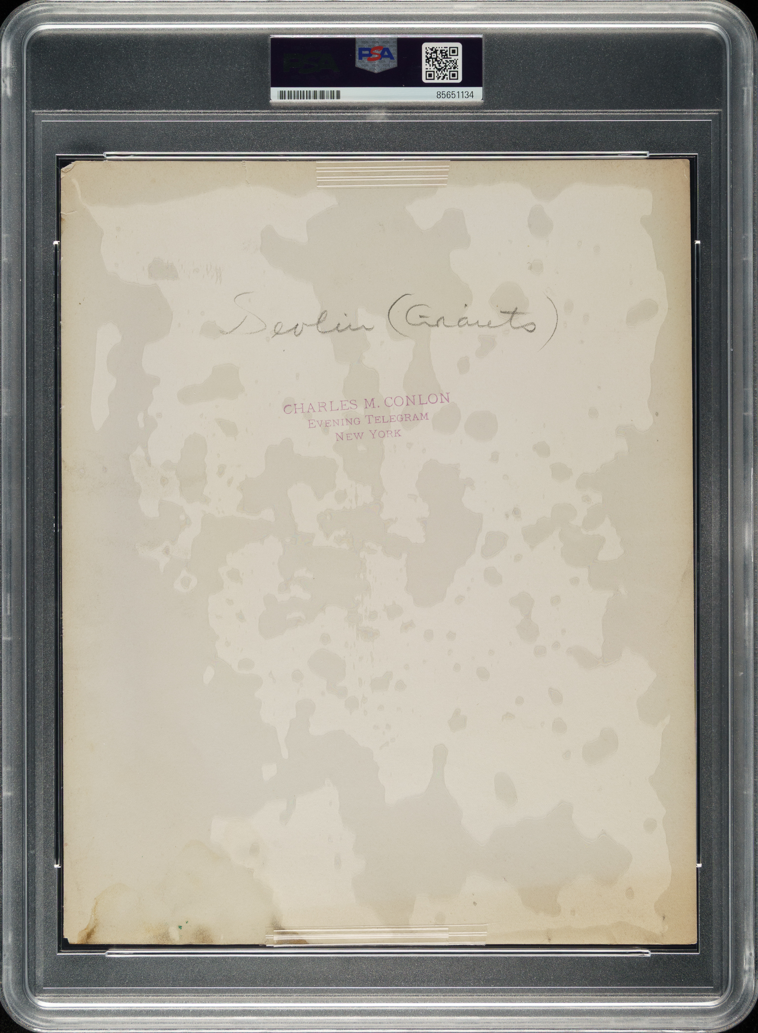 Original photo of third baseman Art Devlin taken by renowned baseball photographer Charles Conlon. Encapsulated and certified as an original Type I Charles Conlon photograph by PSA/DNA. The close-up image captures Devlin in uniform holding a bat as a member of the New York Giants. The reverse bears Conlon's credit stamp and the handwritten notation "Devlin (Giants)." The photo (8 x 10 inches) is in Good condition overall.