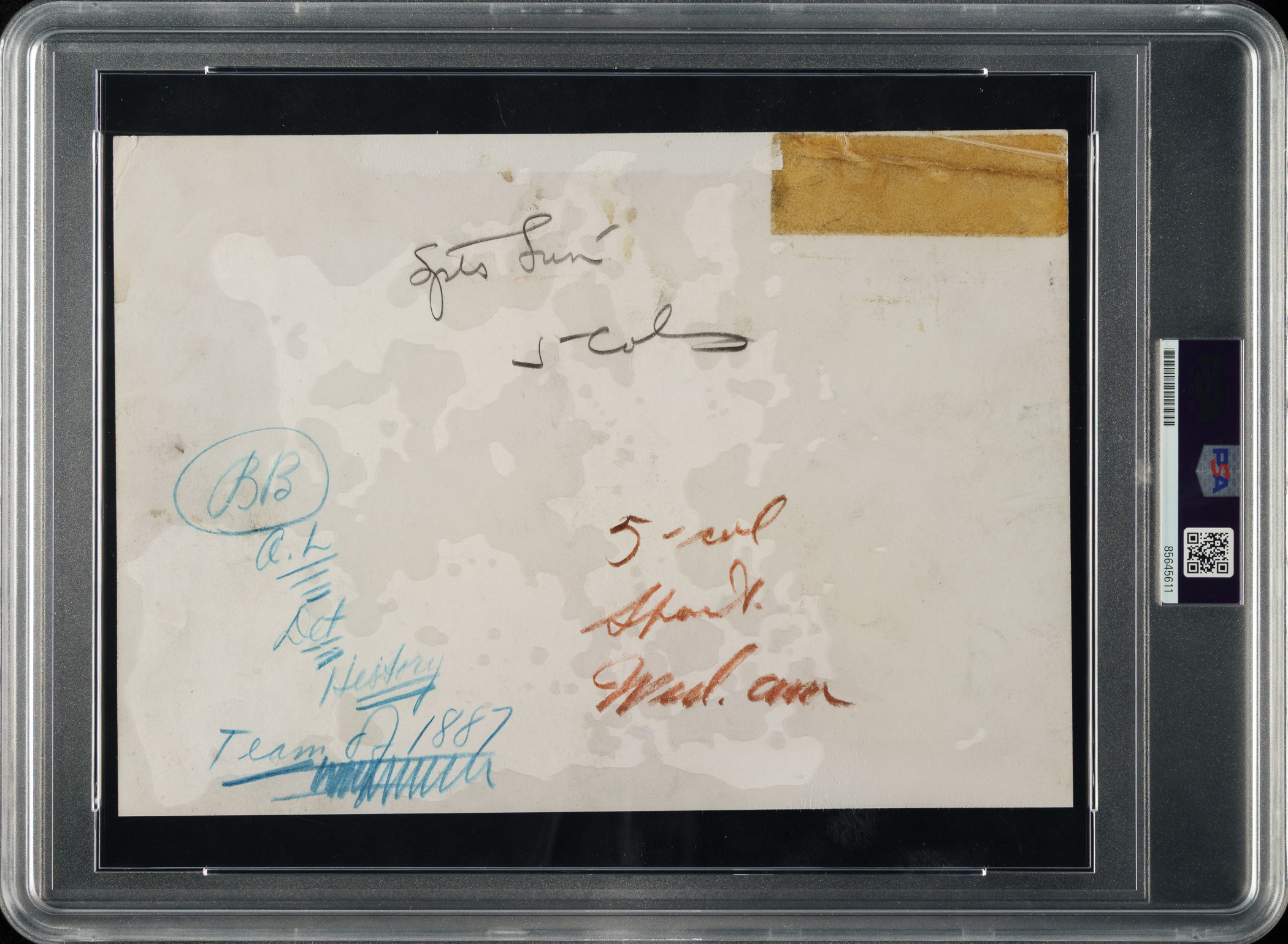Vintage photo capturing 16 members of the 1887 World Champion Detroit Wolverines. Encapsulated and certified as an original Type IV photograph by PSA/DNA. As noted by PSA/DNA, this photo is a "later-issued 1940's example that was made off a duplicate negative featuring an image originally taken by Frank N. Tomlinson in 1887." This is a famous image of the World Champion Wolverines and one that was also used for the club's 1887 N693 Kalamazoo Bats team card. The formal studio photo pictures Watkins (mgr.), Brouthers, Hanlon, Thompson, White, Baldwin, Bennett, Briody, Dunlap, Ganzel, Getzien, Richardson, Rowe, Shindle, Twitchell, and Wiedman. The reverse displays multiple editorial notations. The photo, which has been trimmed to its current dimensions of 7 x 9.75 inches, is in Fair condition overall.