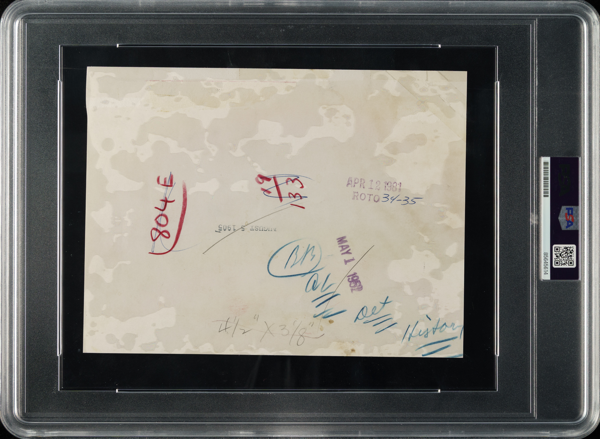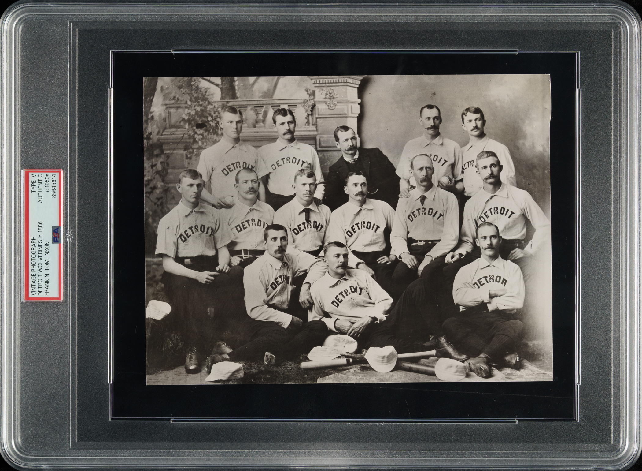Vintage photo capturing 14 members of the 1886 Detroit Wolverines. Encapsulated and certified as an original Type IV photograph by PSA/DNA. As noted by PSA/DNA, this photo is a "later-issued 1950's example that was made off a duplicate negative featuring an image originally taken by Frank N. Tomlinson in 1886. Note that 1905 stamp date on reverse is incorrect as the photo was made in the 1950s." The formal studio photo pictures Watkins (mgr.), Thompson, Brouthers, Hanlon, White, Bennett, Baldwin, Richardson, Crane, Twitchell, Hall, Getzien, Manning, and Rowe. The reverse features multiple date stamps and editorial notations. The photo, which has been trimmed to its current dimensions of 6.25 x 8.25 inches, is in Very Good to Excellent condition overall.