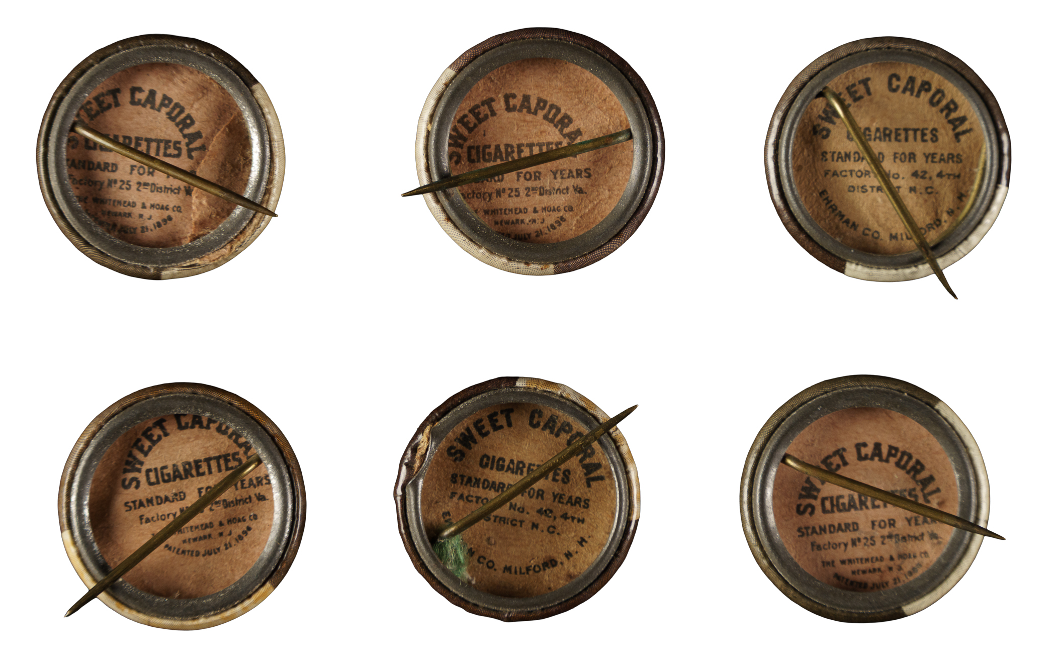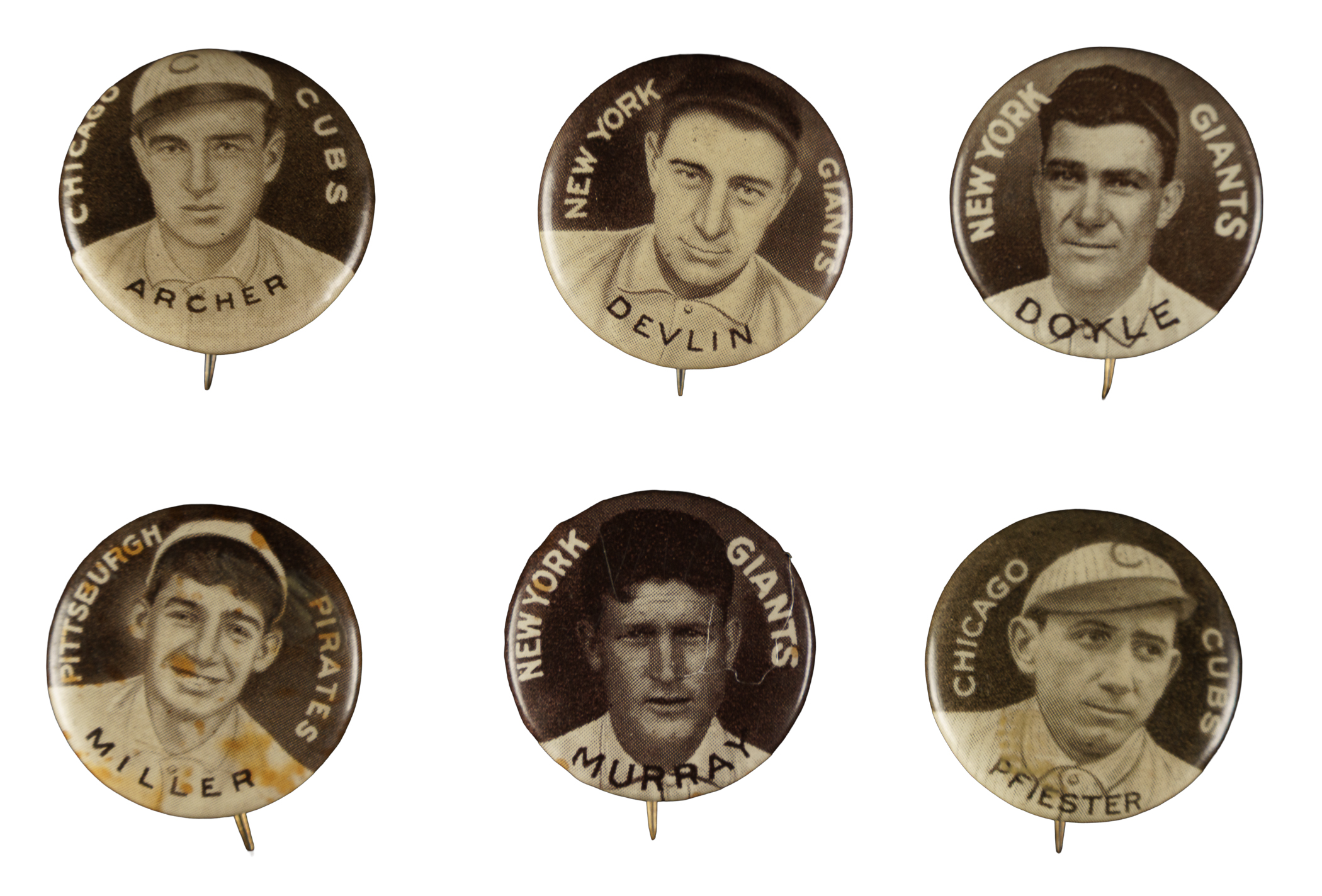 Collection of six 1910-1912 P2 Sweet Caporal Pins. Condition is Excellent overall, with normal toning and oxidation on the reverse paper and rims. Miller displays light foxing on the front. This collection consists of the following: Archer/small letters, Devlin, Doyle/large letters, Miller, Murray/large letters, and Pfiester. Total: 6 pins.