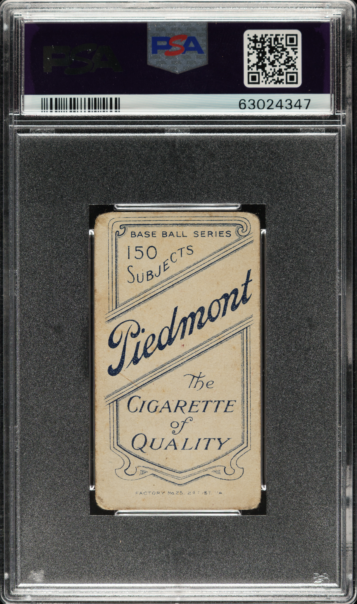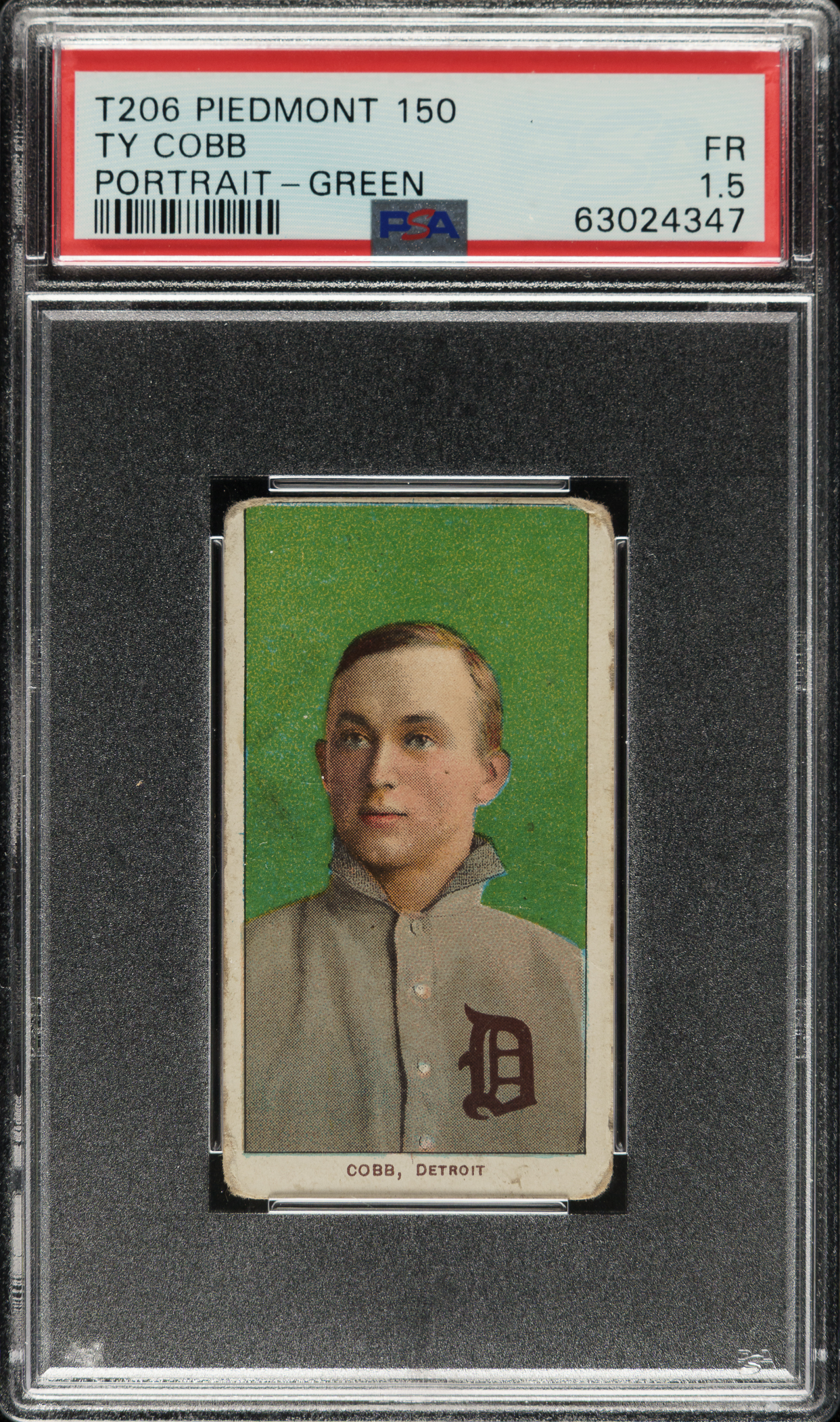 Graded FAIR 1.5 by PSA. Modestly graded example of this classic tobacco card of Detroit Tigers Hall of Famer Ty Cobb. The green-background portrait pose is the rarest of the four poses of Cobb in the T206 set. This example has a brilliant green background and a strong image of Cobb. Piedmont 150/25 advertising reverse. Downgraded due to a number of condition issues including rounded corners, light soiling, and centering toward the extreme top. This is a pleasing example of one of the key cards in the premier tobacco issue of the 1910 era.