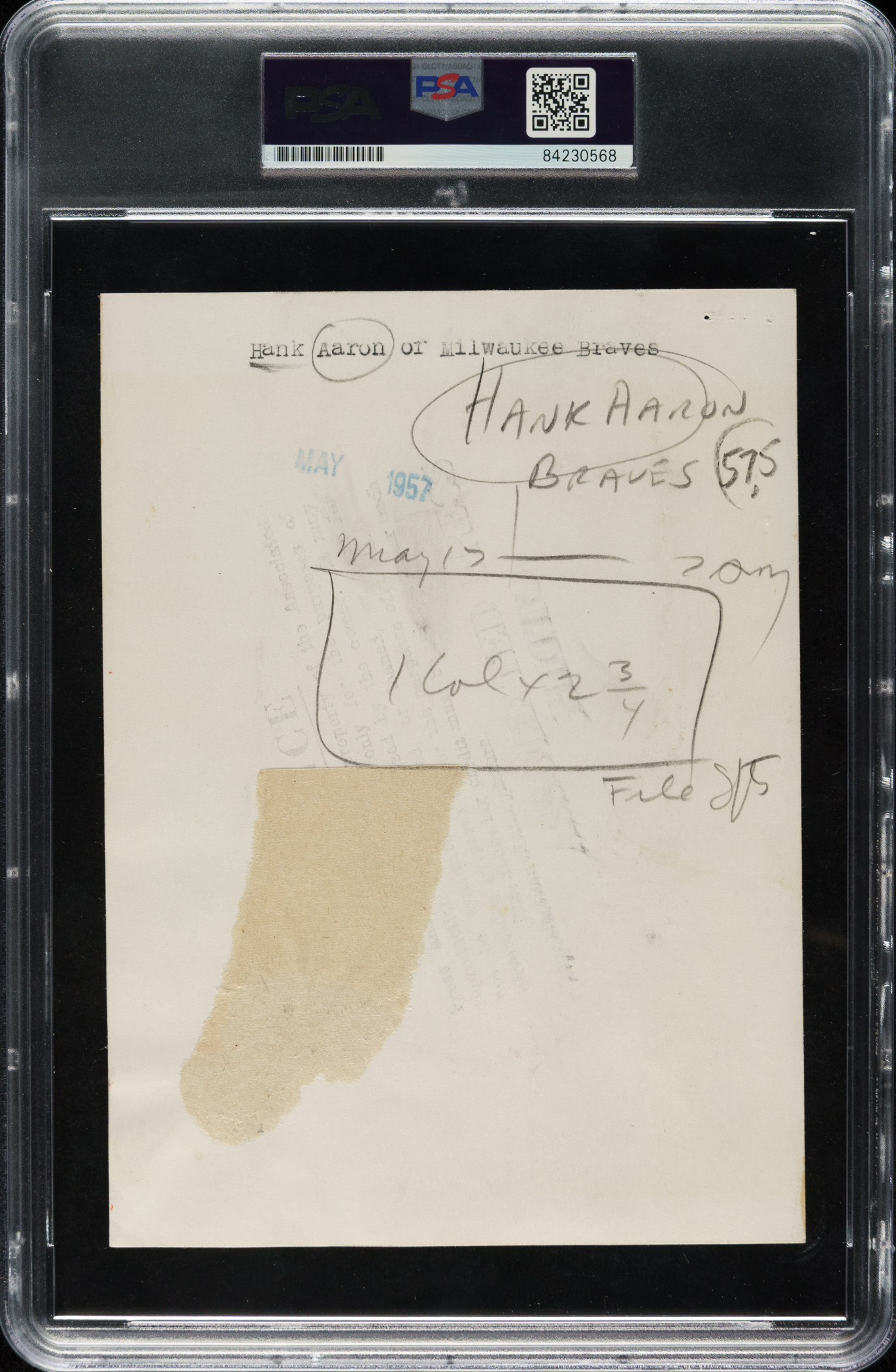 Original news photo of Hank Aaron as a member of the Milwaukee Braves in 1957. Encapsulated and certified as an original Type I photograph by PSA/DNA. The reverse bears a credit stamp for the "Associated Press", a "May 1957" date stamp, several editorial notations, and the typed caption "Hank Aaron of Milwaukee Braves." The photo (5 x 7 inches) displays a pair of tack holes along the top left border and a few small creases. Very Good condition overall.