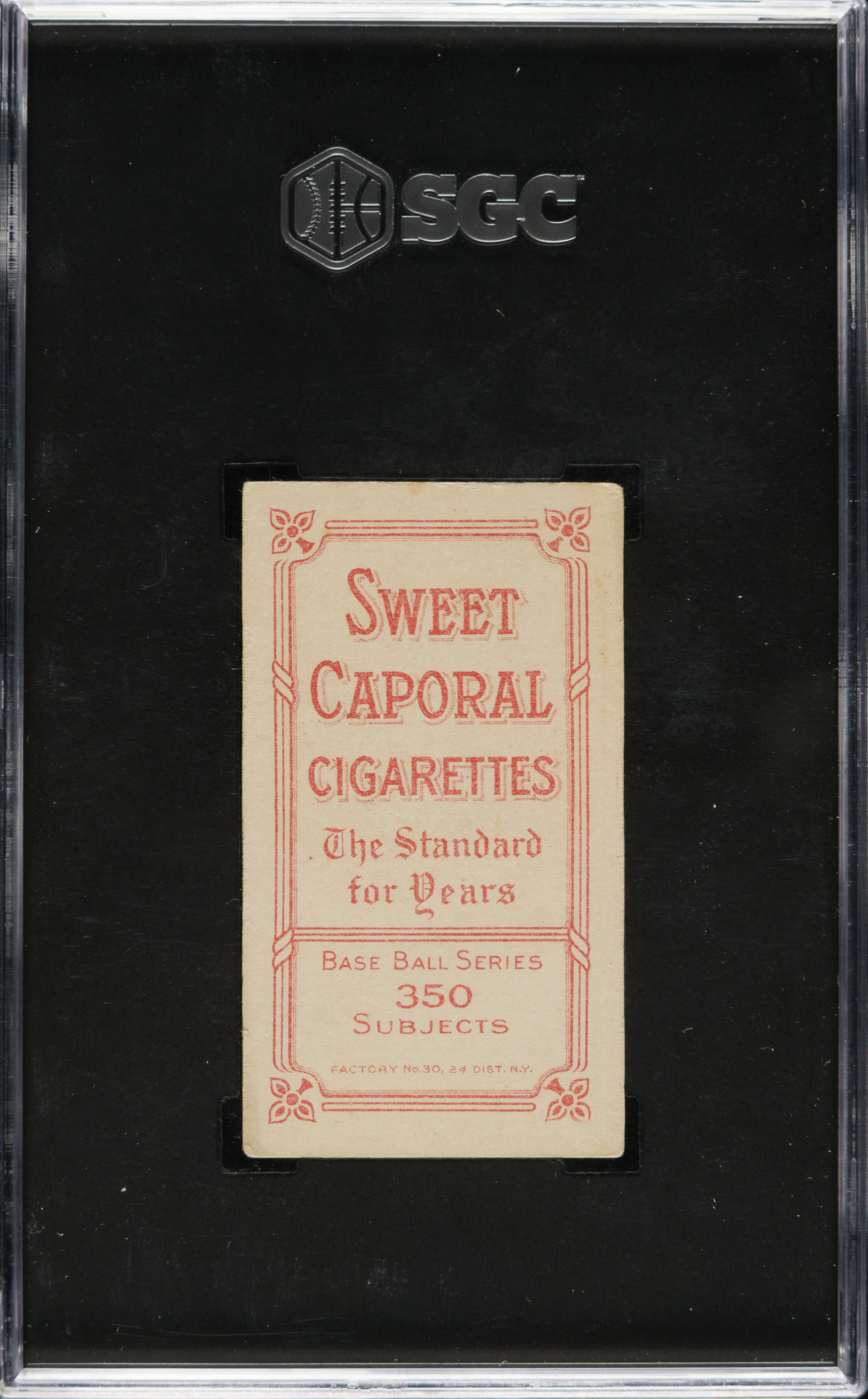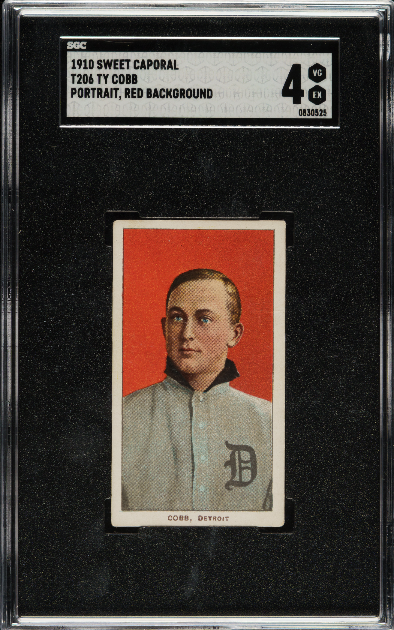 Graded VG/EX 4 by SGC. Outstanding mid-grade example of one of Detroit Tigers Hall of Famers Ty Cobb's iconic cards. The red-background pose has long been considered one of the classics of the T206 set and of all vintage cards. This well-centered example features a brilliant red background, outstanding registration, and even corner wear. Boldly printed Sweet Caporal 350/30 advertising reverse. There are a few small wrinkles along the front noted for accuracy. The red-background Cobb portrait is one of the key cards of the set, and this example would be a highlight in any high-quality T206, Hall of Famer, or Ty Cobb card collection.