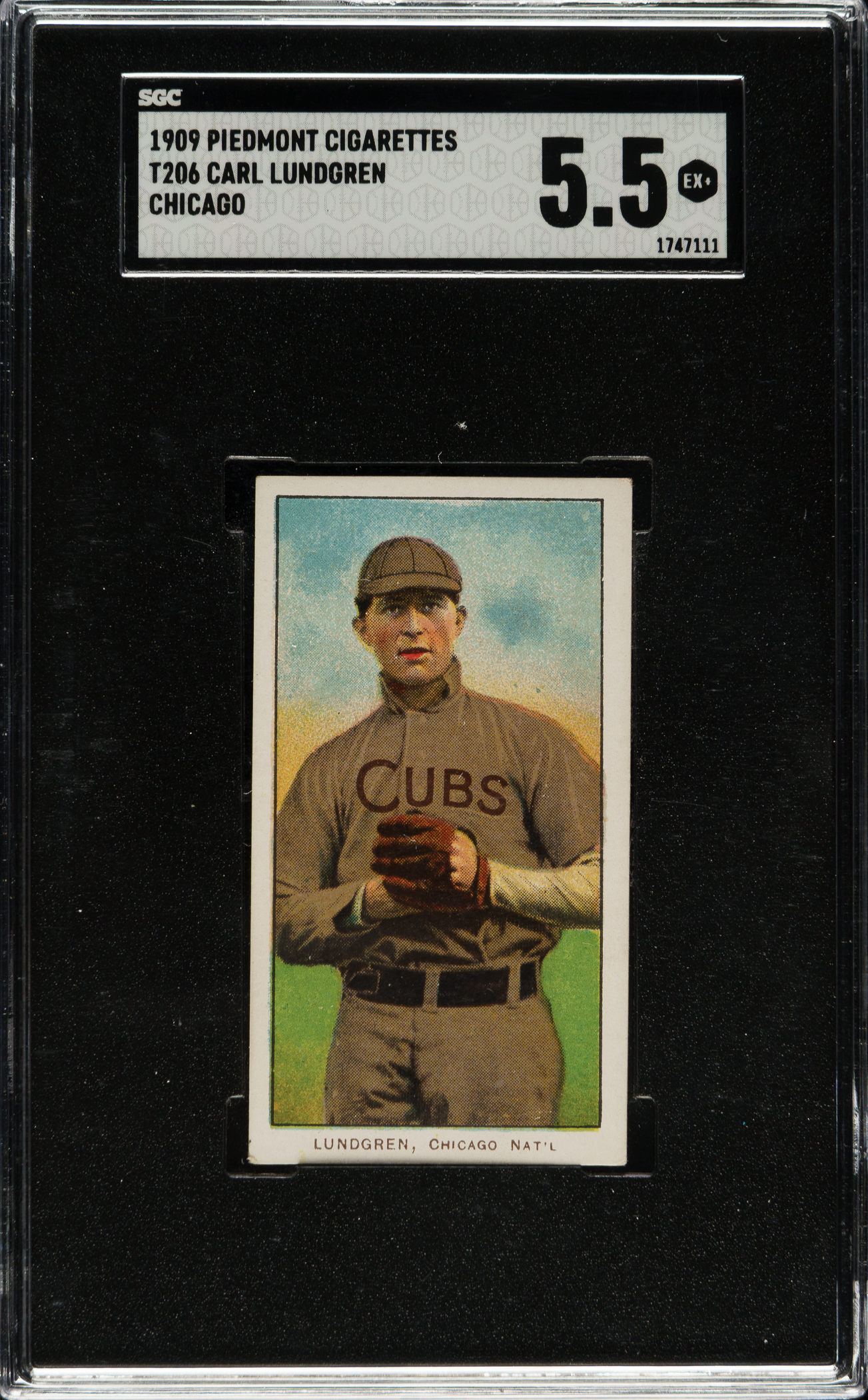 Graded EX+ 5.5 by SGC. Since the days of Jefferson Burdick, this Chicago team-designation variation of Carl Lundgren has been recognized as one of the important rarities of the T206 set. This well-centered card has beautiful colors, outstanding registration, and light corner wear. Boldly printed Piedmont 150 advertising reverse. This is a fantastic example of this desirable scarce card from the legendary T206 series.