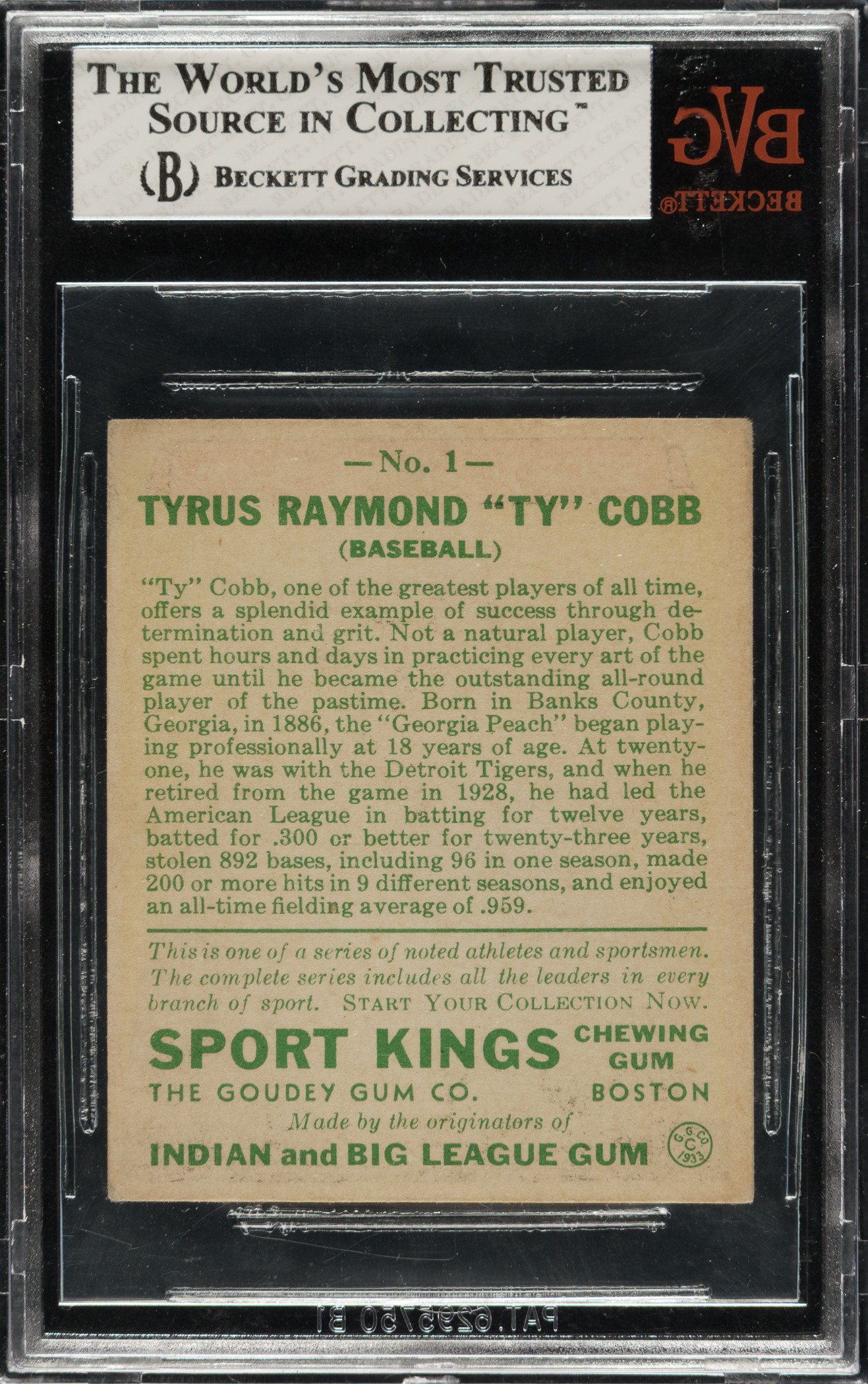 Graded EX 5 by BVG. Mid-grade example of one of Detroit Tigers Hall of Famer Ty Cobb's most sought-after cards. The offered card has a bright yellow background, outstanding registration, and even corner wear. The reverse is clean with bold green print. The Sport Kings is one of Cobb's most popular and majestic cards. Being the No. 1 card in the set, this card gravitated to the top of a stack, exposing it to extra wear and handling, making high-grade examples even more difficult to find than most other Sport Kings and other Cobb cards. This is a strong example of one of Cobb's classic cards.